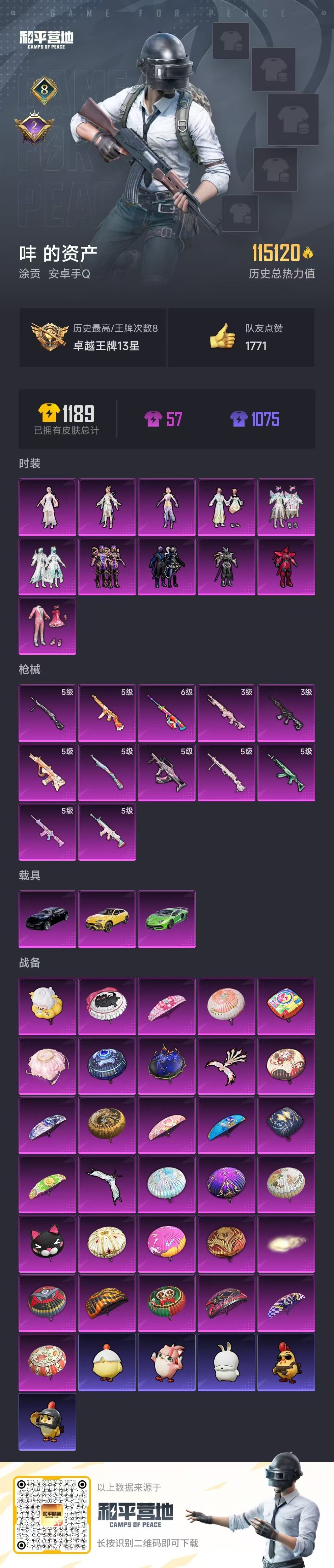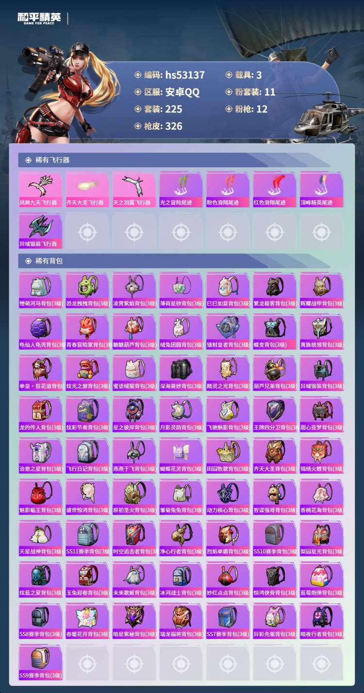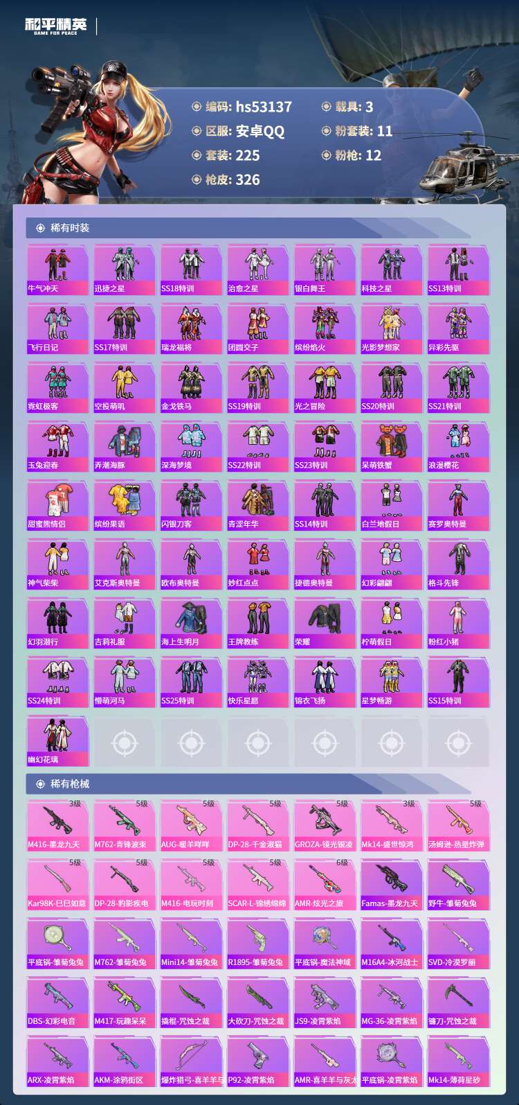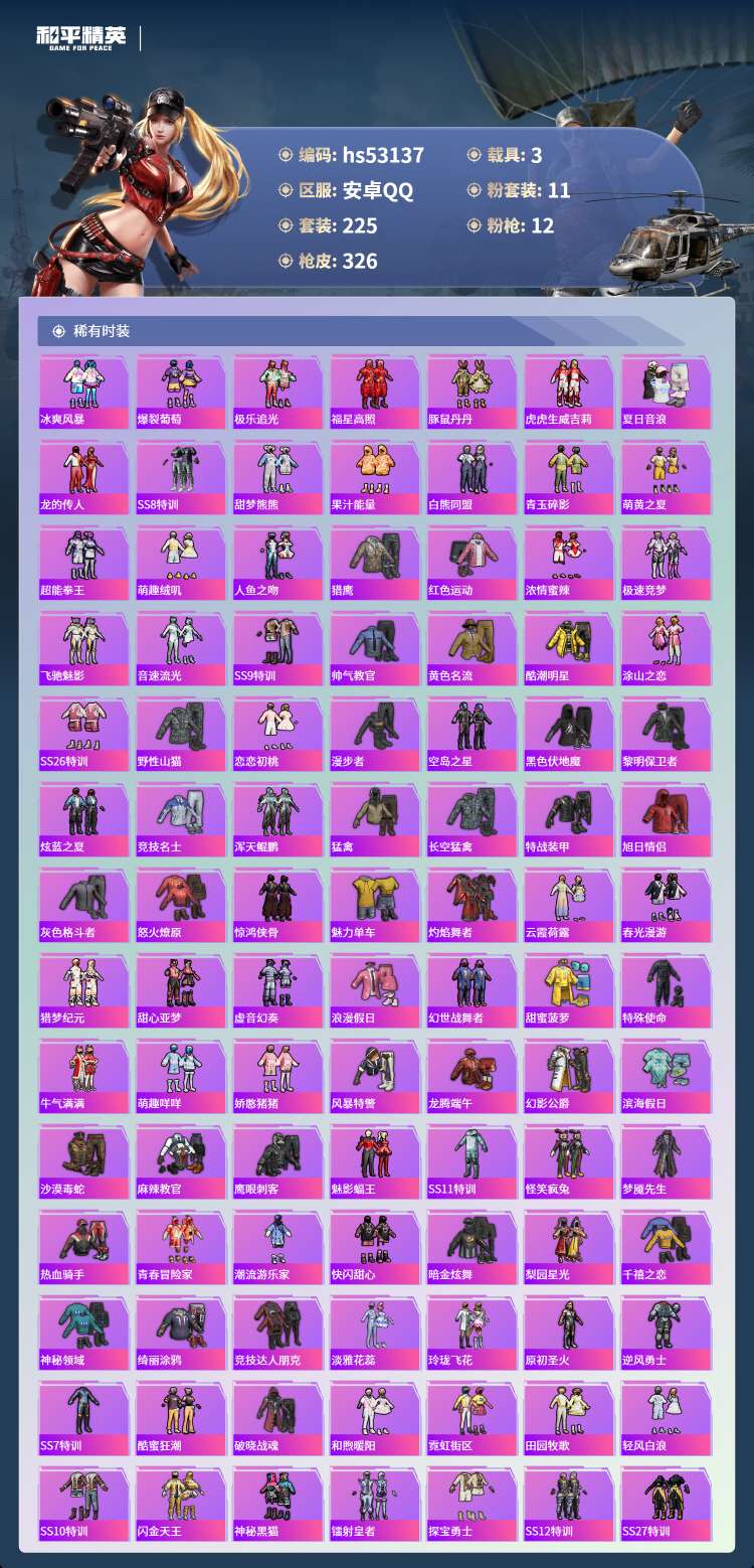 hs53137 安卓手Q-8王牌印记-11粉装-12特效枪-3载具-115120热力值-225套装-