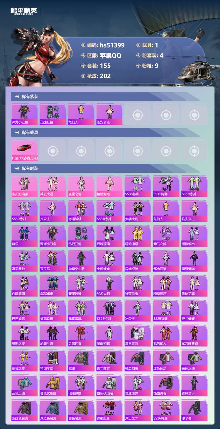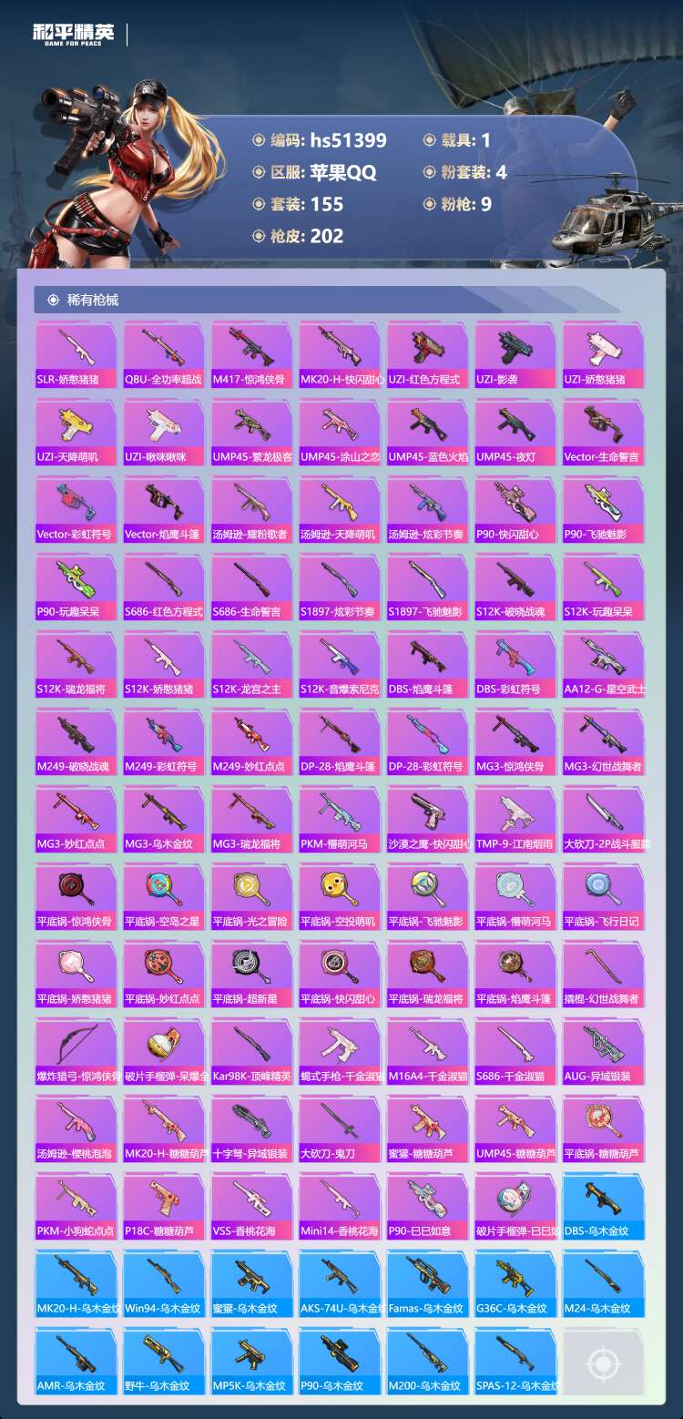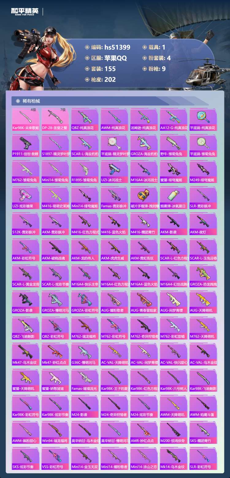 hs51399 苹果手Q-17王牌印记-4粉装-9特效枪-1载具-62443热力值-155套装-20
