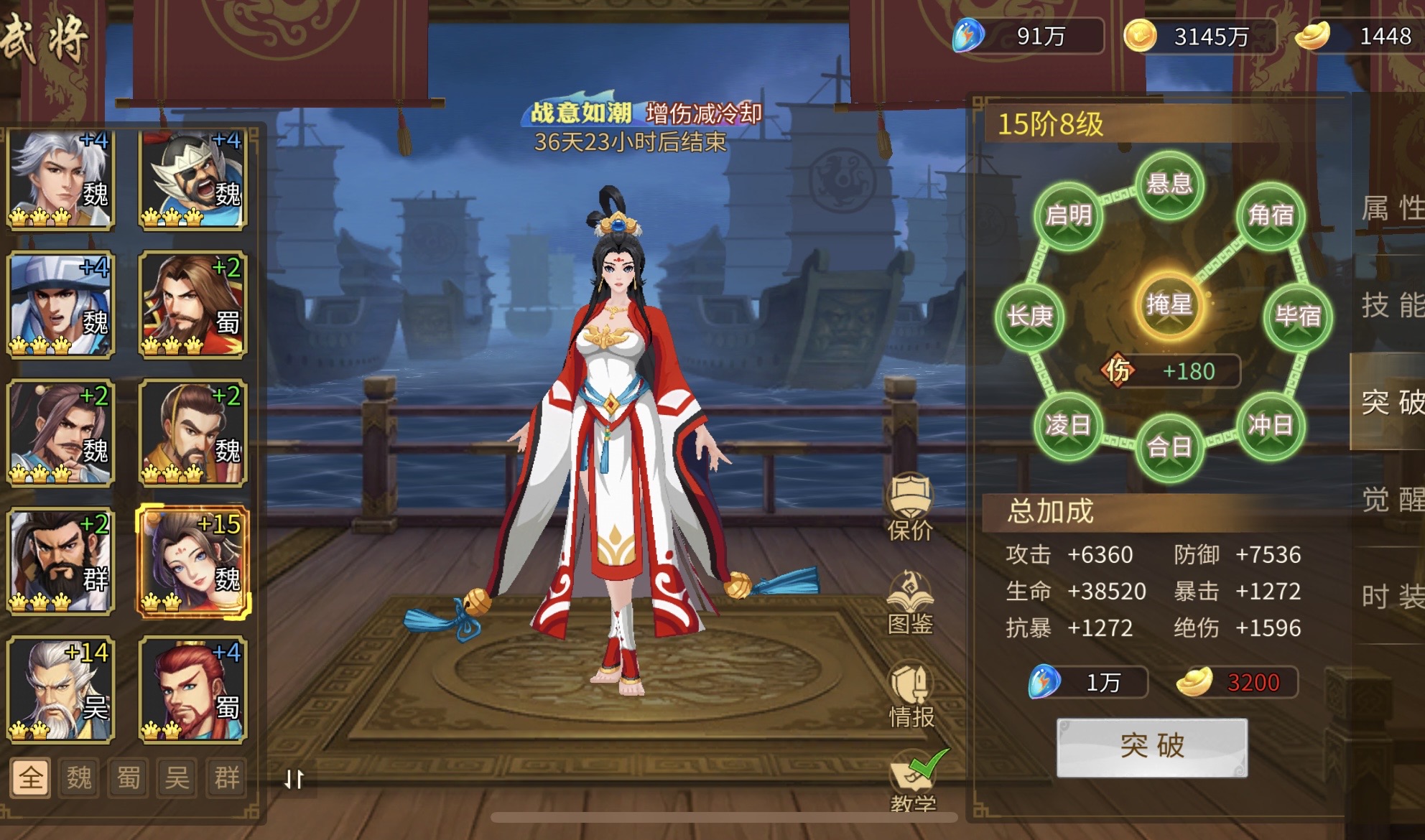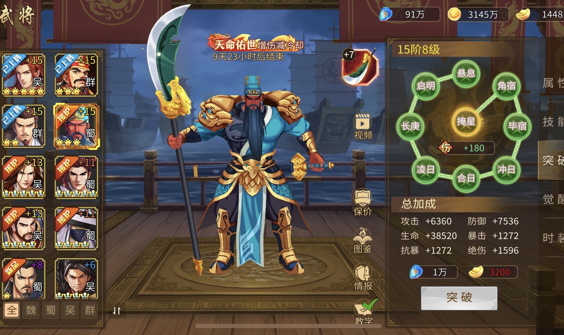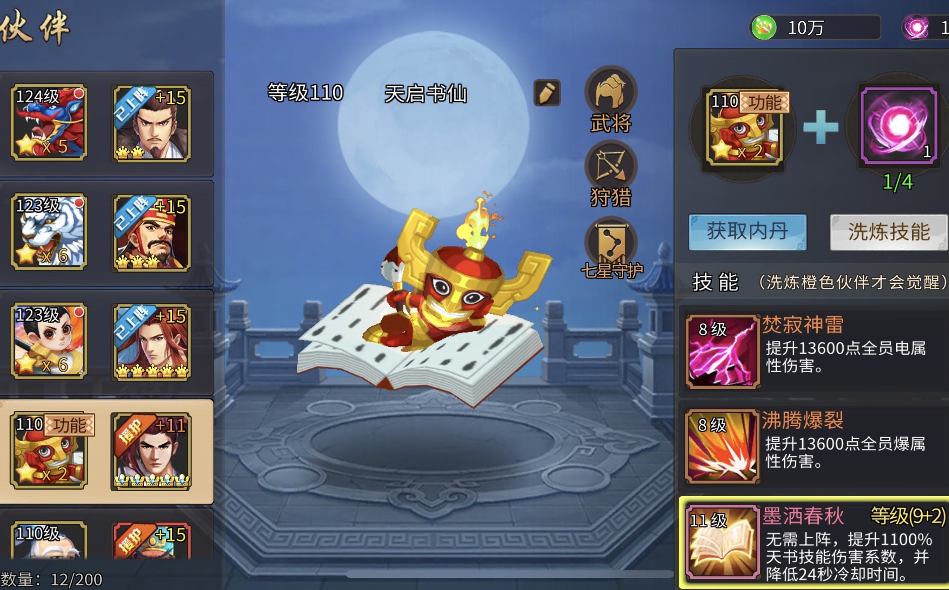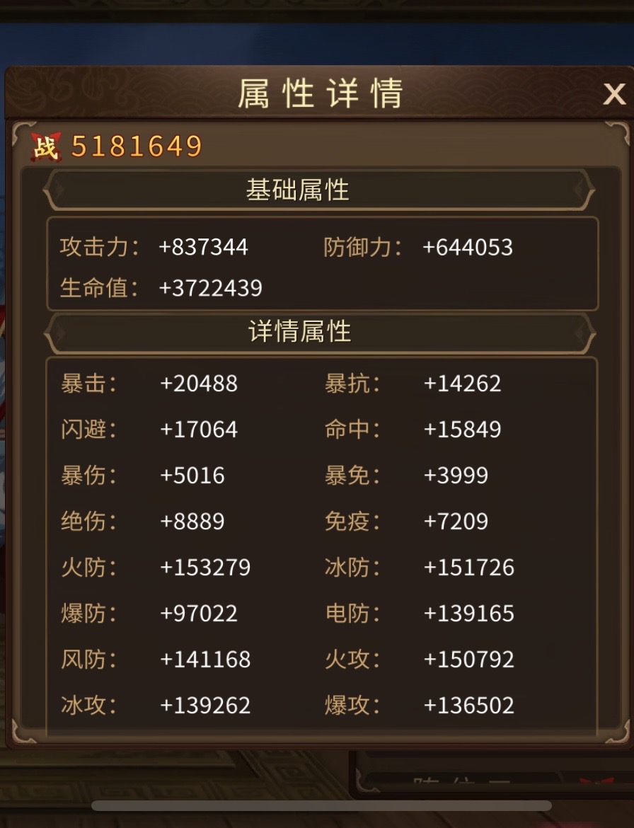 拥有8星天命关羽、法正等全部武将,橙色兵法6-7星、紫色兵法4套9星,兵法多本快升星,天书10星,充值榜第一才能拥有的高分金色祭石有8颗,援军令269万战力、2个10星,总充值110万,今年充值38万