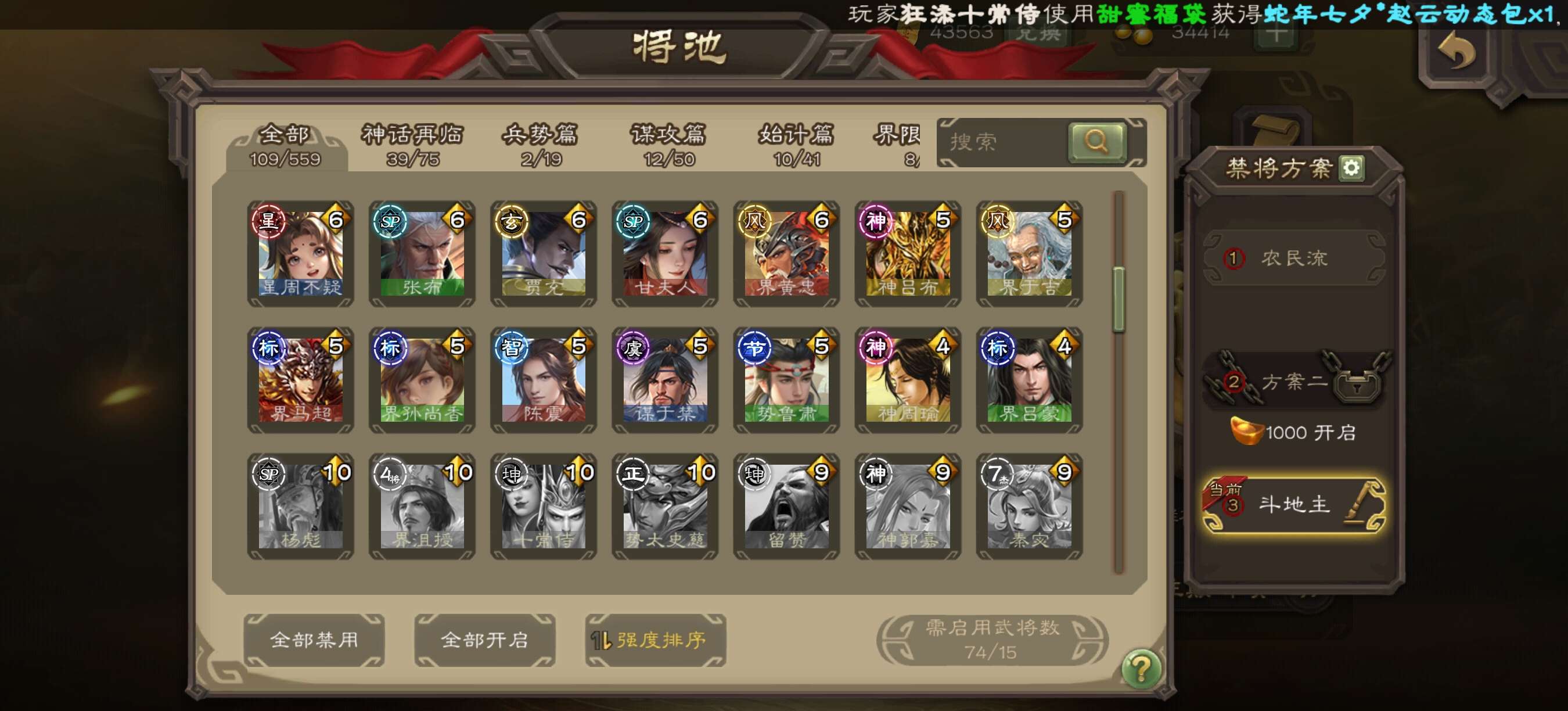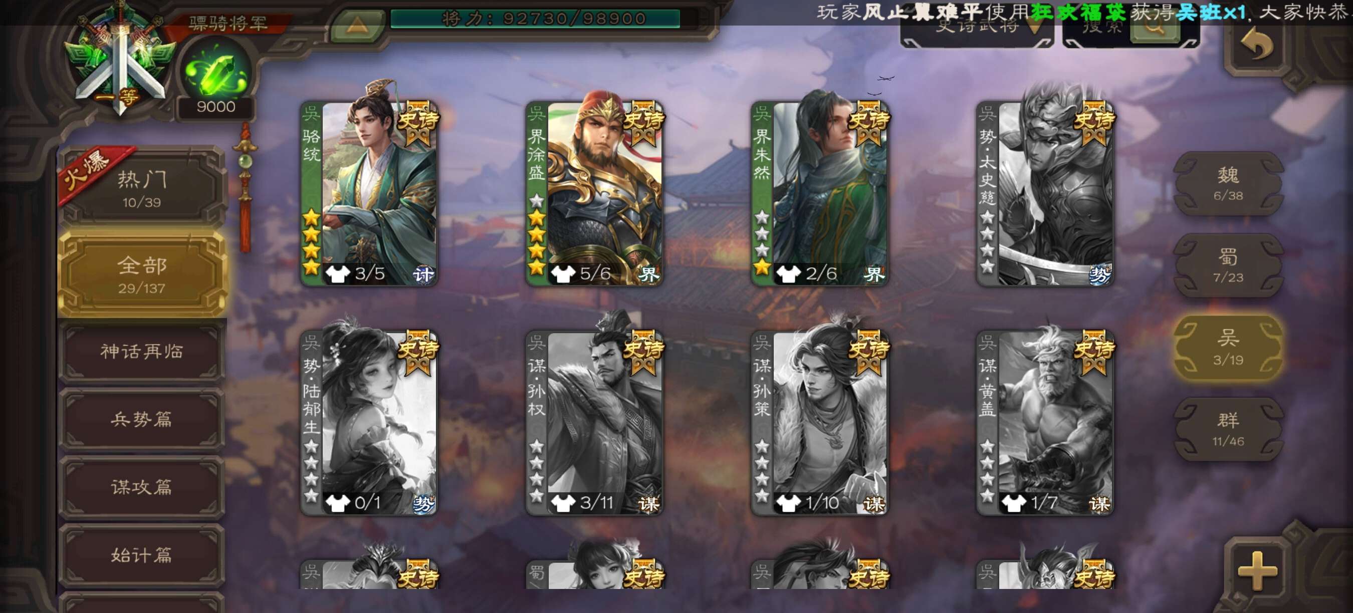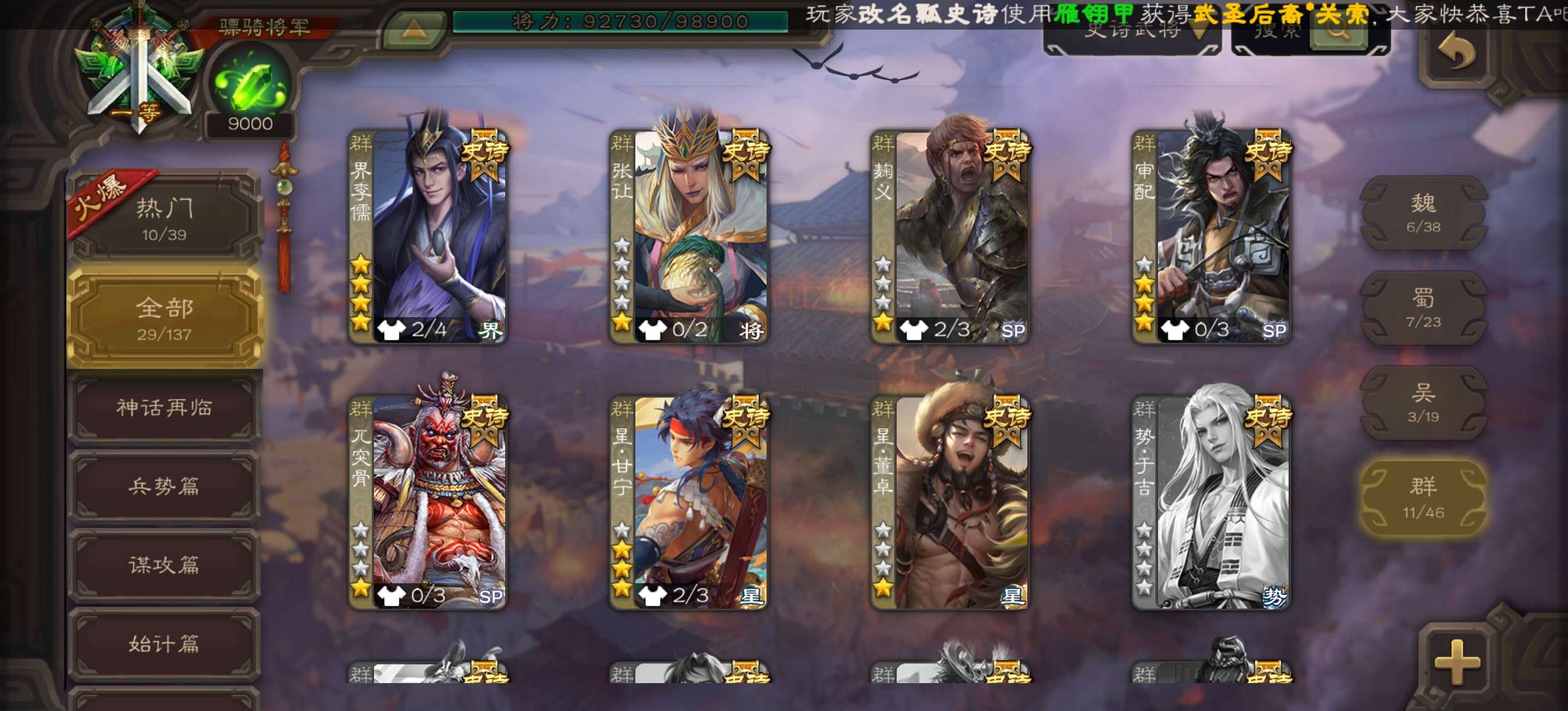 星甘宁界钟会界李儒戏子神赵等强力史诗齐全,秒杀武将齐全,强力天宫有友徐庶势鲁肃谋荀彧等,盒子精品齐全