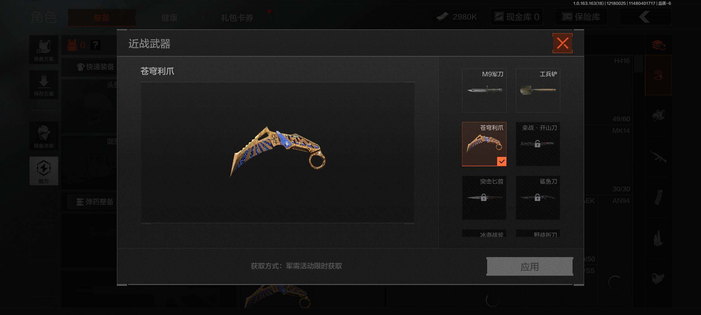 等级:30/段位:暗区传说/仓库价值(百万):5.6/柯恩币:2980000
