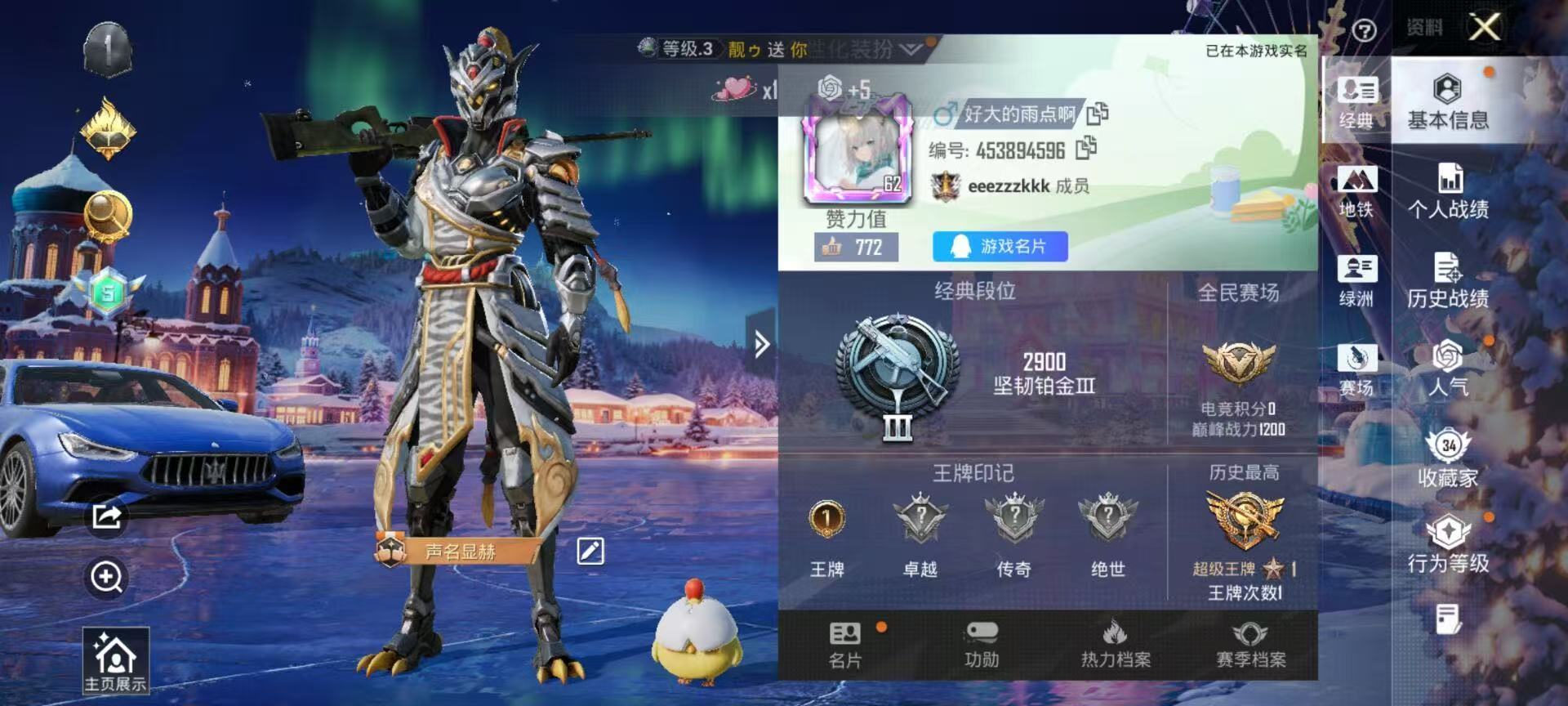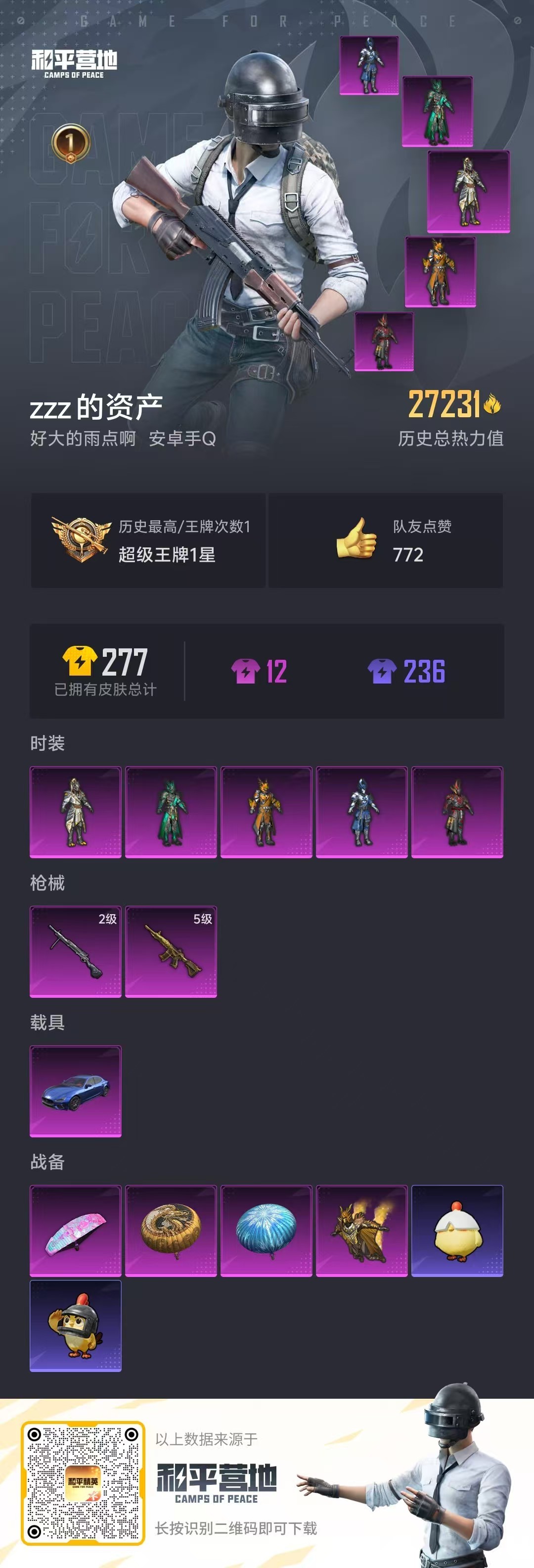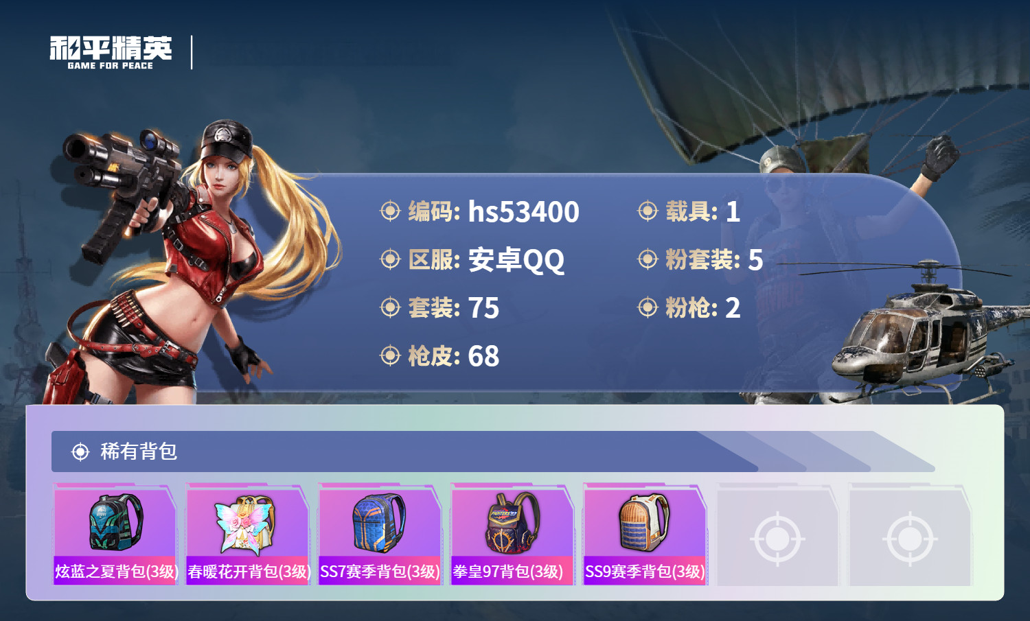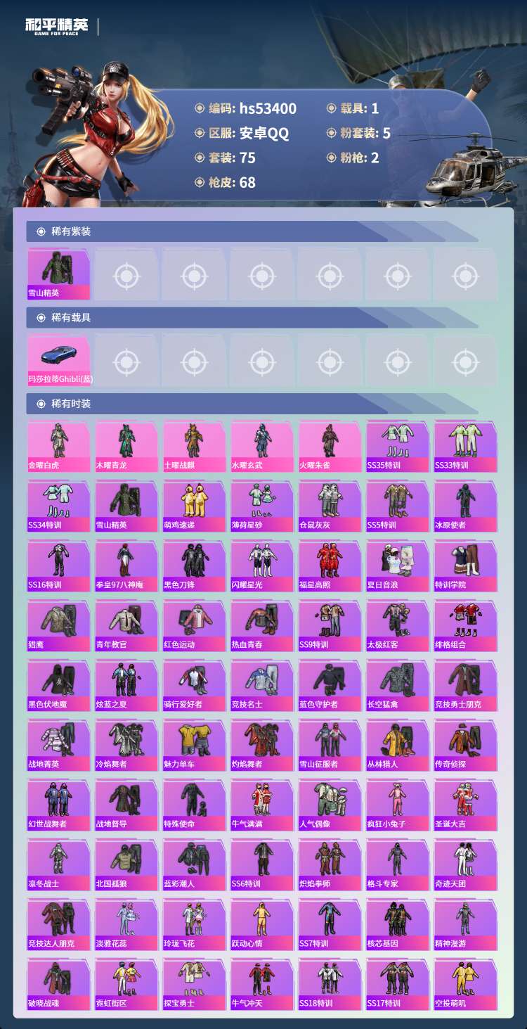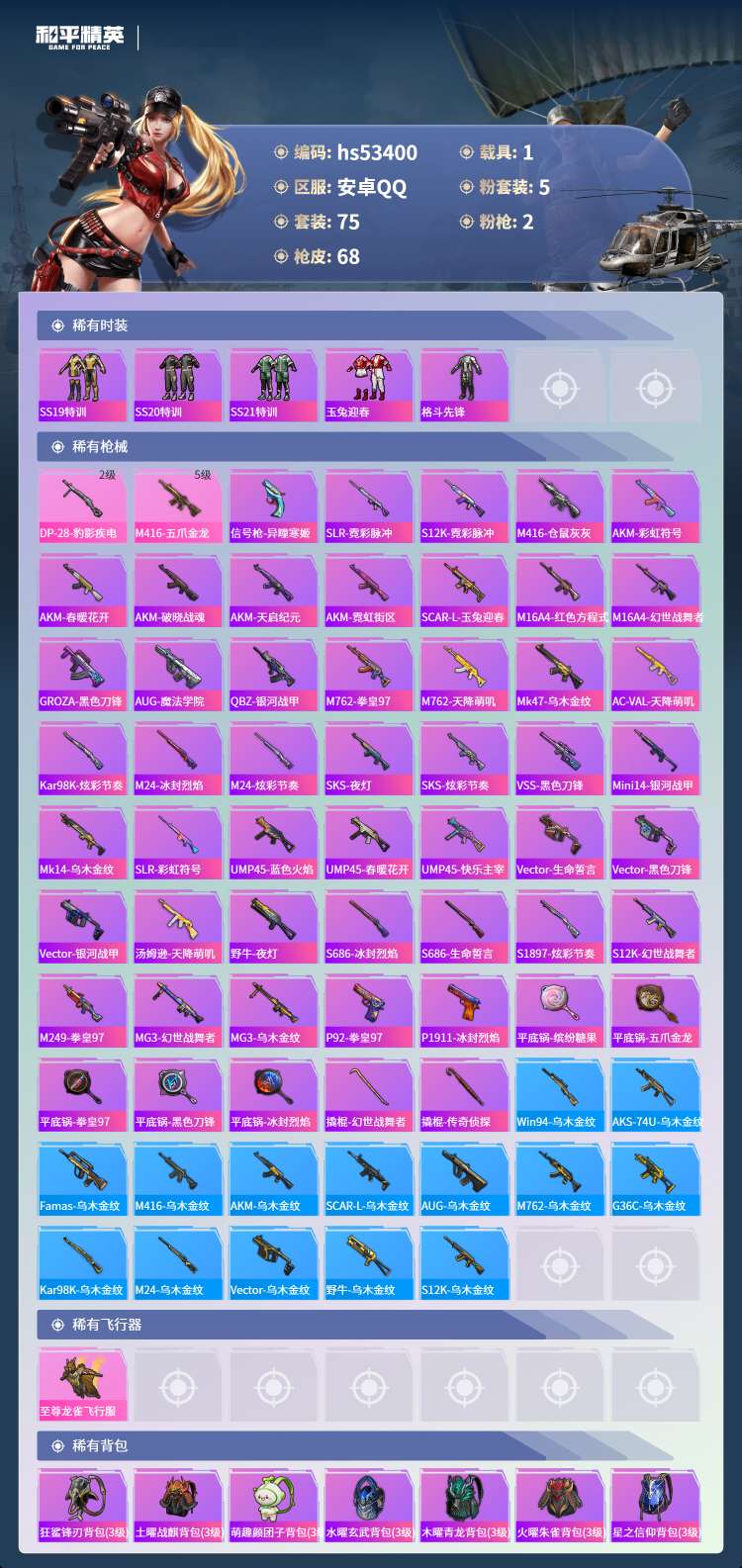 hs53400 安卓手Q-1王牌印记-5粉装-2特效枪-1载具-27231热力值-75套装-68枪皮