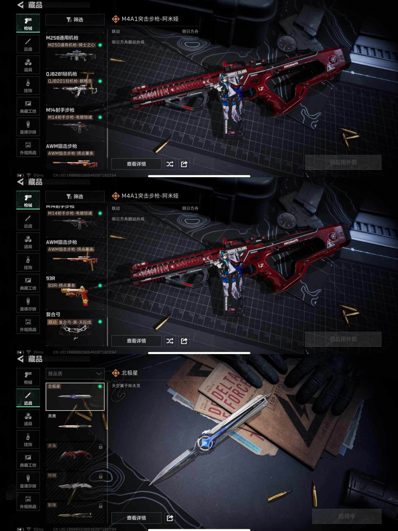 【烽火地带段位】三角洲巅峰【干员皮肤】 露娜-金牌射手 露娜-黑·天际线 红狼-电锯惊魂 蜂医-送葬人·无题密令 深蓝-不破誓约 无名-夜鹰 【近战武器】 黑鹰 北极星 【枪皮】M4A1突击步枪-粉色涂装 M4A1突击步枪-高雅黑 M4A1突击步枪-几何碎片 M4A1突击步枪-海色 M4A1突击步枪-前沿科技 M4A1突击步枪-繁盛 M4A1突击步枪-阿米娅 AKM突击步枪-彩墨喷涂 A