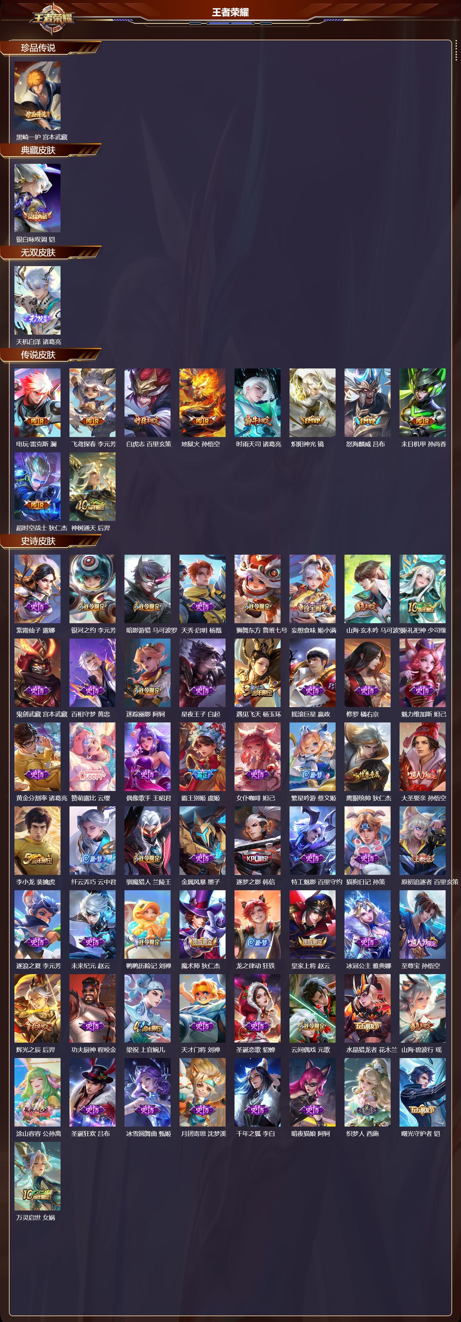 安卓QQ/最强王者/258皮肤/125英雄/1典藏/0珍品无双/1无双/1珍品传说/10传说/67史