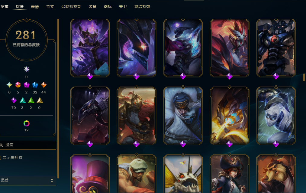 比尔吉沃特 全英雄 皮肤281 终极5 神话2 限定32 传说44 史诗70 炫彩