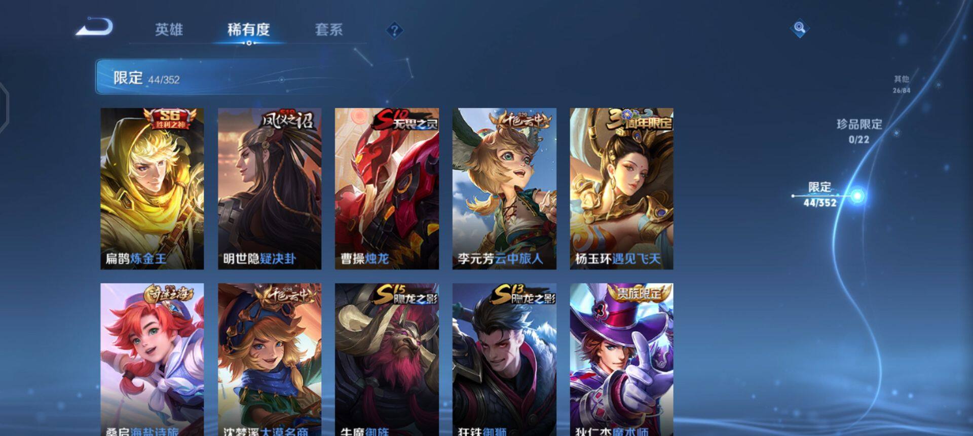 【限定皮肤】:白起狰,狄仁杰阴阳师,虞姬凯尔特女王,赵云皇家上将,鲁班七号狮舞东方,扁鹊炼金王,芈月重明,元歌无心,夏侯惇朔风刀,甄姬游园惊