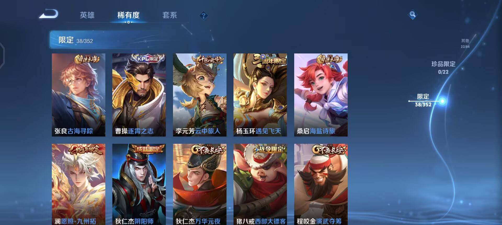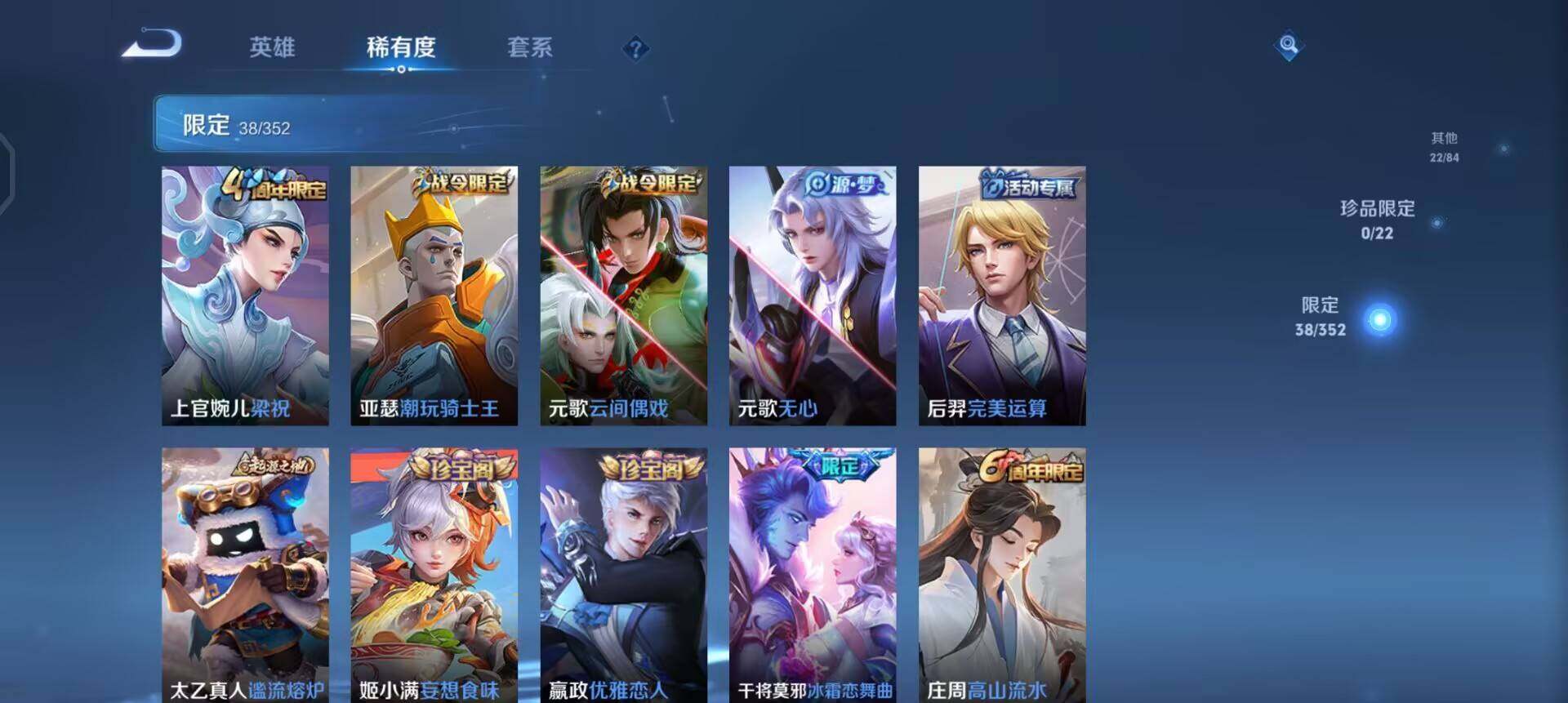 【限定皮肤】:狄仁杰阴阳师,赵云皇家上将,嬴政优雅恋人,庄周高山流水,元歌云间偶戏,元歌无心,狄仁杰万华元夜,达摩星际陆战队,项羽