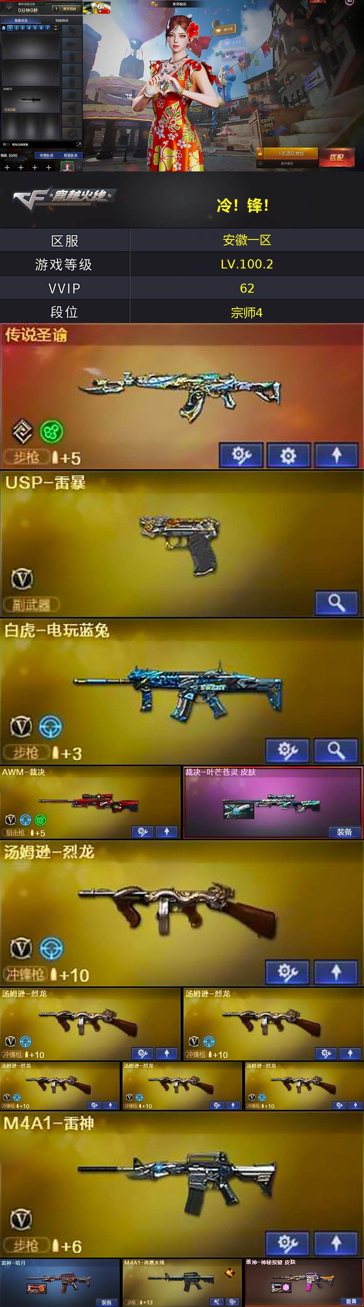 安徽一区-58V-2王者-0炫金【双全号 传说圣谕,HK417-朱雀,白虎-电玩蓝兔,汤姆逊-烈龙*6,斯泰尔-蝴蝶,MK5-炽火炎龙,USP-雷暴,沙鹰-修罗*2】