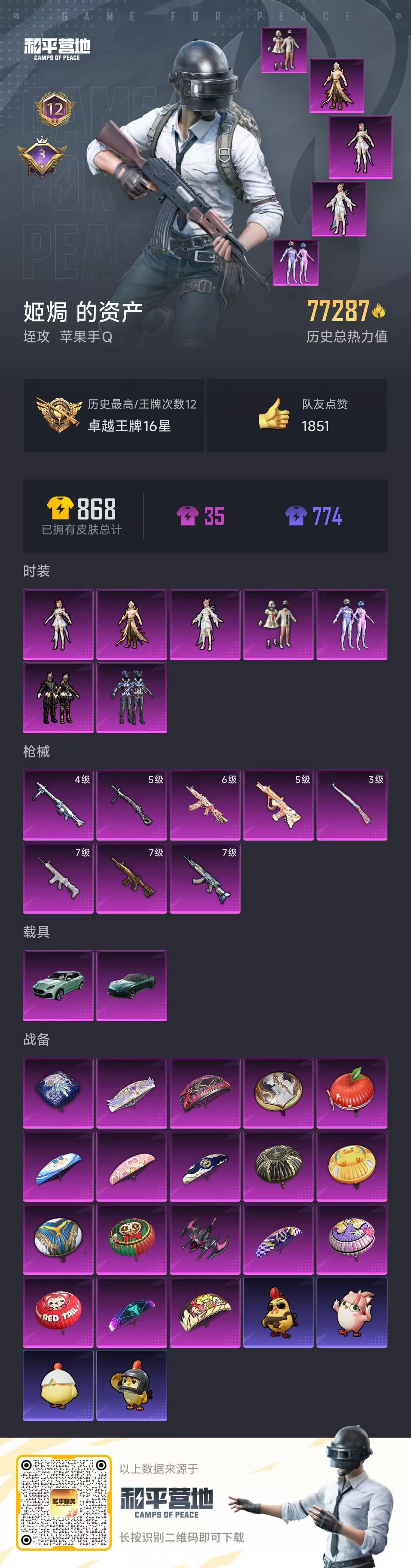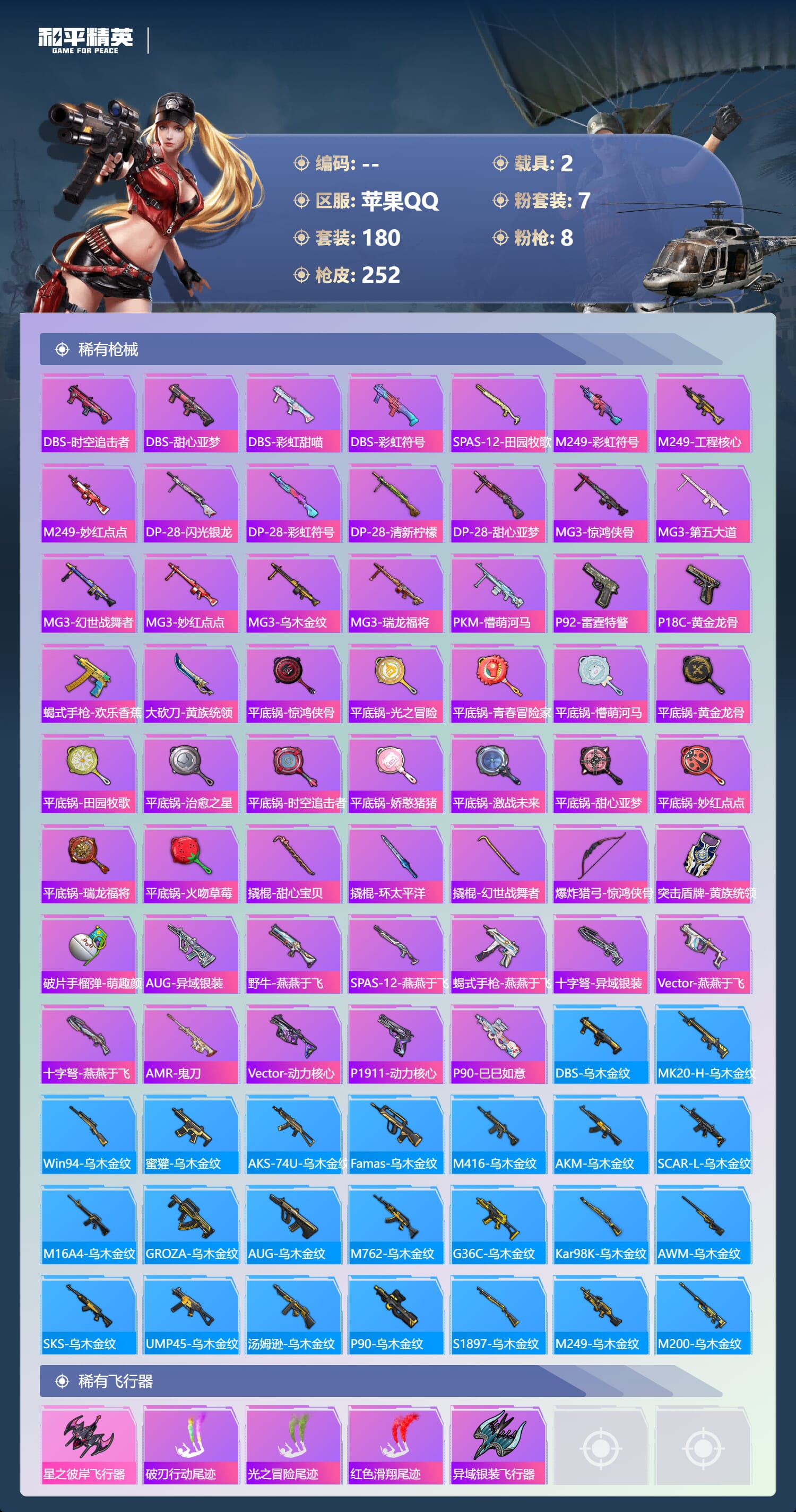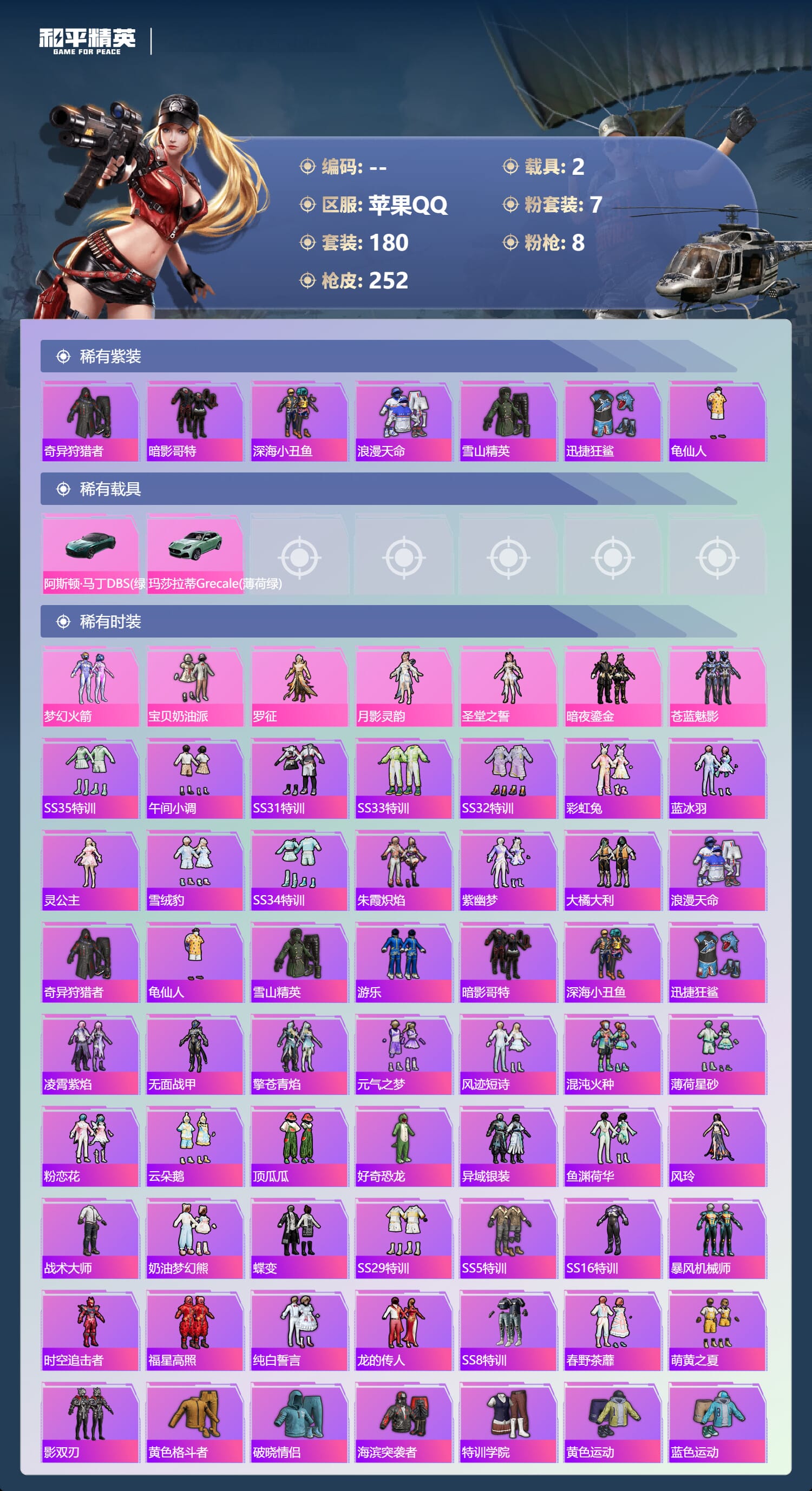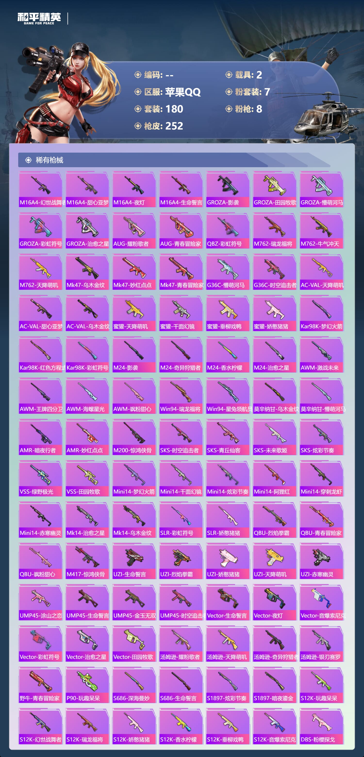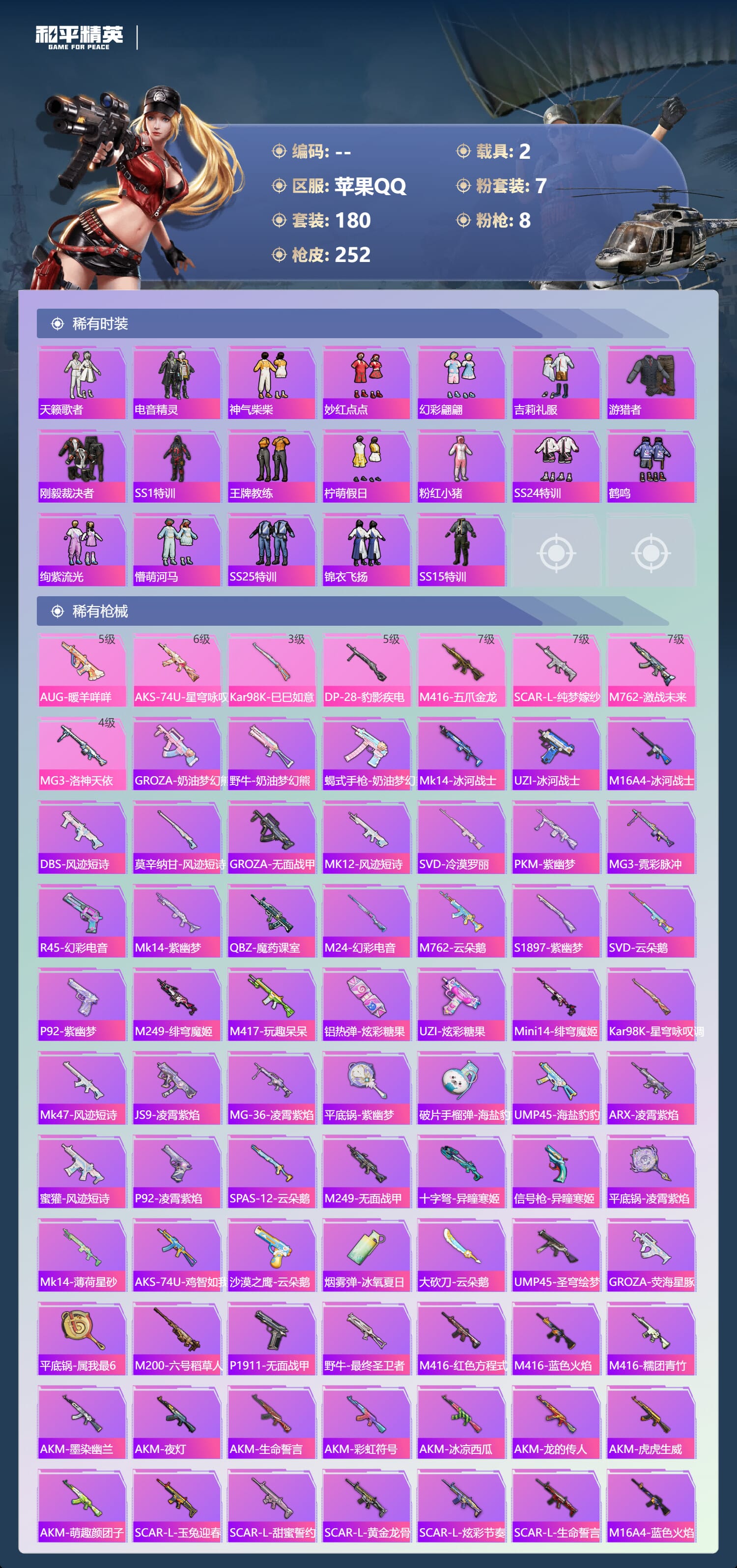 a4141/苹果QQ/-12王牌印记-7粉装-8特效枪-2载具-77287热力值-180套装-252