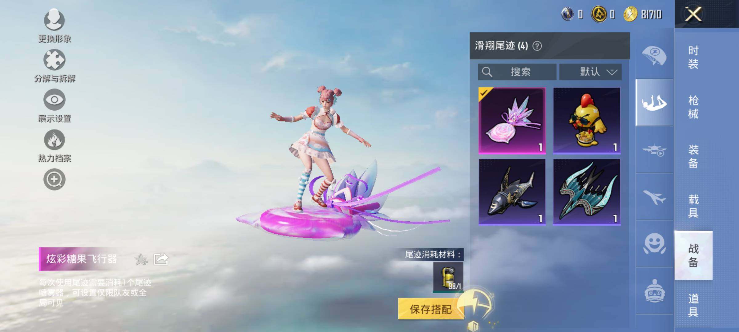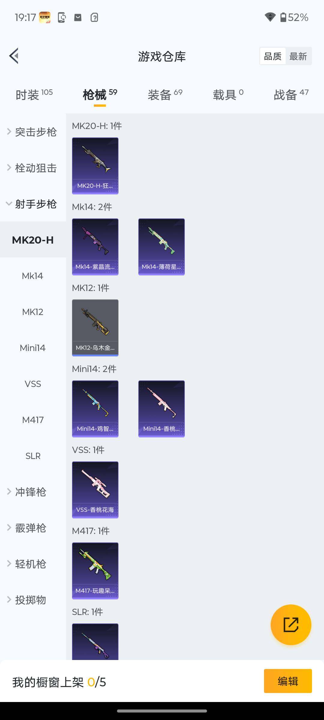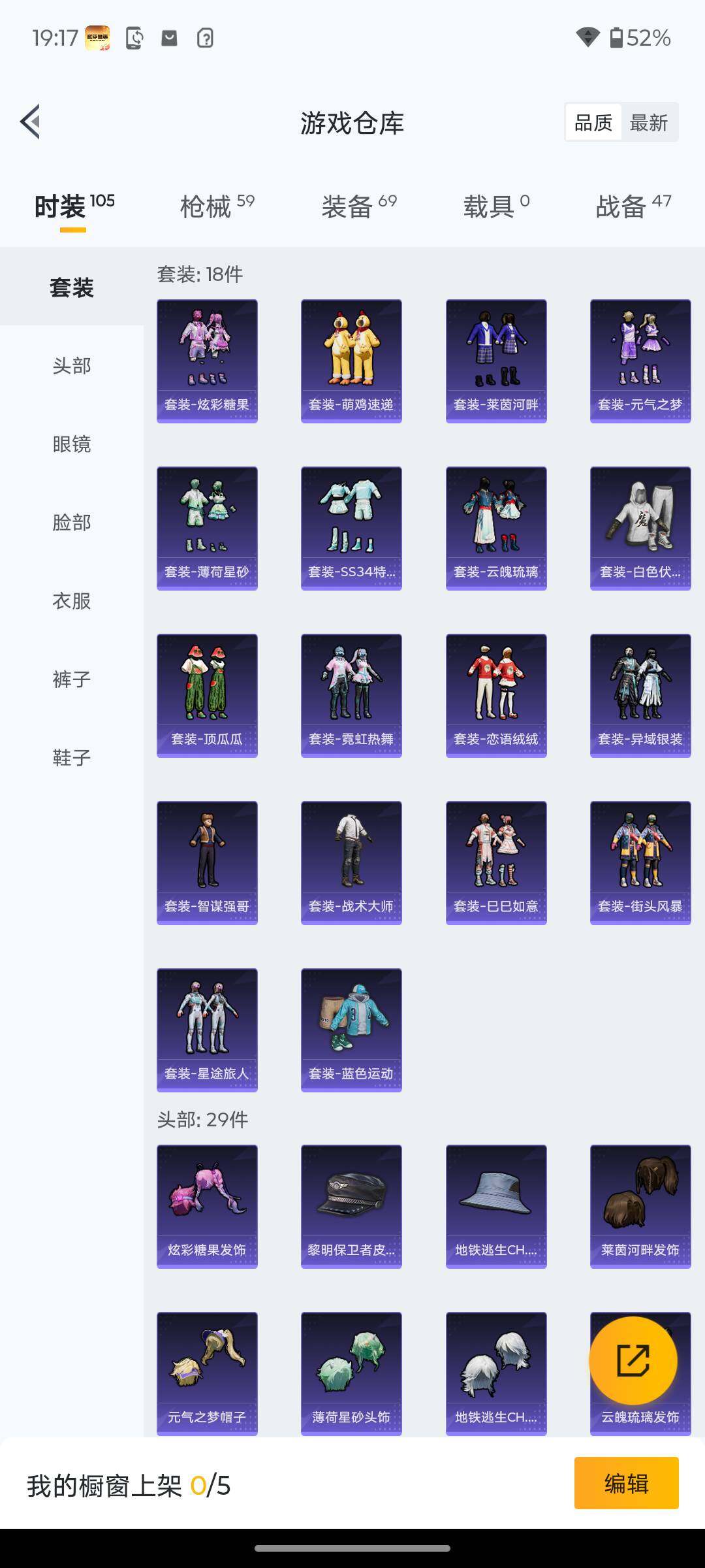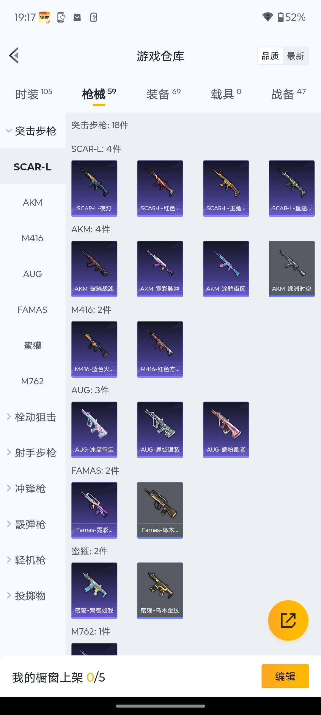18套装/枪械2/装备69/战备47/热力值13199/五级Kar98K-巳巳如意/五级DP-28-豹影疾电/Kar98K-巳巳如意/DP-28-豹影疾电/异瞳寒姬降落伞/极意拳锋降落伞/巳巳如意/套装-霓虹热舞/套装-炫彩糖果/AUG-冰晶雪宝/AKM-破晓战魂/SCAR-L-夜灯/SCAR-L-玉兔迎春/SCAR-L-红色方程式/M416-红色方程式/M416-蓝色火焰/AUG-耀粉歌者/M