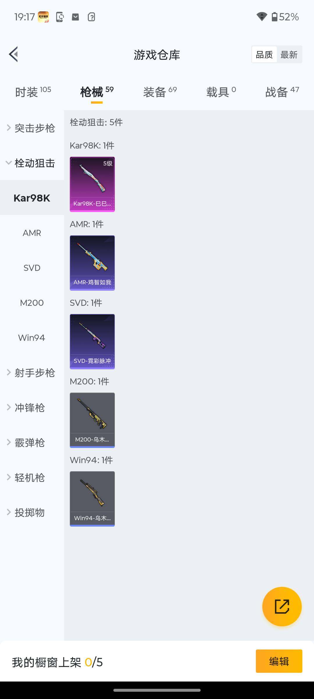 18套装/枪械2/装备69/战备47/热力值13199/五级Kar98K-巳巳