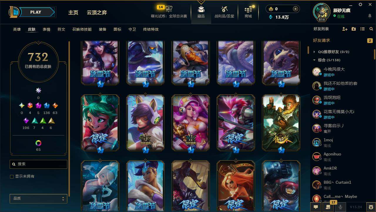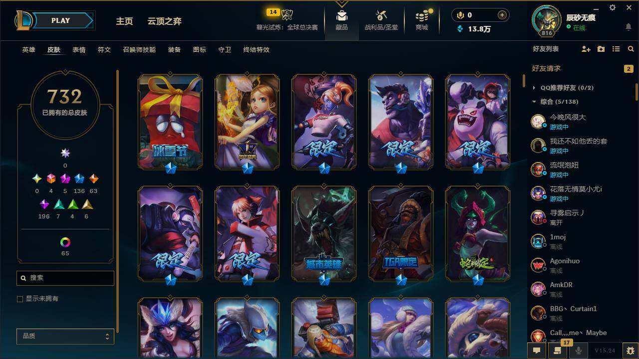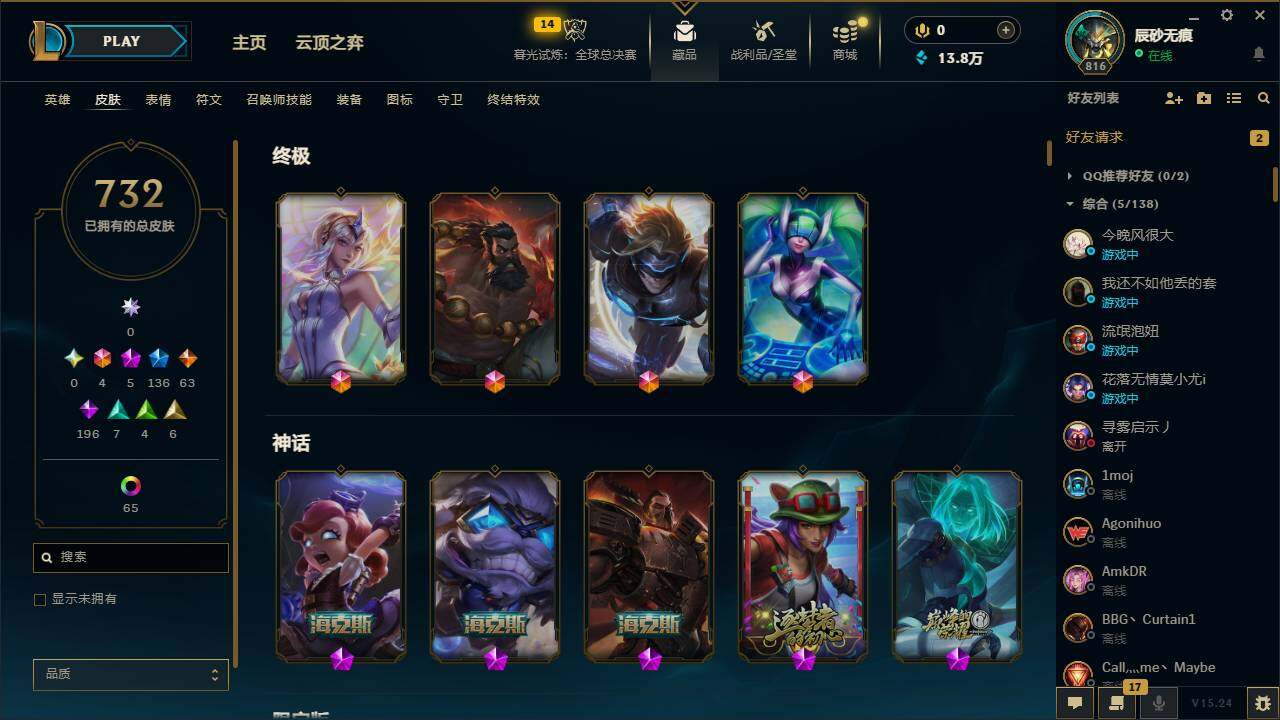 172英雄/732皮肤/4终极/5神话/136限定/3臻彩/69炫彩