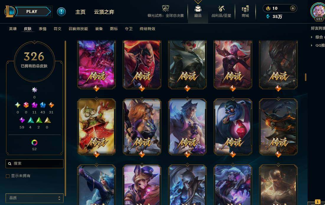 172英雄/326皮肤/11神话/43限定/8臻彩/
