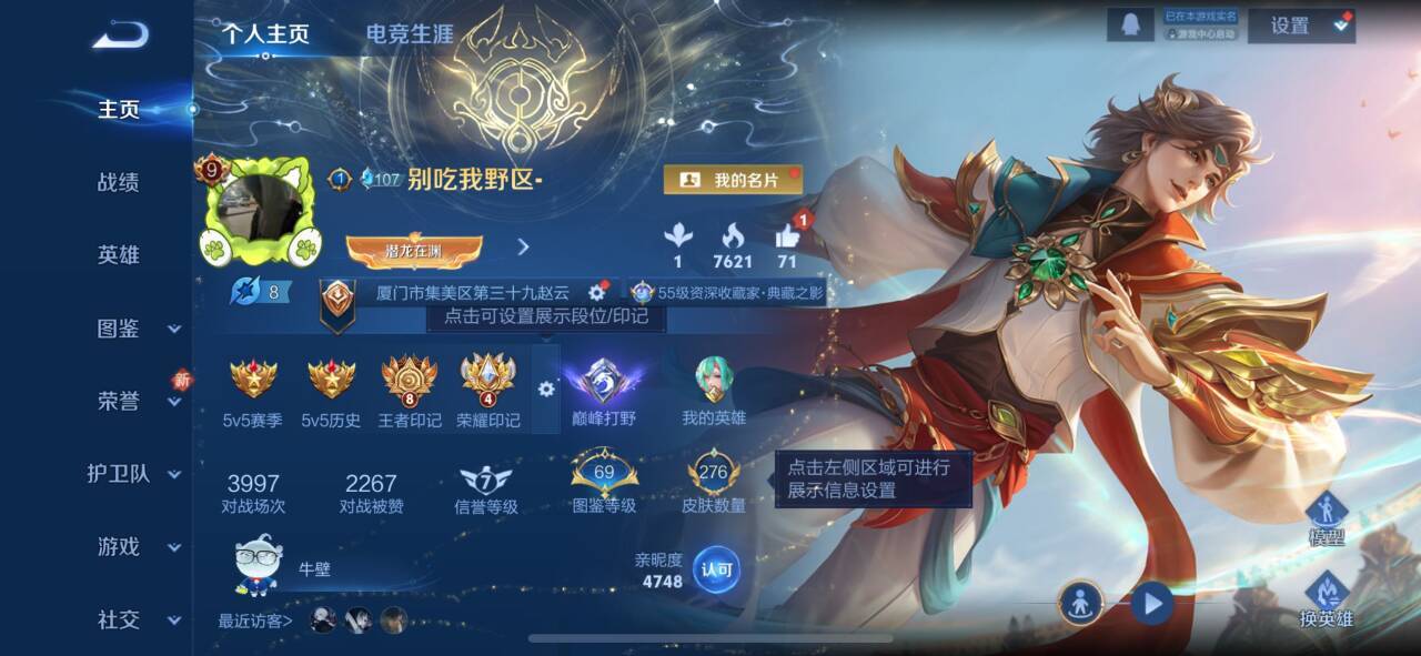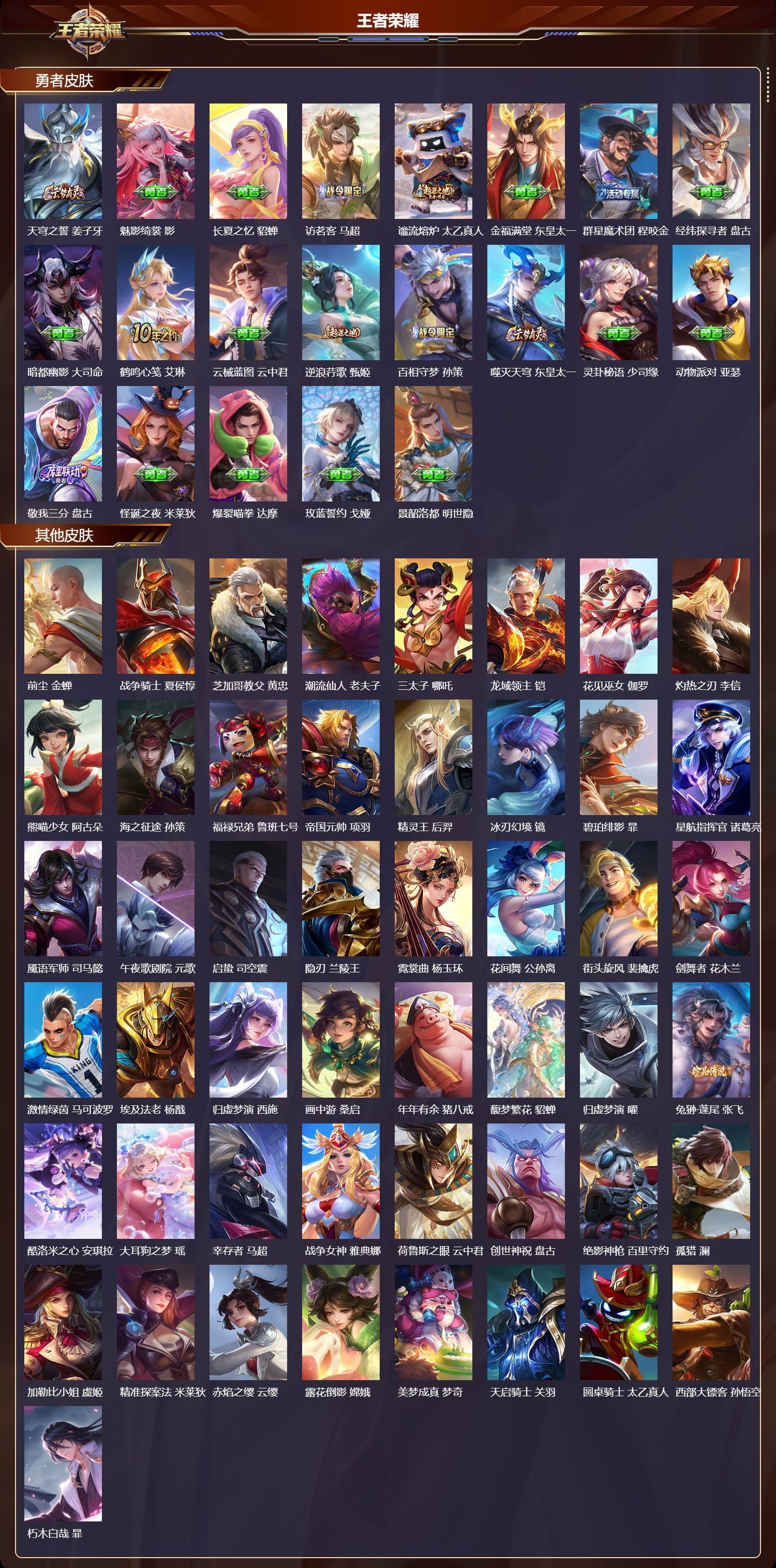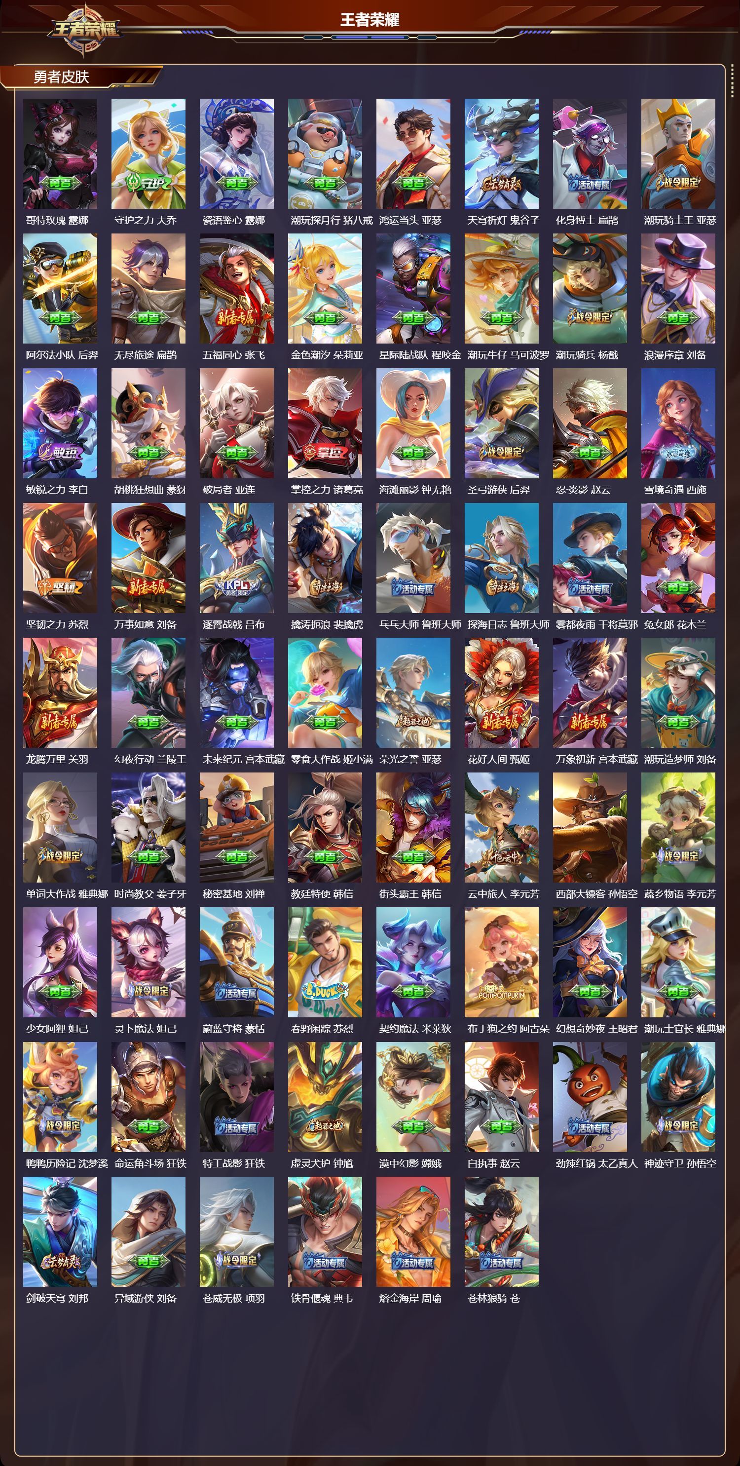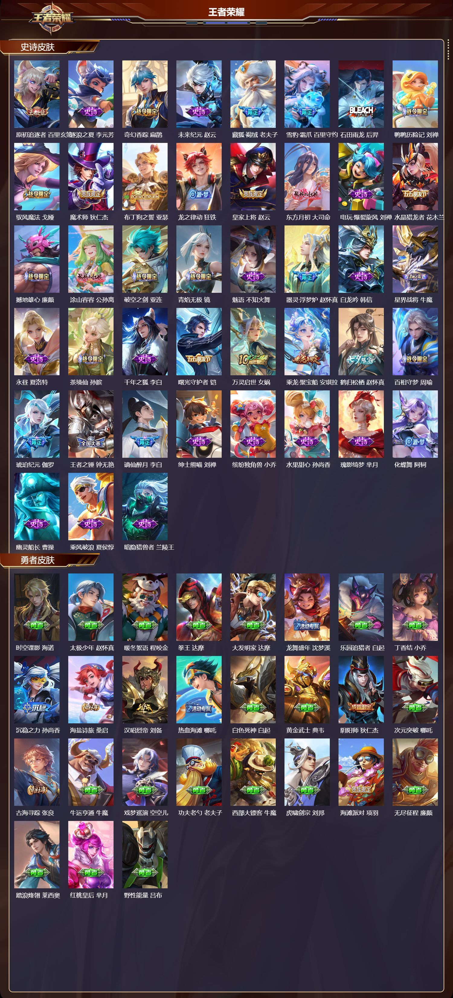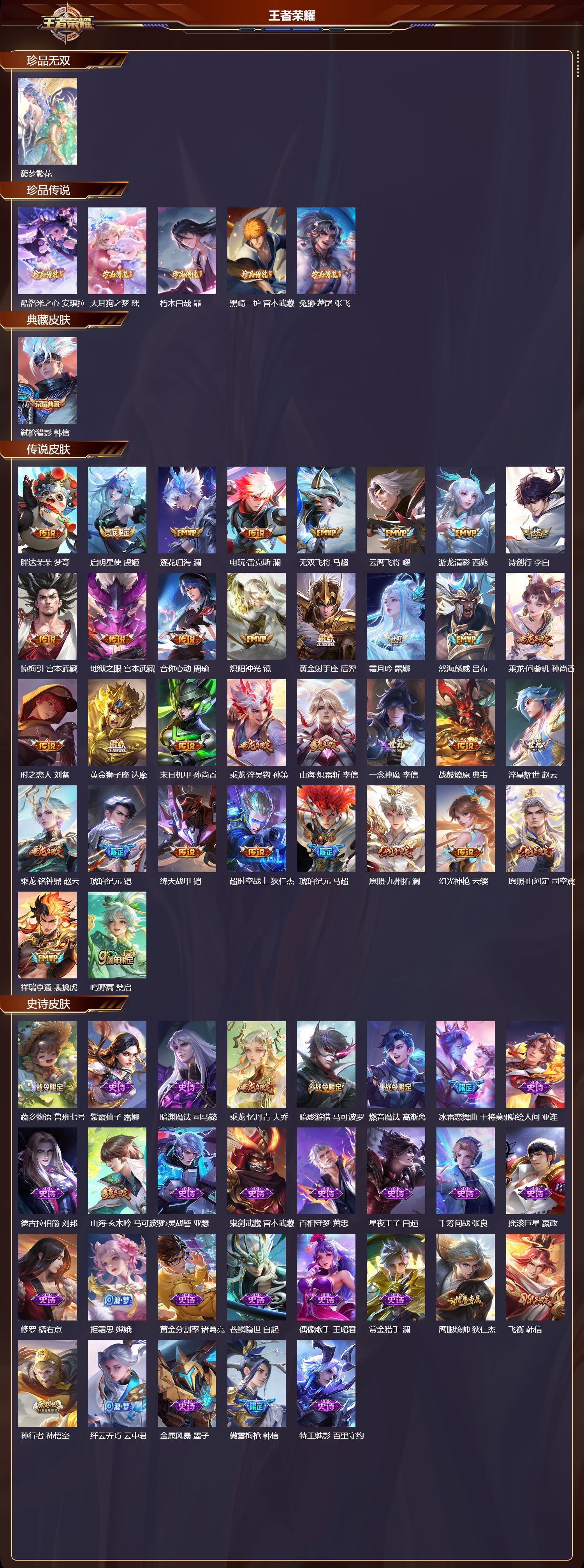 苹果QQ/荣耀王者/276皮肤/123英雄/1典藏/1珍品无双/0无双/5珍品传说/34传说/72史