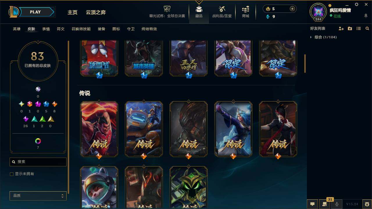 146英雄/83皮肤/1终极/5限定/7炫彩/8传说/26史诗/黄金