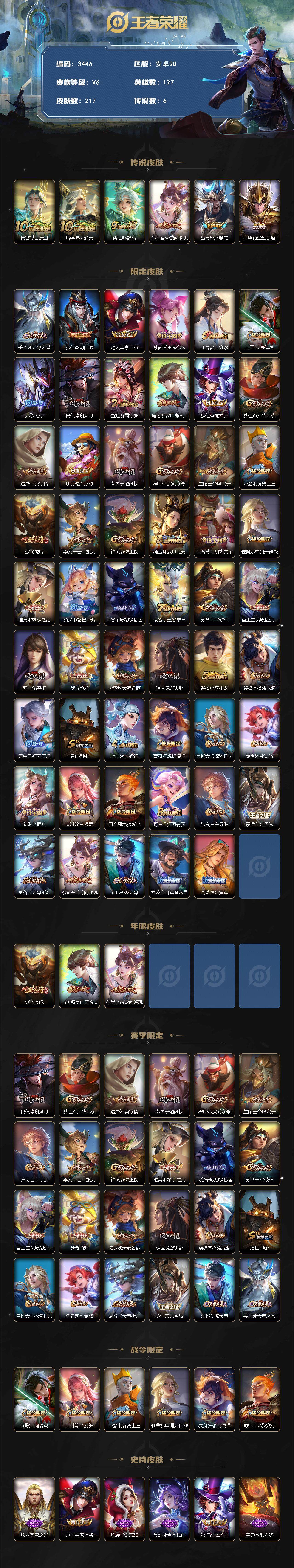 安卓Q-V6-最强王者段位-127英雄-217皮肤-6传说-55史诗