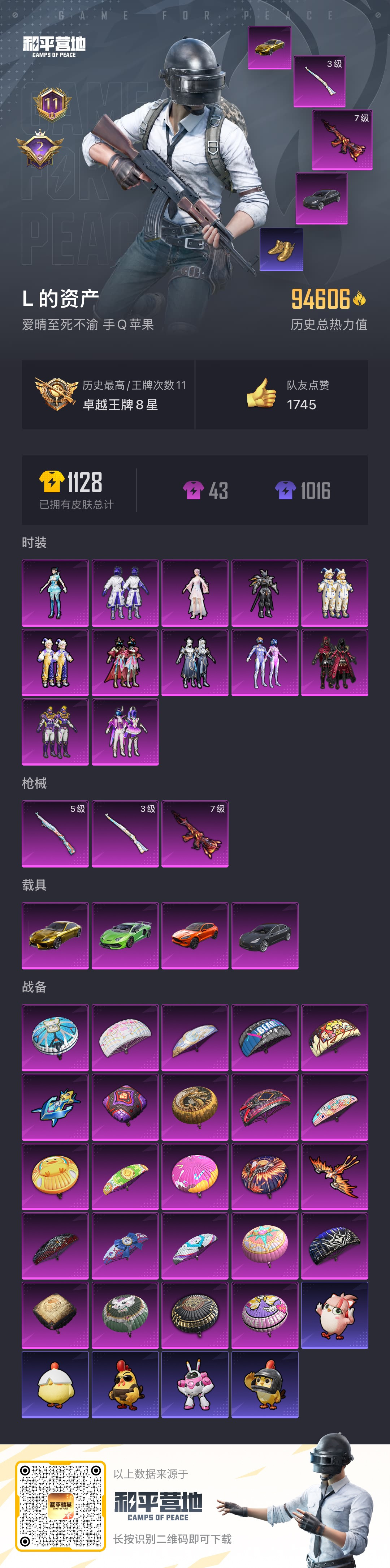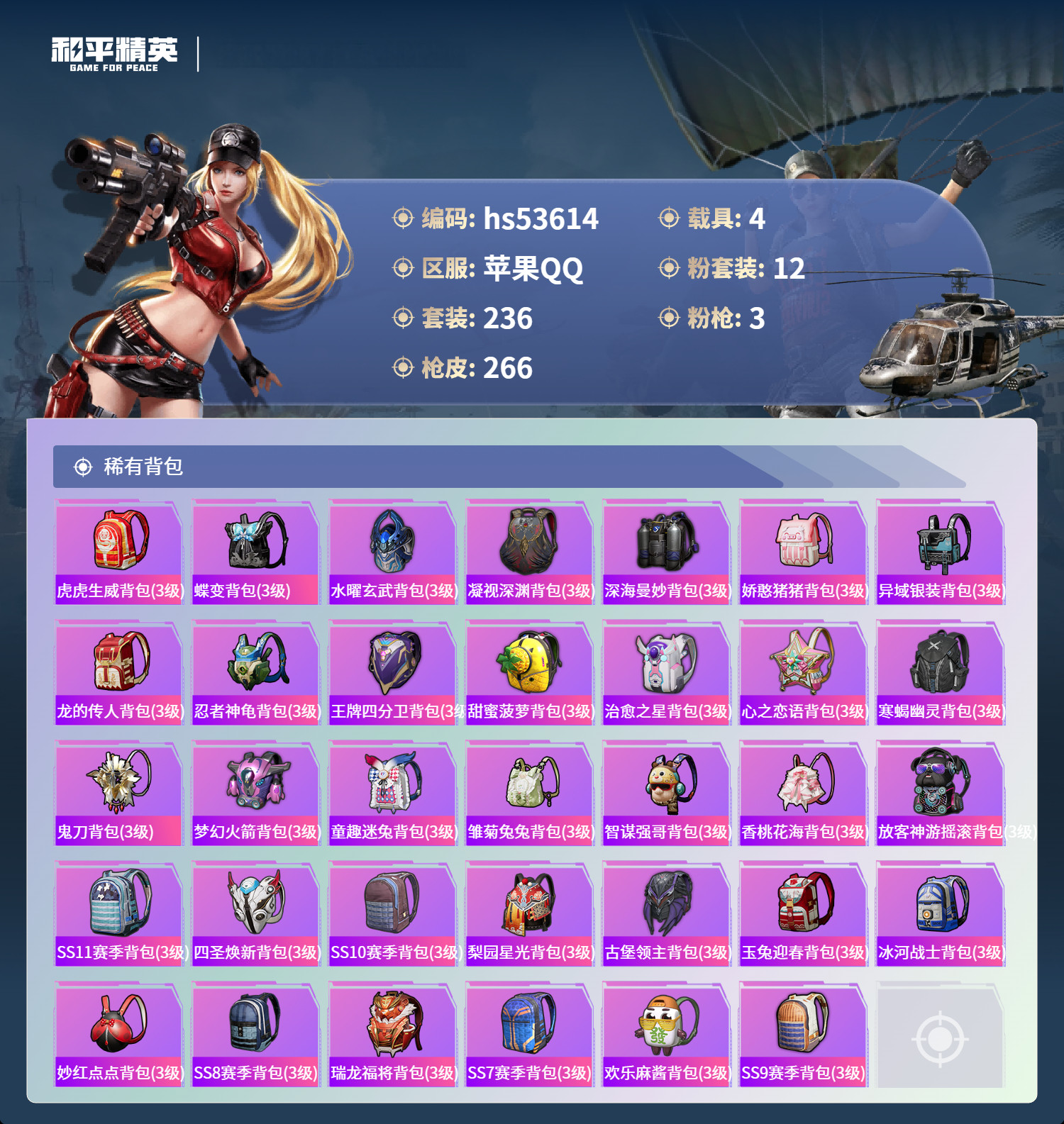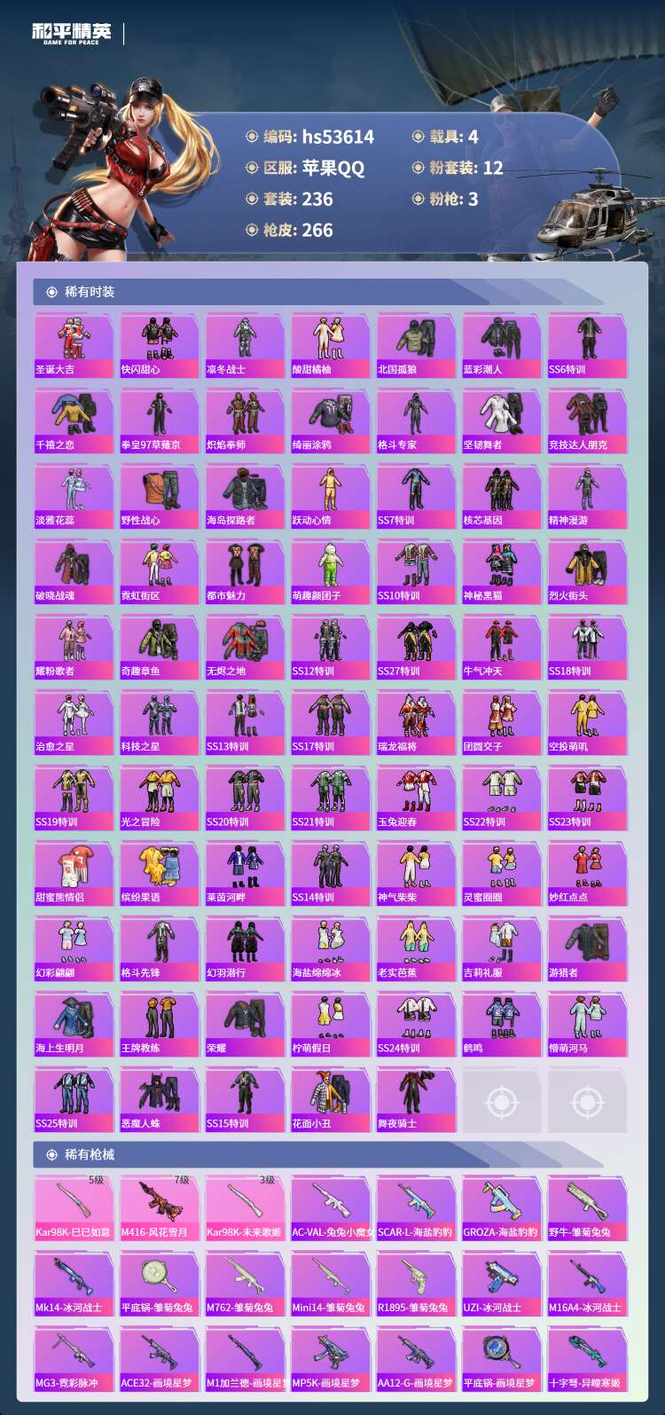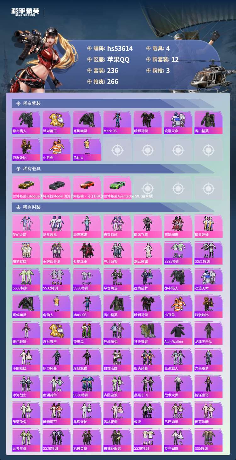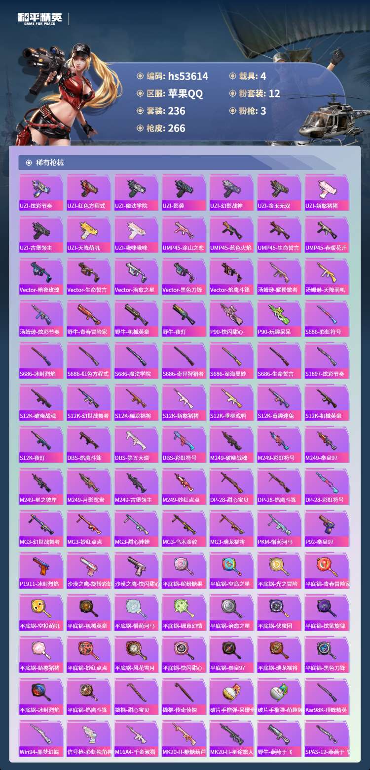 hs53614 苹果手Q-11王牌印记-12粉装-3特效枪-4载具-94606热力值-236套装-2