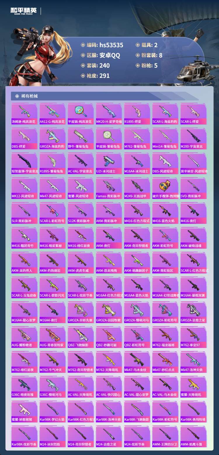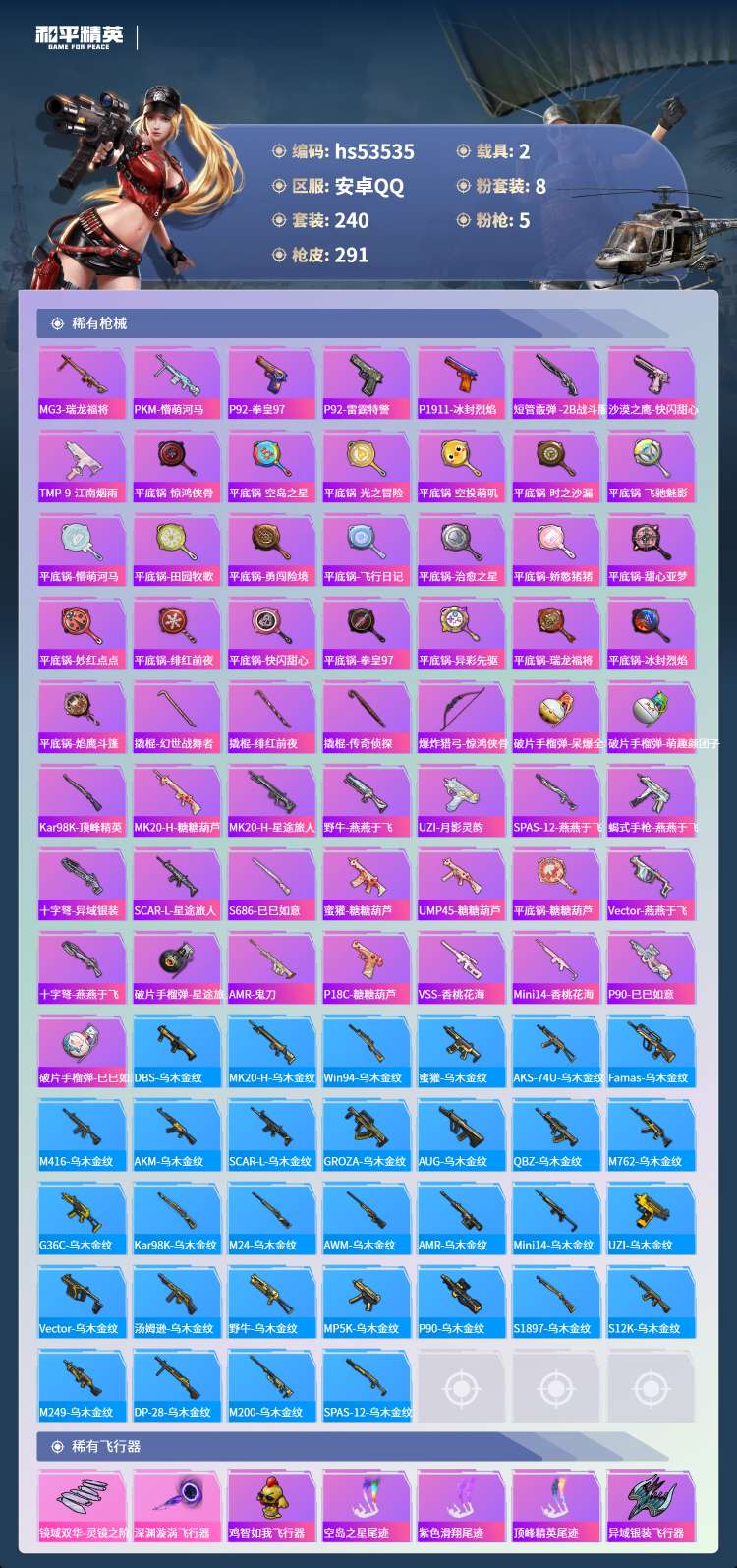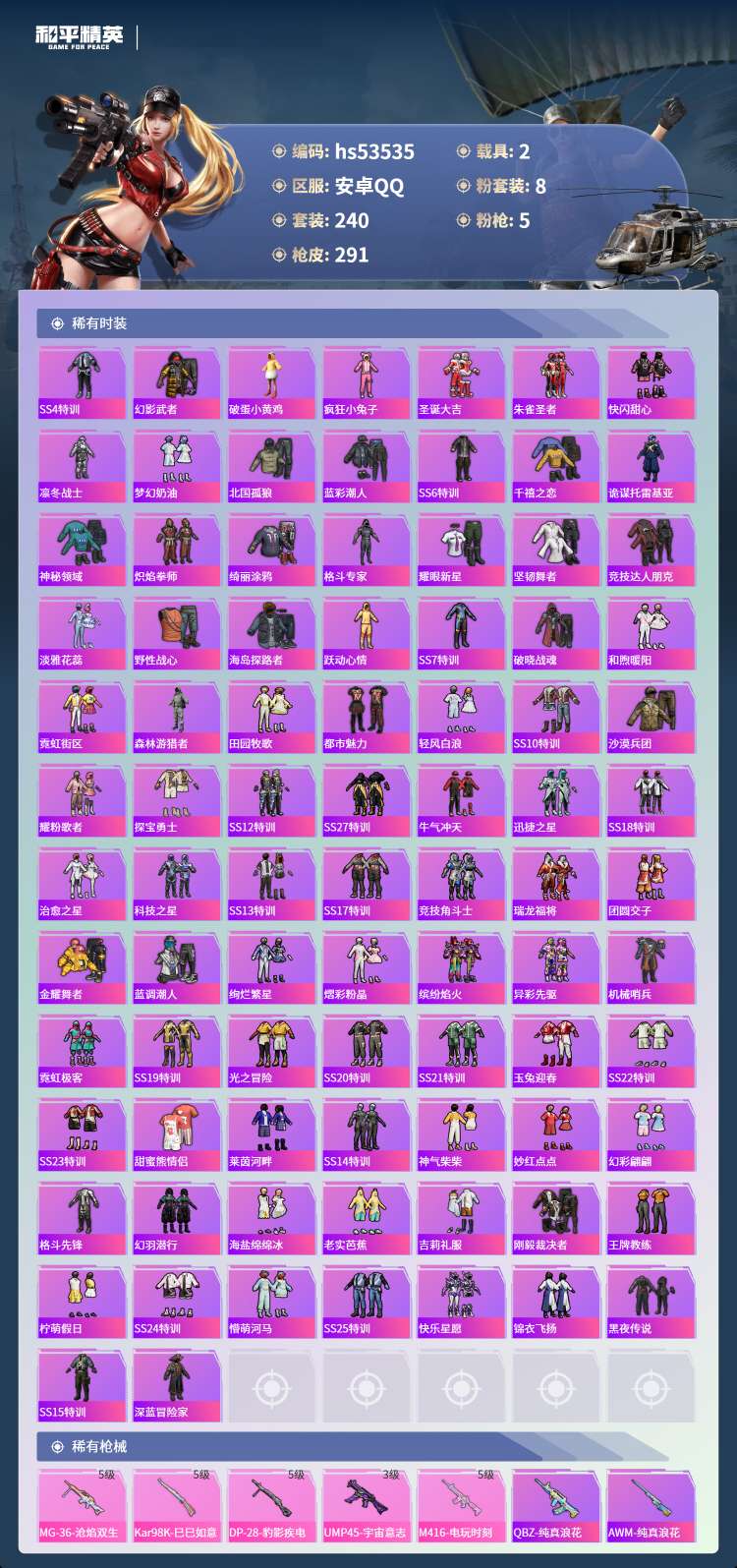 hs53535 安卓手Q-16王牌印记-1红装-8粉装-5特效枪-2载具-99736热力值-240套