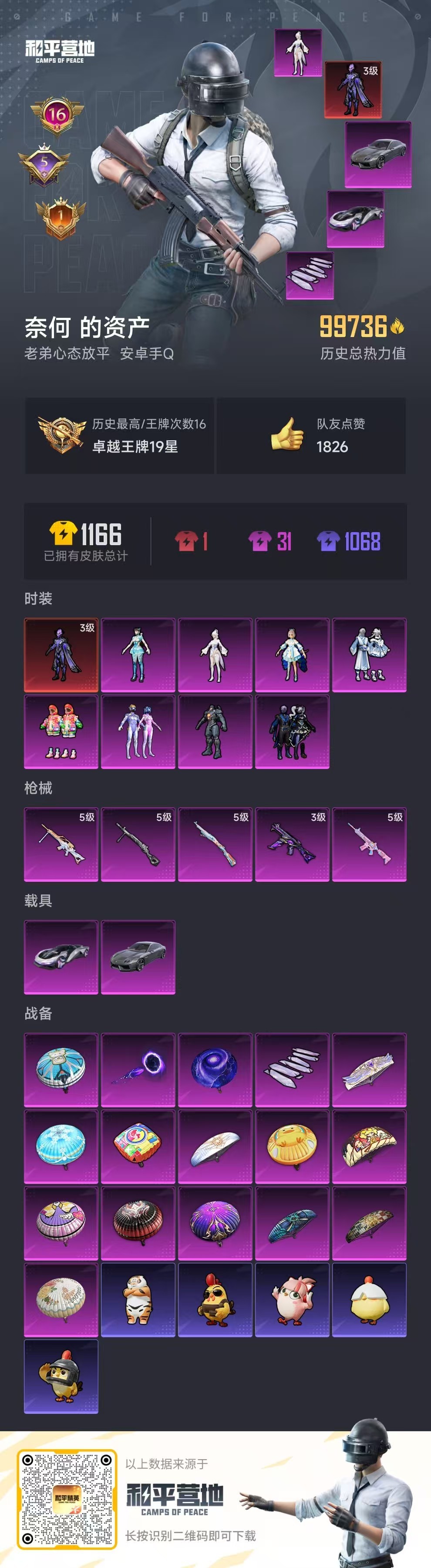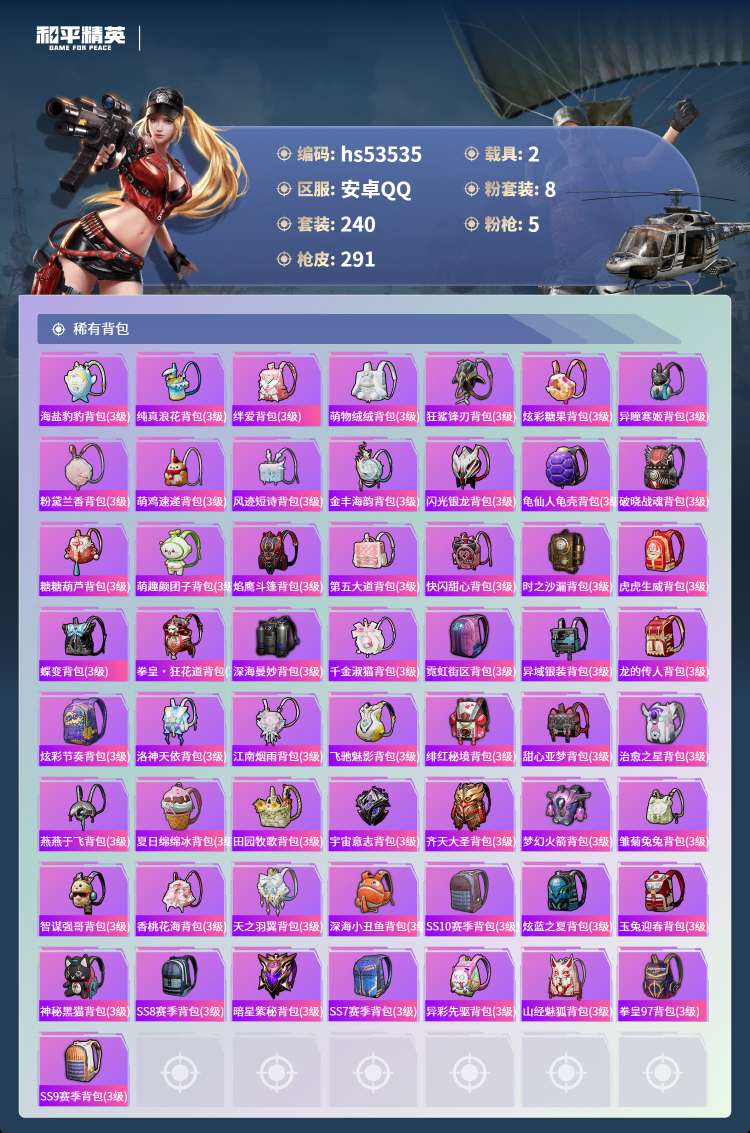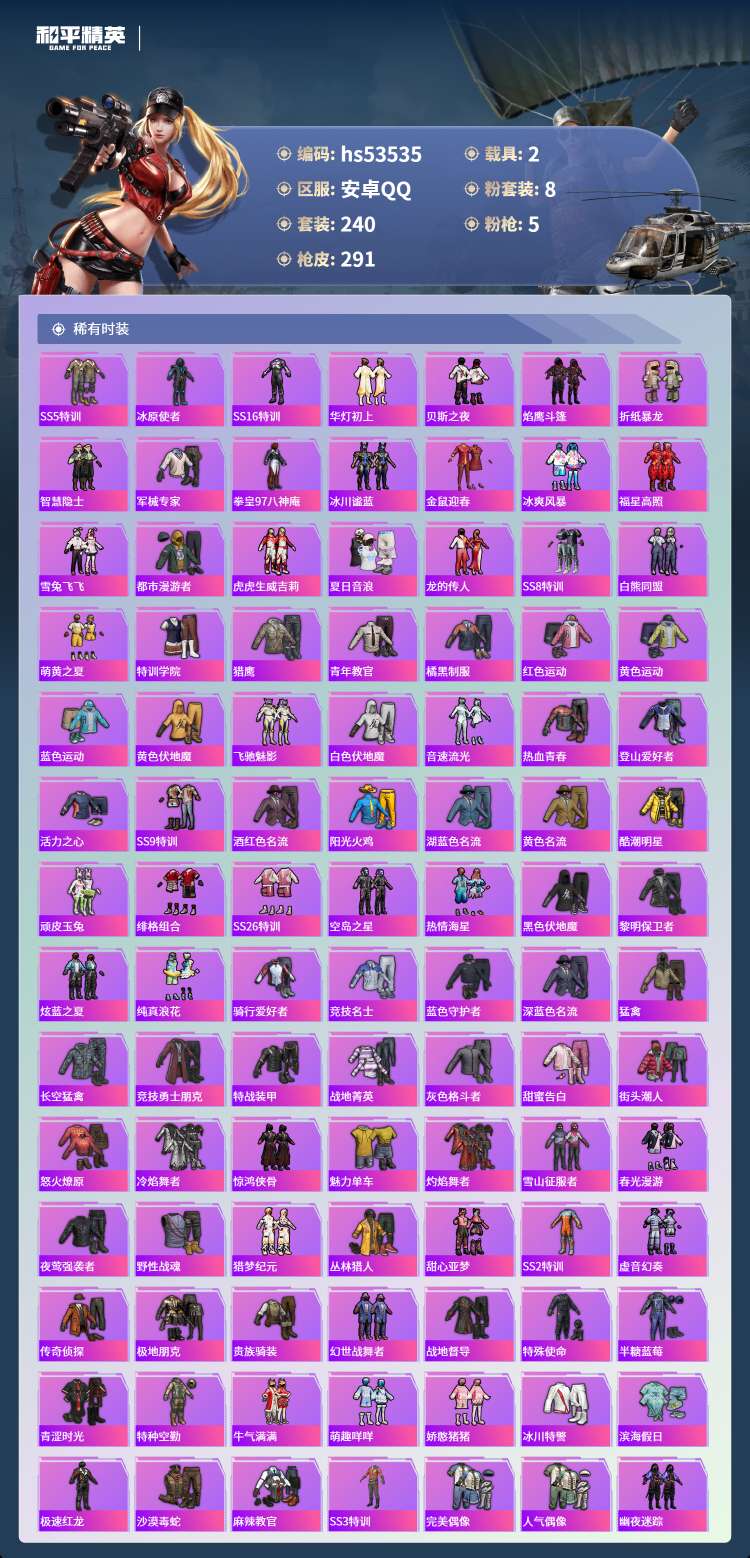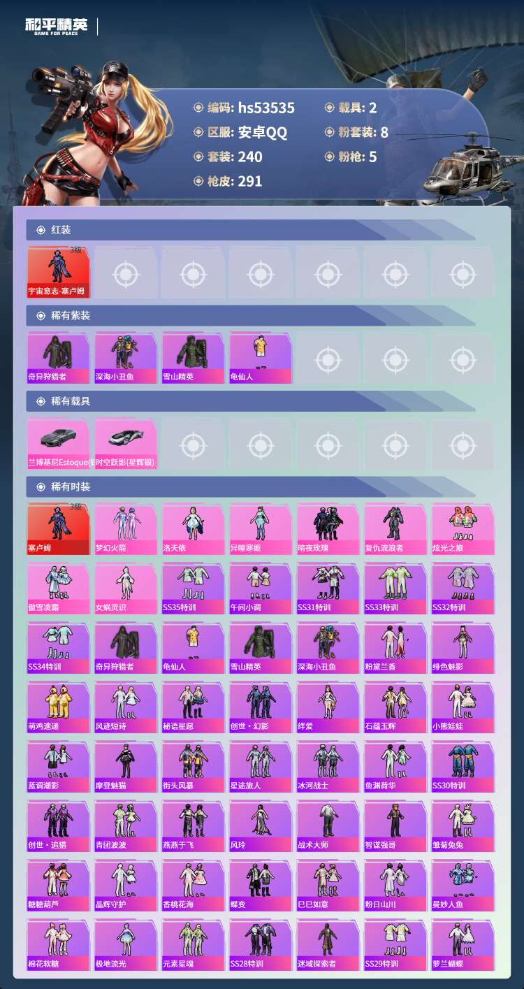hs53535 安卓手Q-16王牌印记-1红装-8粉装-5特效枪-2载具-99736热力值-240套