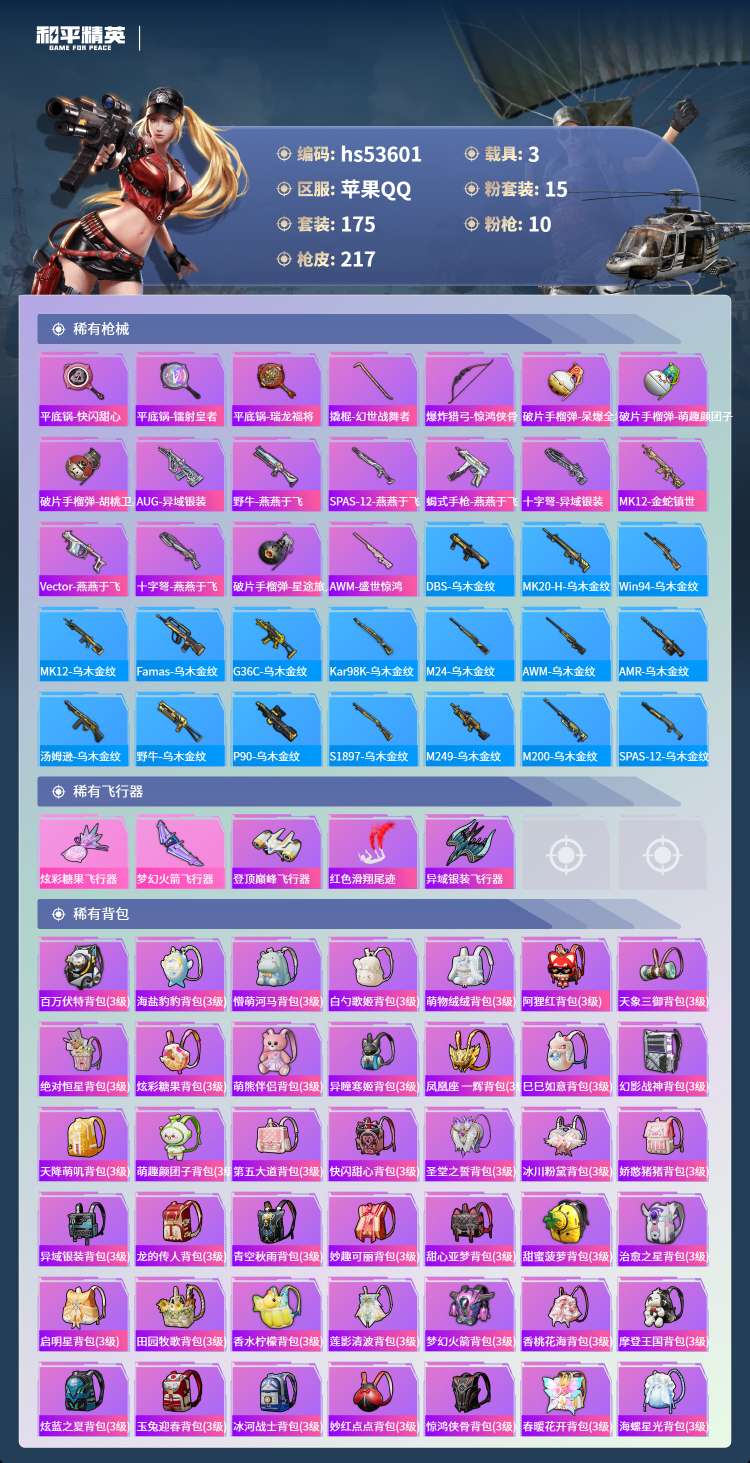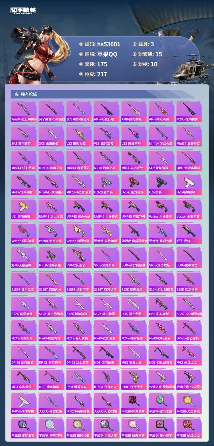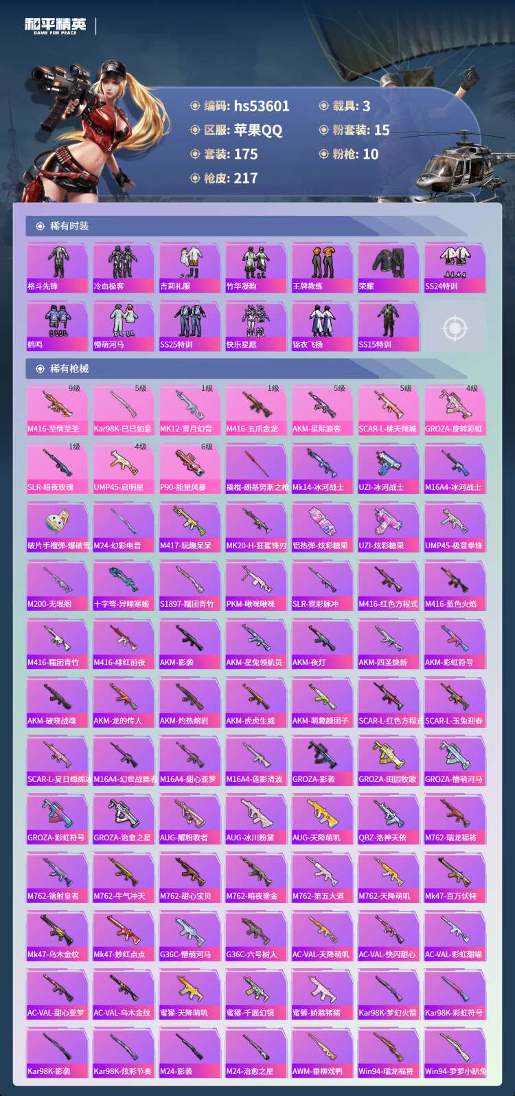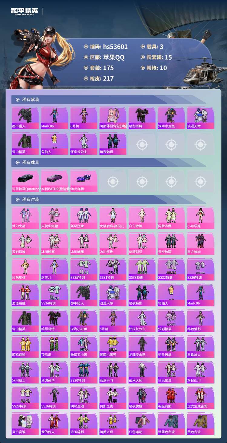hs53601 苹果手Q-16王牌印记-有战神框-15粉装-10特效枪-3载具-77582热力值-1