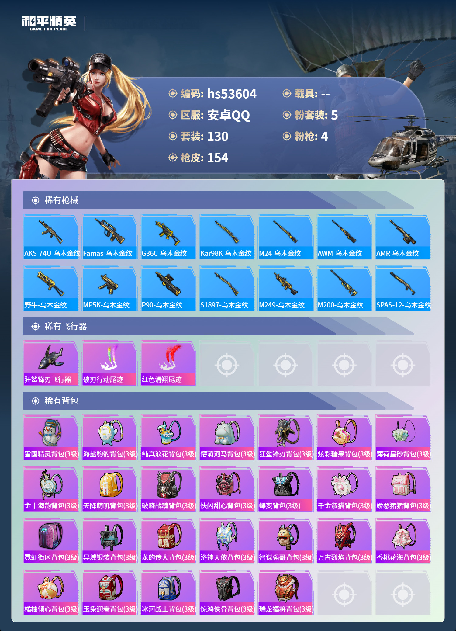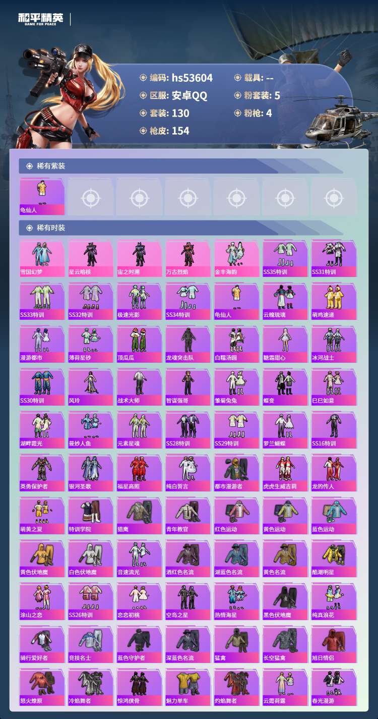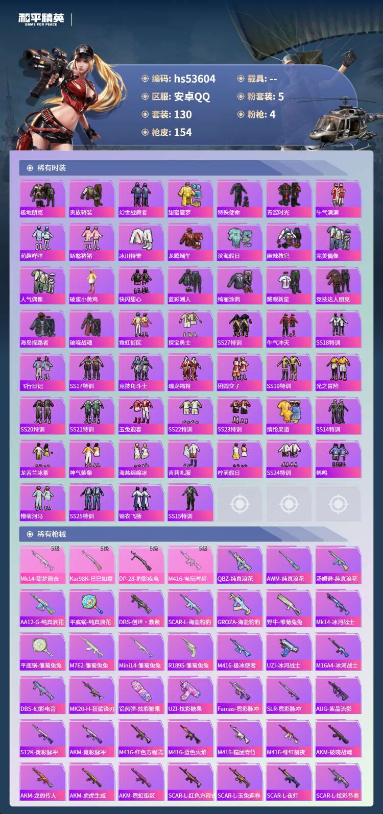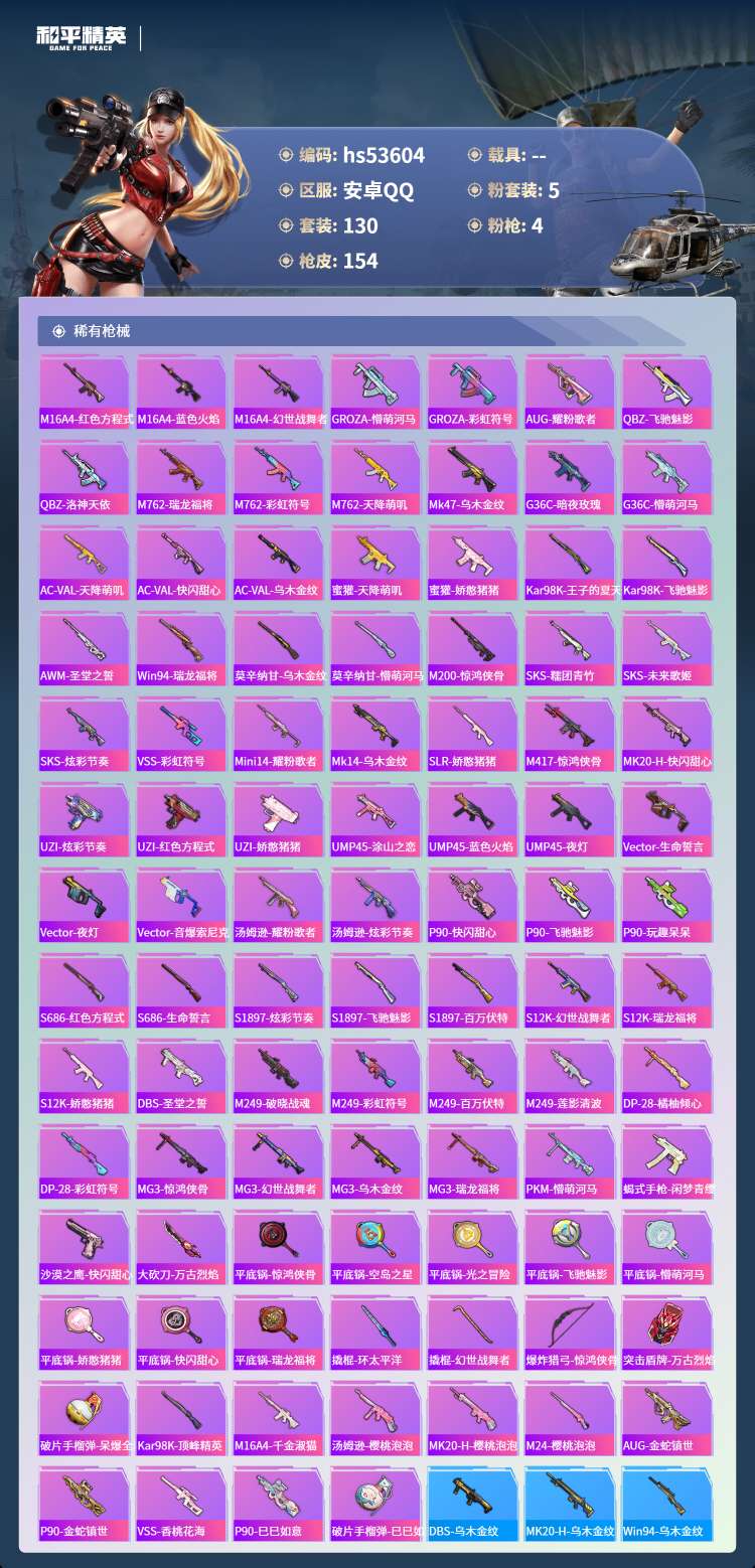 hs53604 安卓手Q-5王牌印记-5粉装-4特效枪-42825热力值-130套装-154枪皮-1