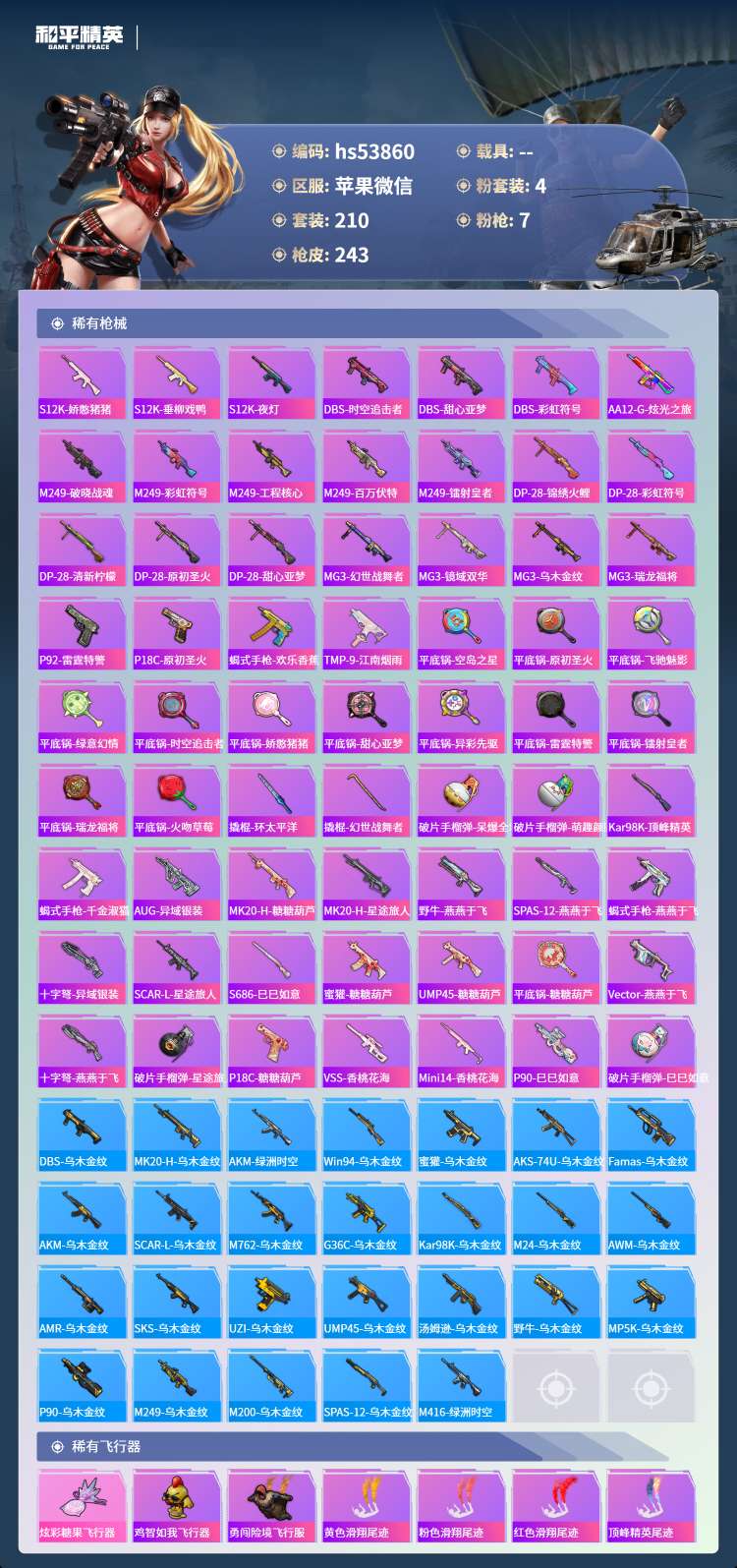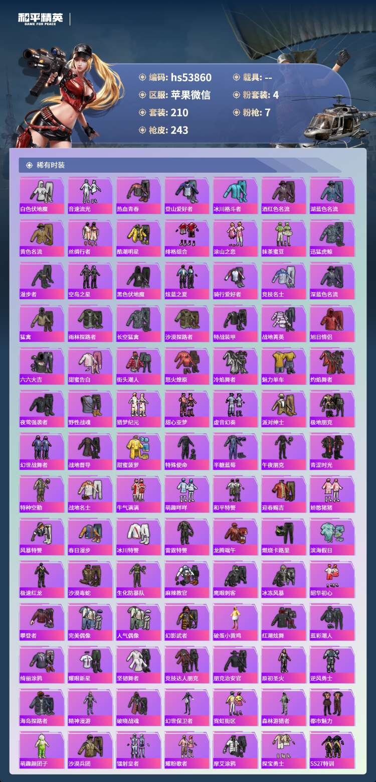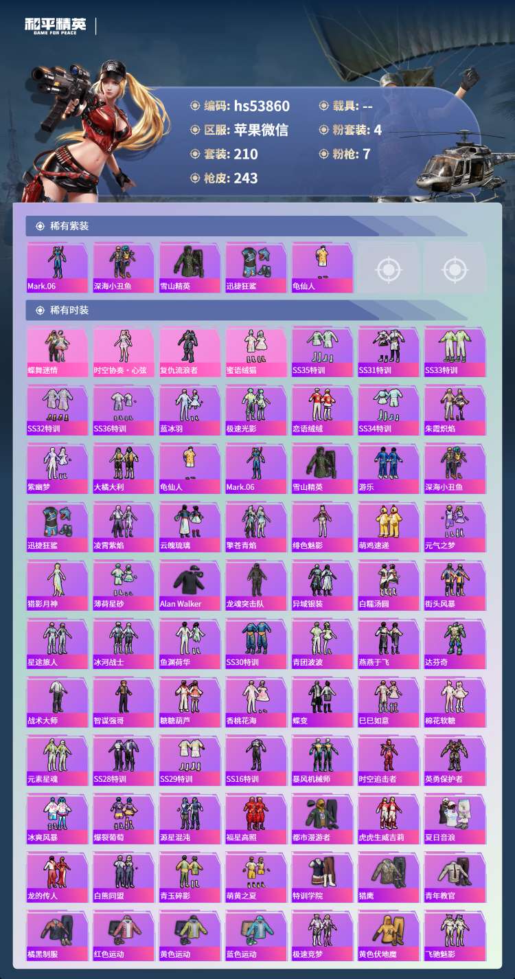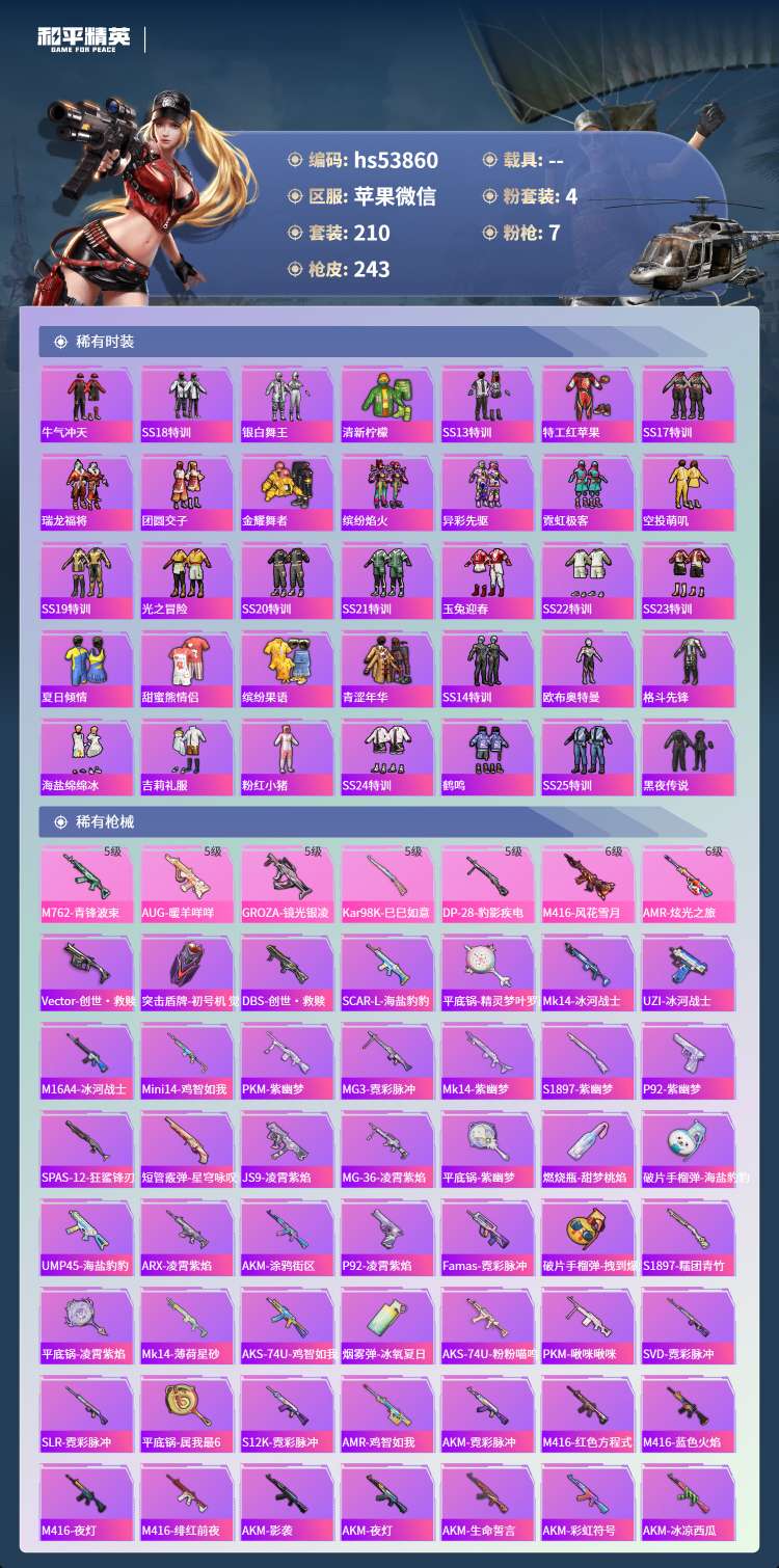 hs53860 苹果微-12王牌印记-4粉装-7特效枪-73169热力值-210套装-243枪皮-