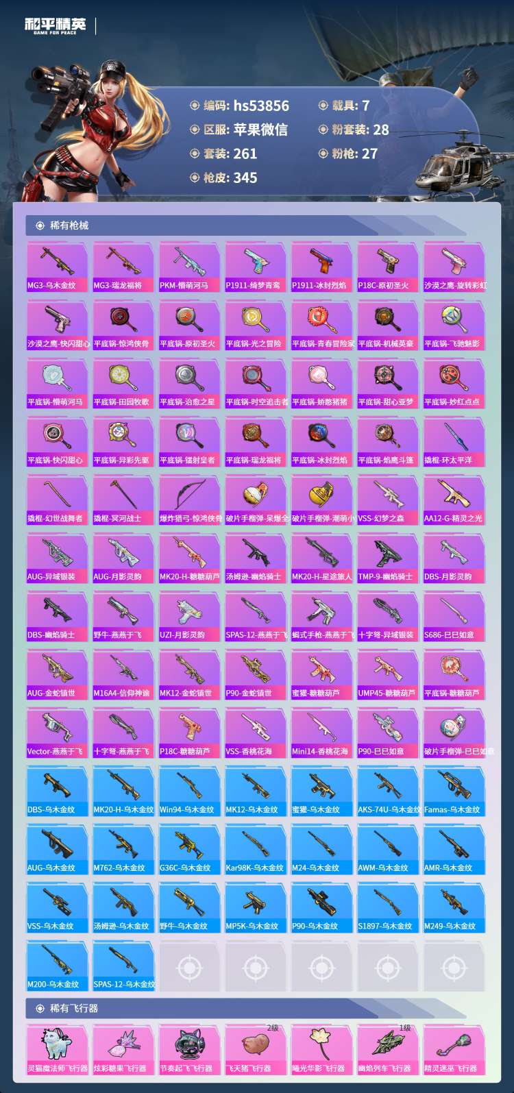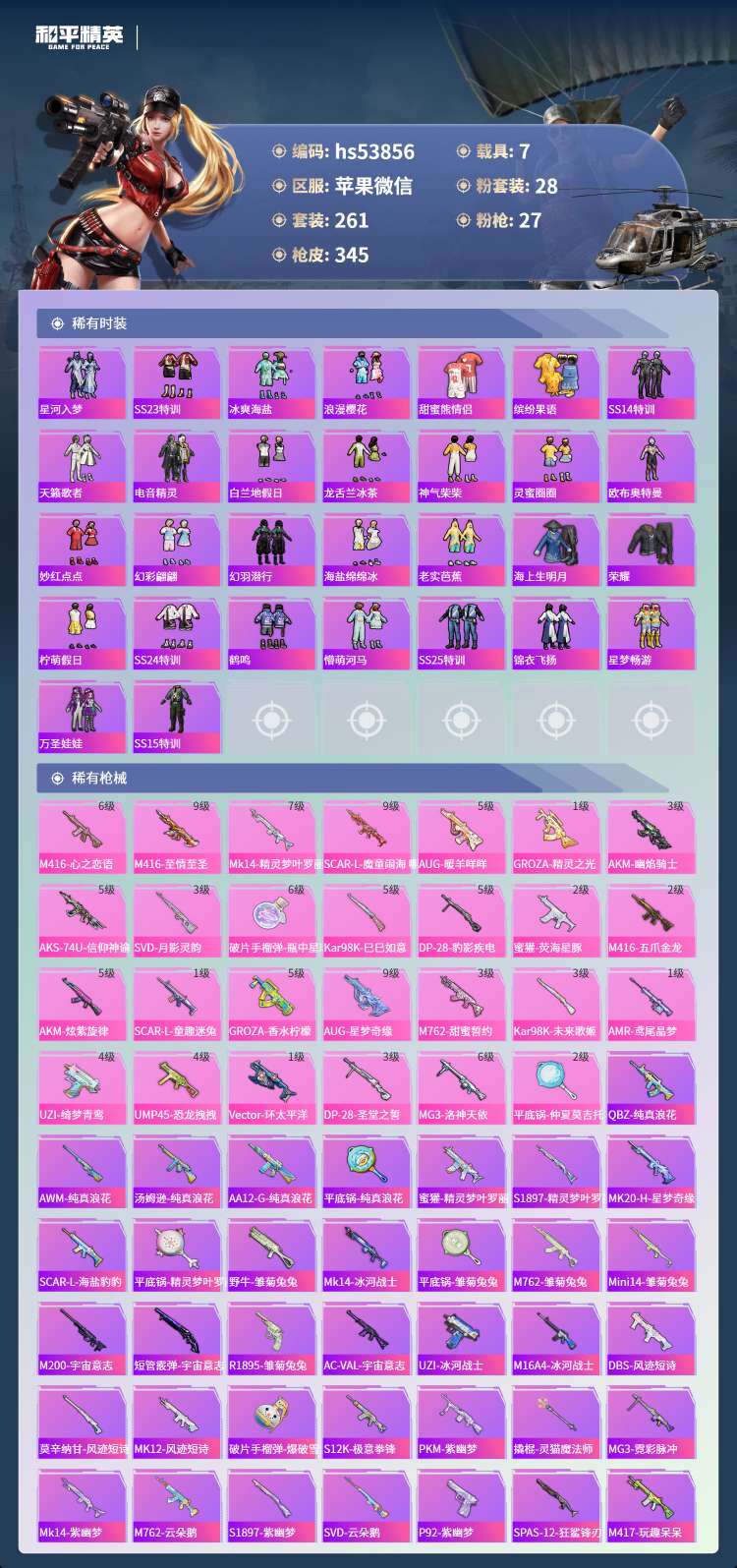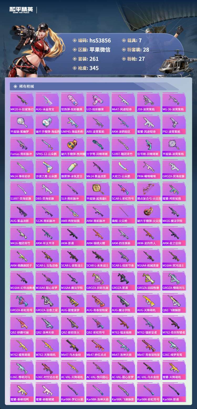 hs53856 苹果微-27王牌印记-有战神框-2红装-28粉装-27特效枪-7载具-157354