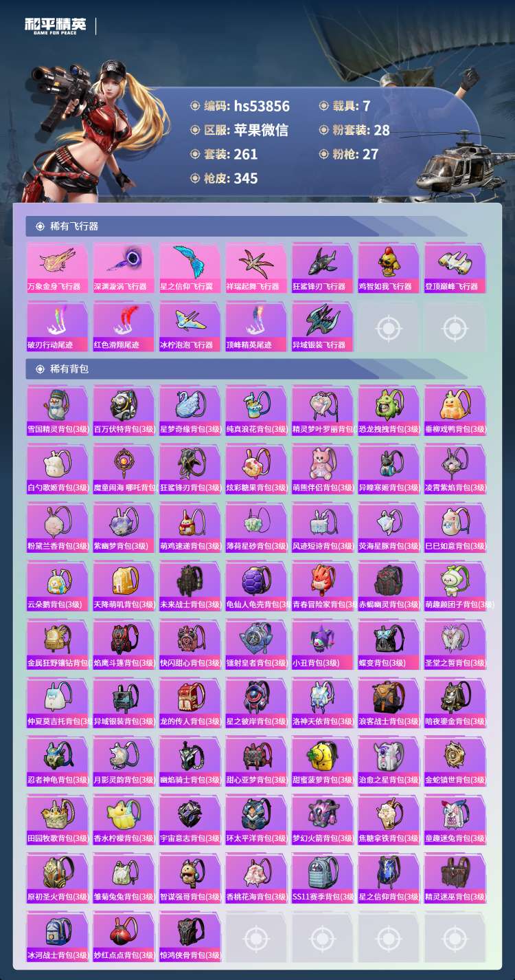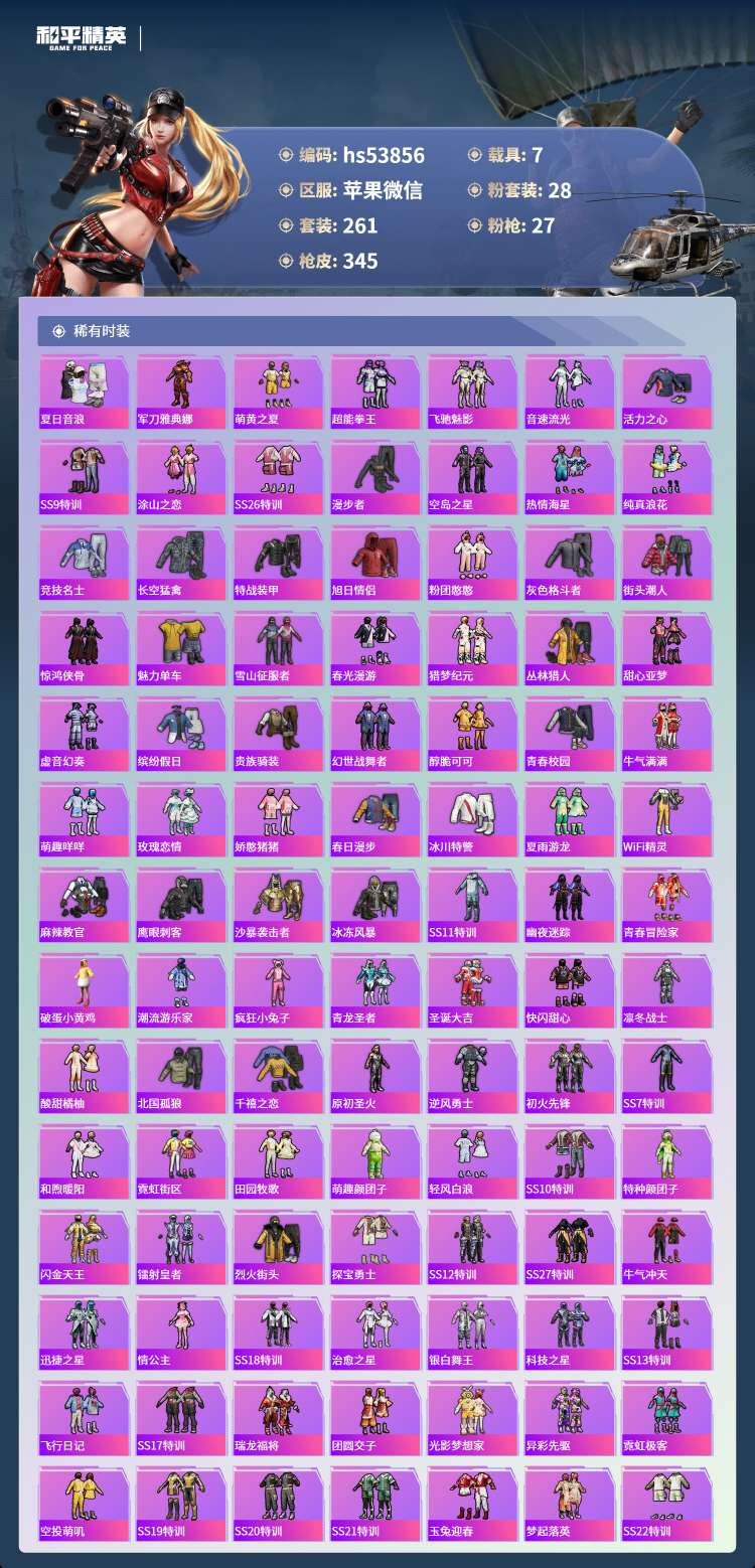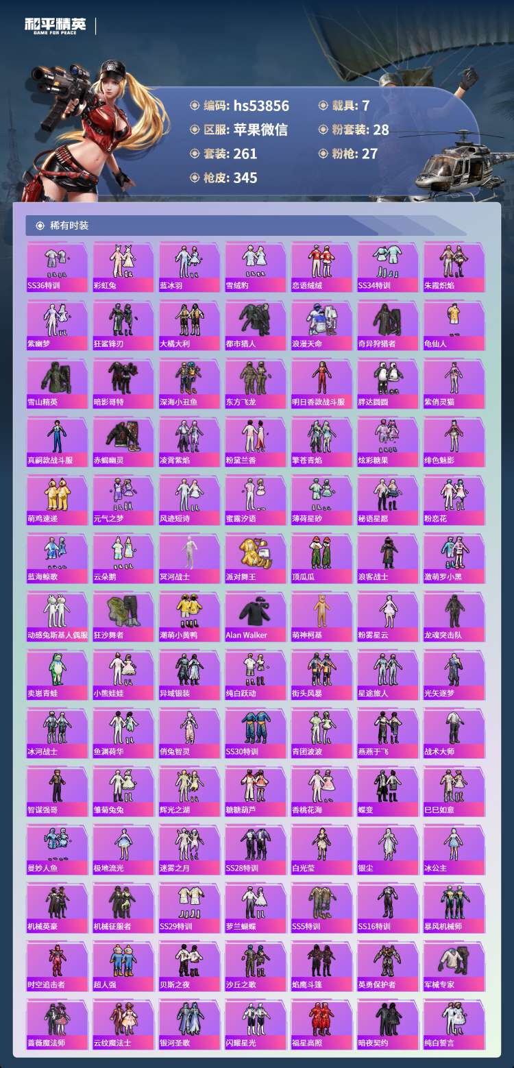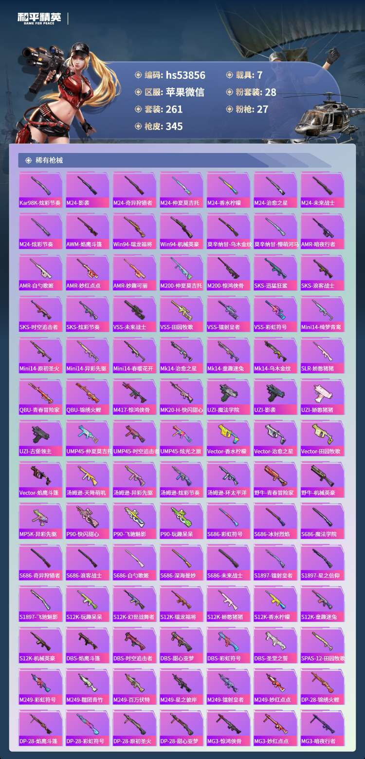 hs53856 苹果微-27王牌印记-有战神框-2红装-28粉装-27特效枪-7载具-157354