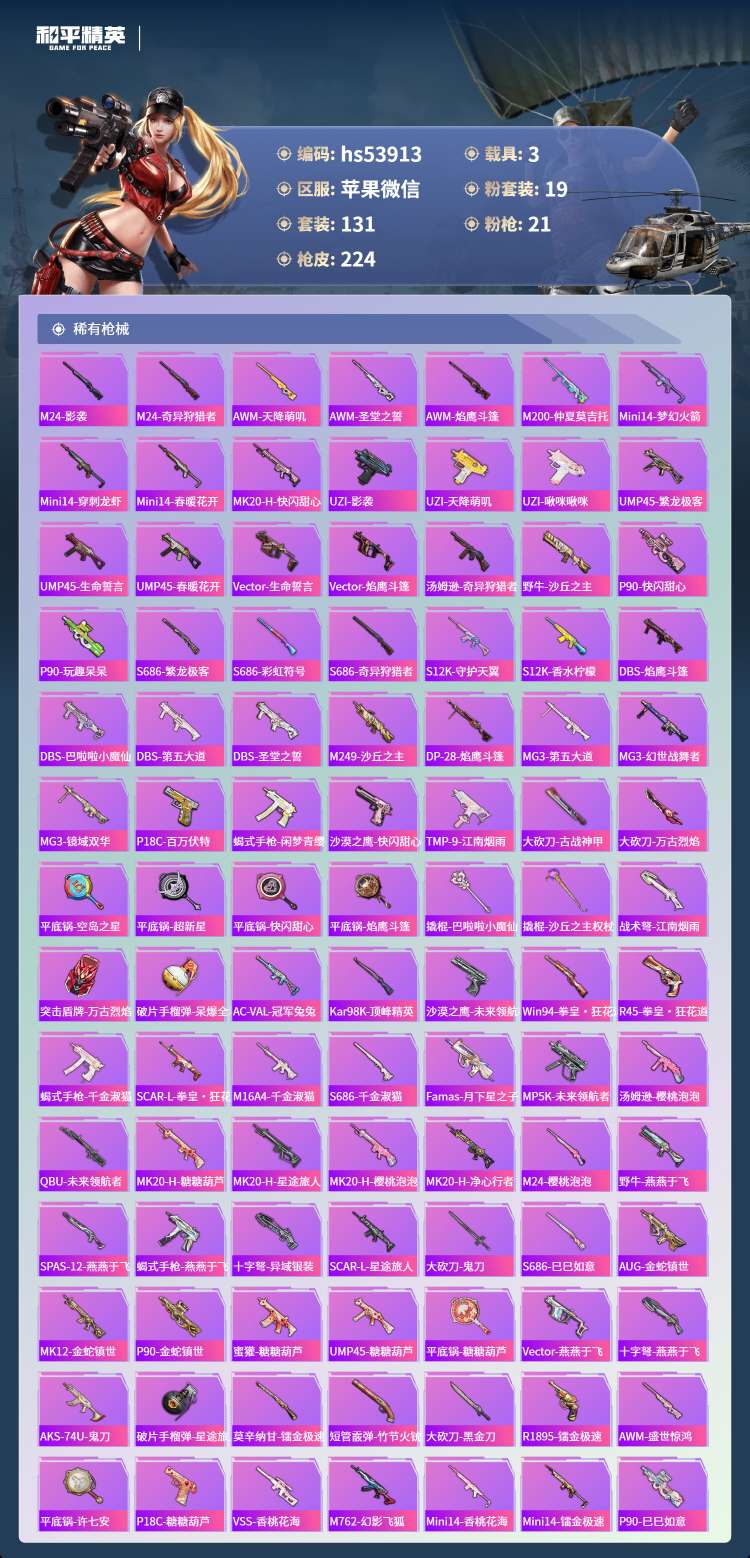 hs53913 苹果微-6王牌印记-2红装-19粉装-21特效枪-3载具-82533热力值-131