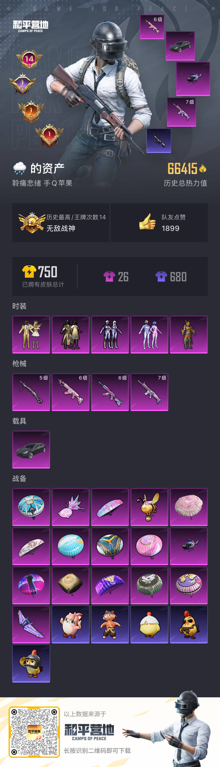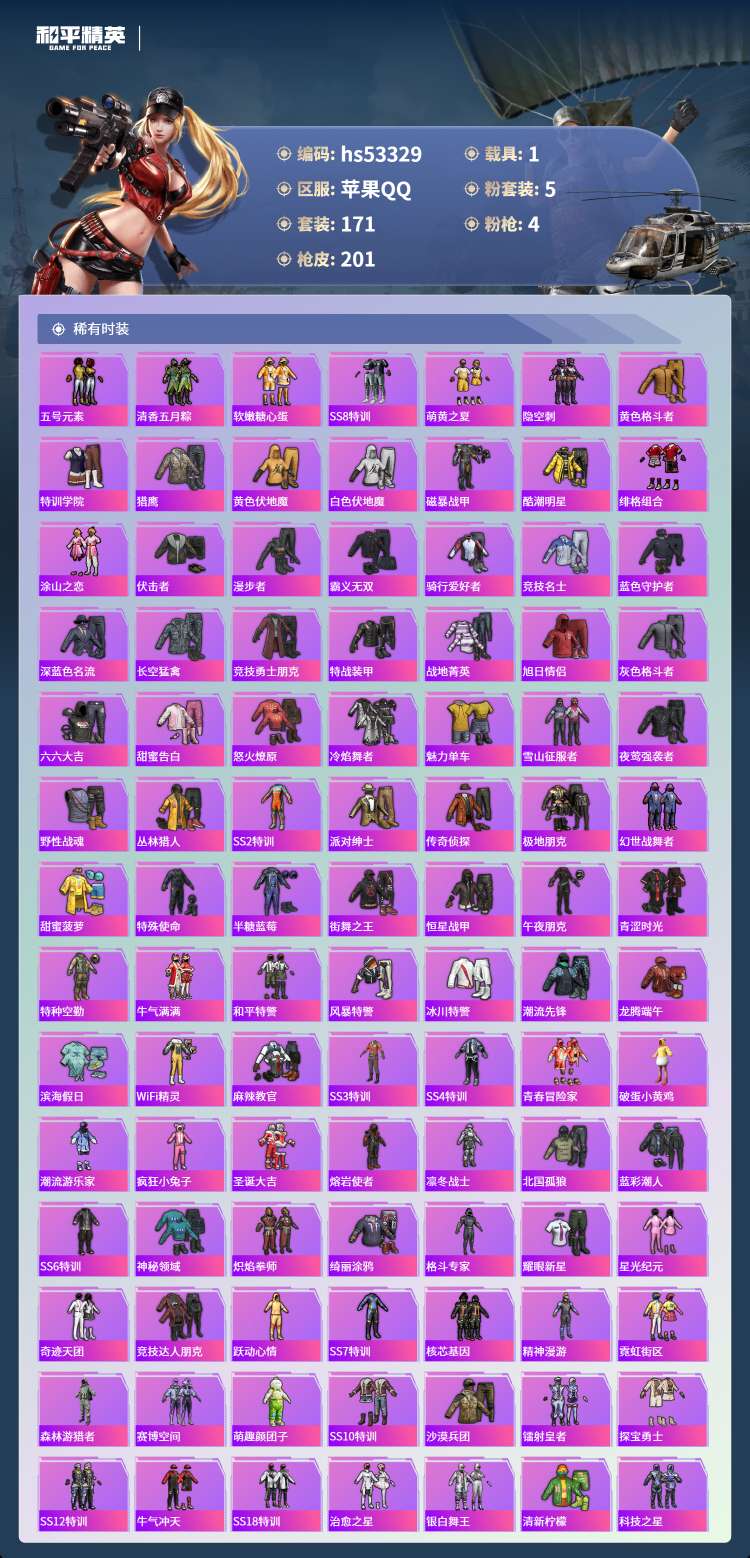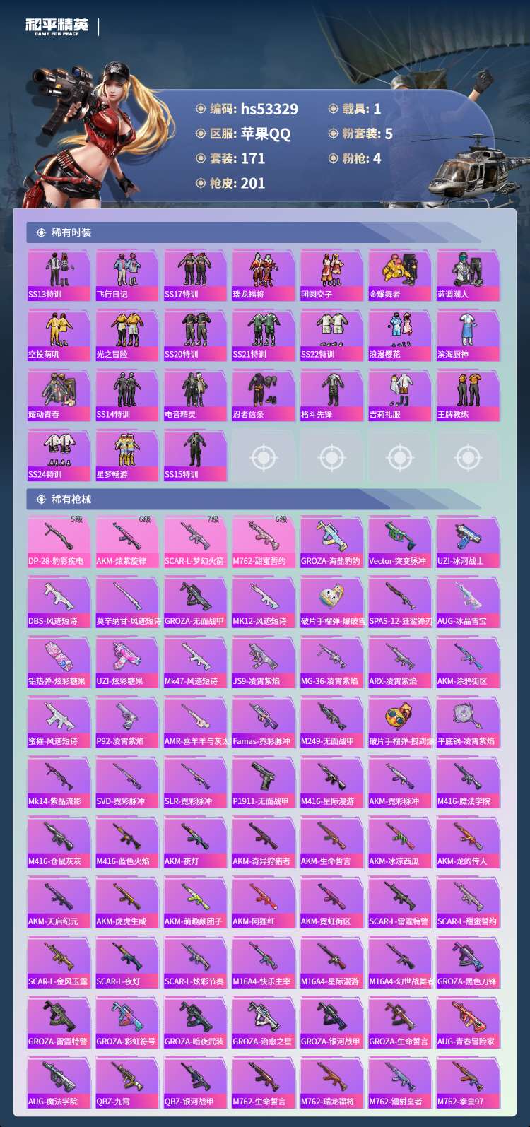 hs53329 苹果手Q-14王牌印记-有战神框-5粉装-4特效枪-1载具-66440热力值-171