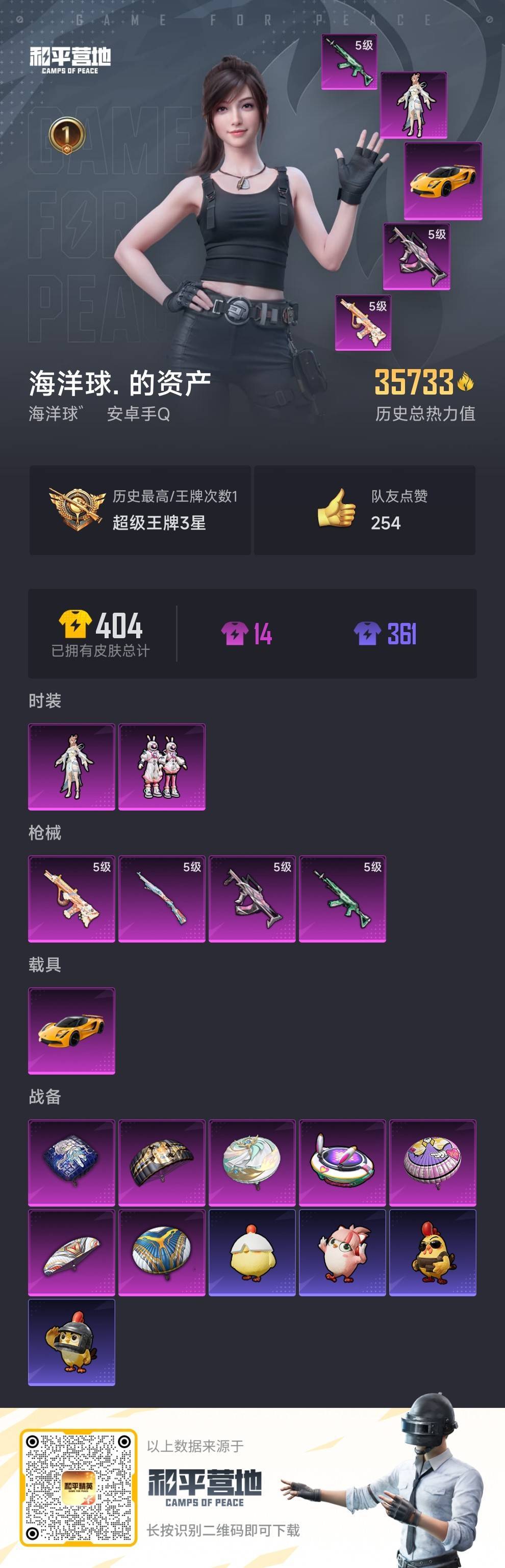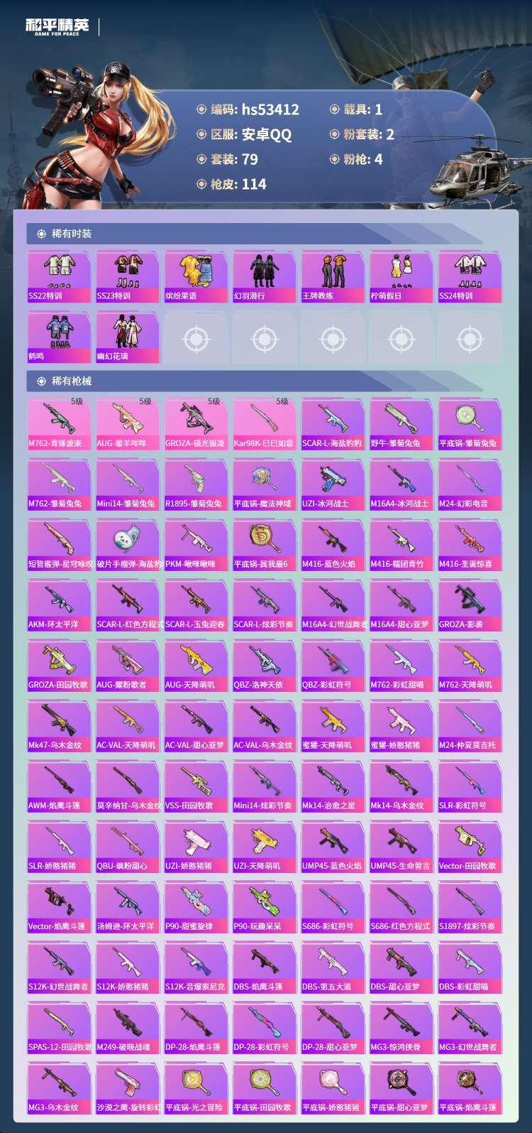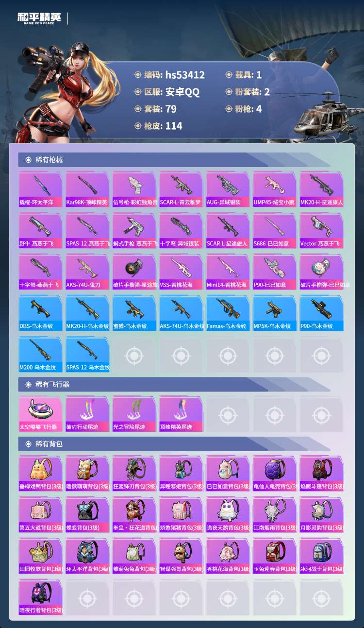 hs53412 安卓手Q-1王牌印记-2粉装-4特效枪-1载具-35733热力值-79套装-114枪