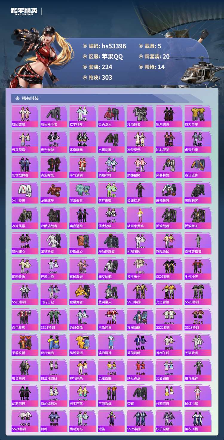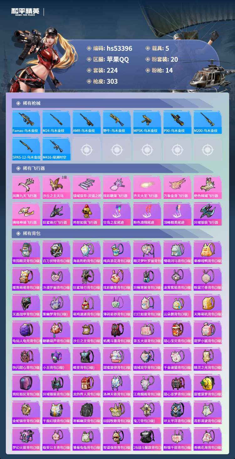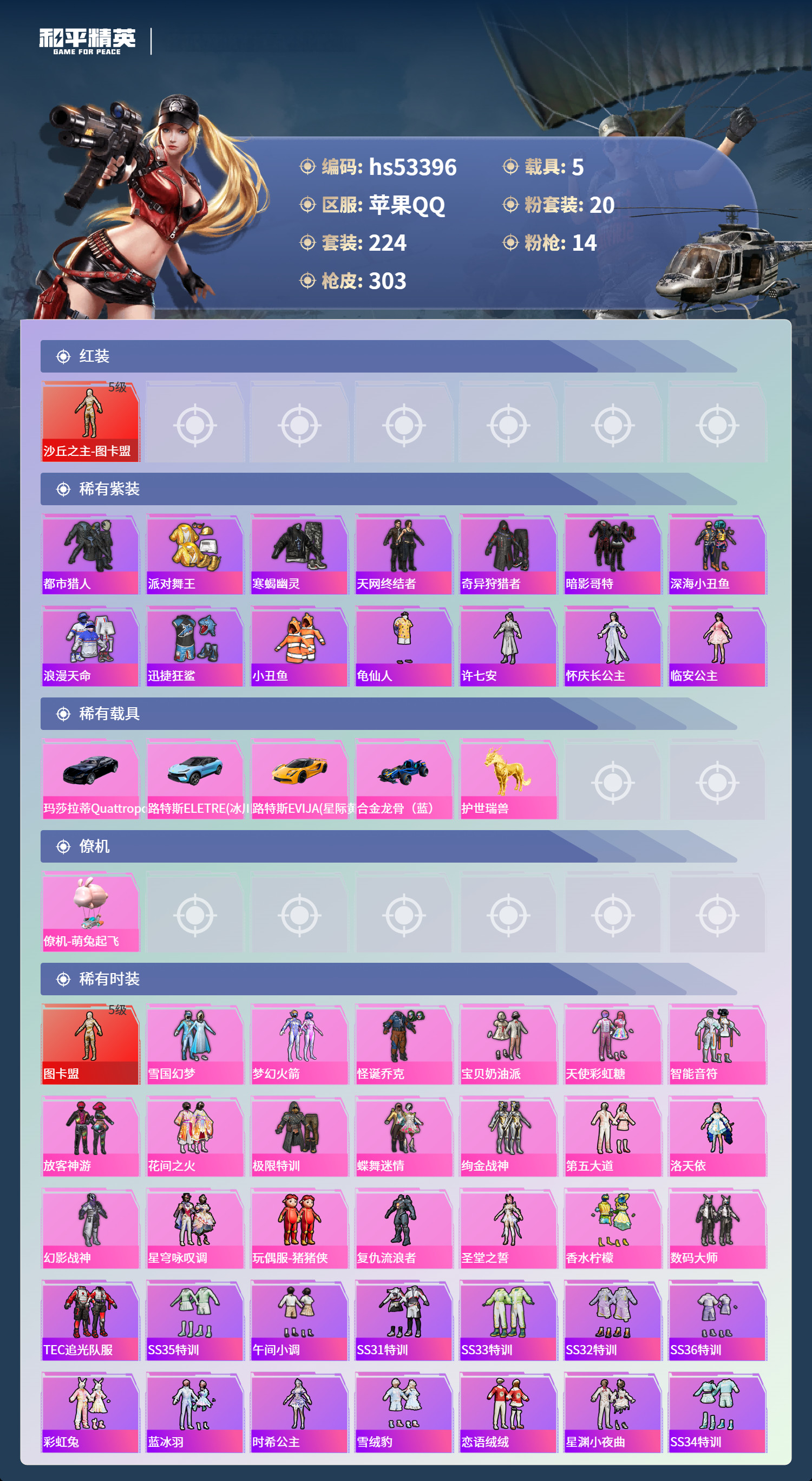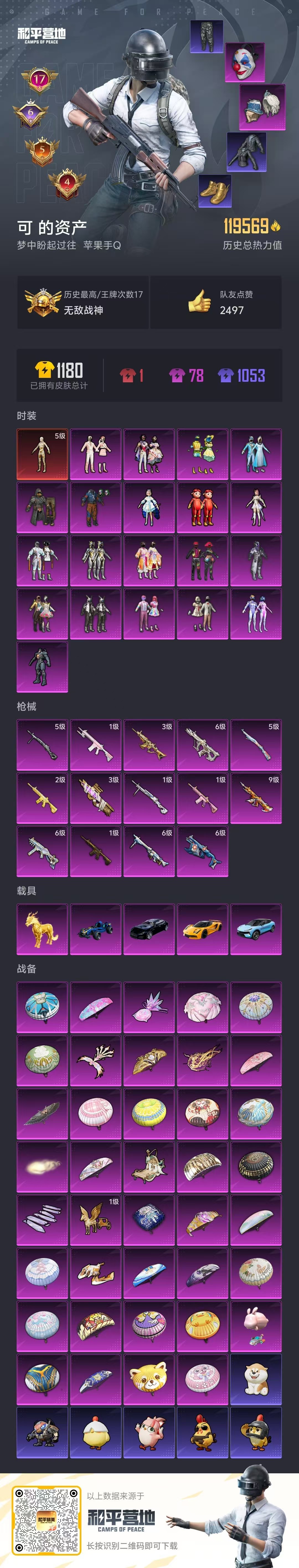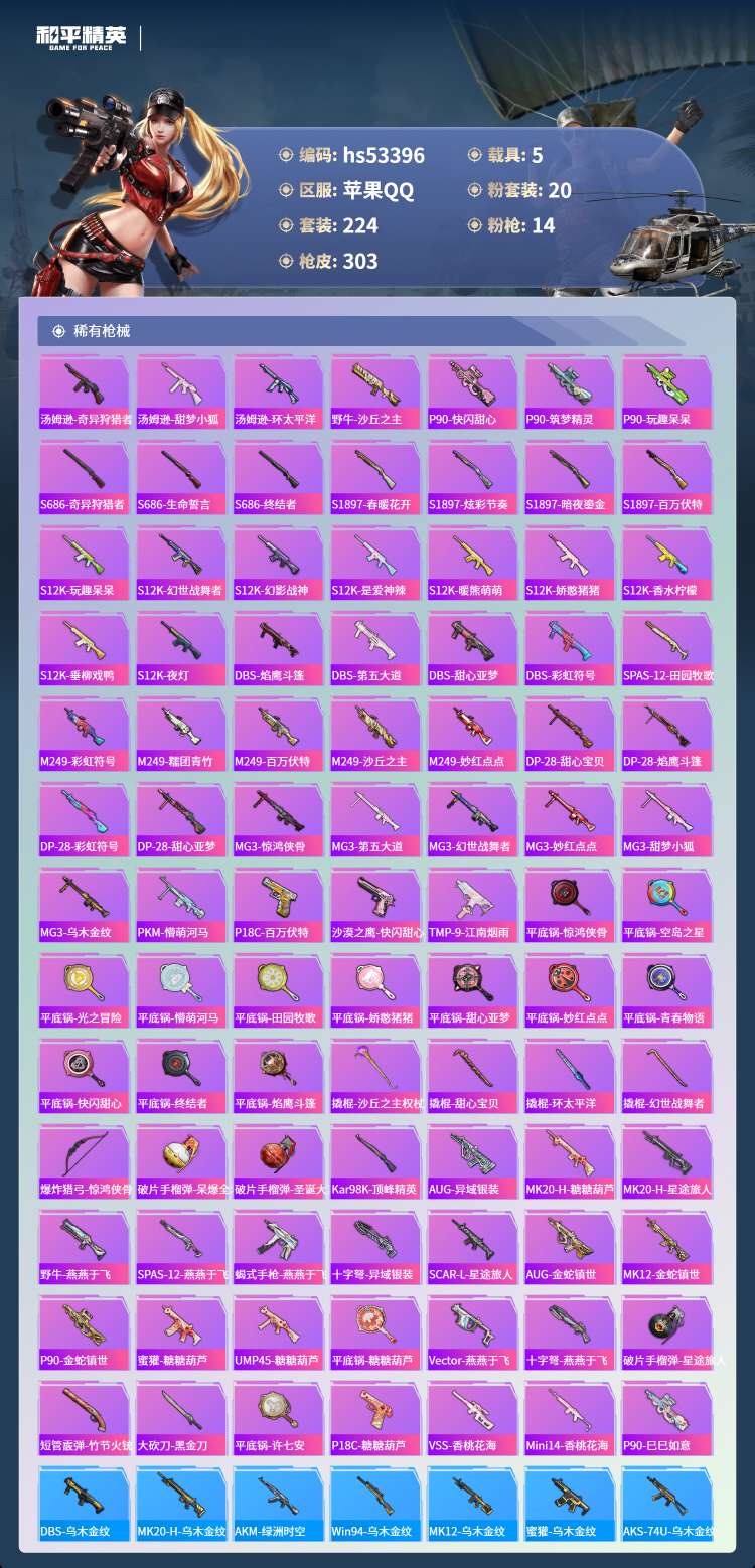 hs53396 苹果手Q-17王牌印记-有战神框-1红装-20粉装-14特效枪-5载具-119569