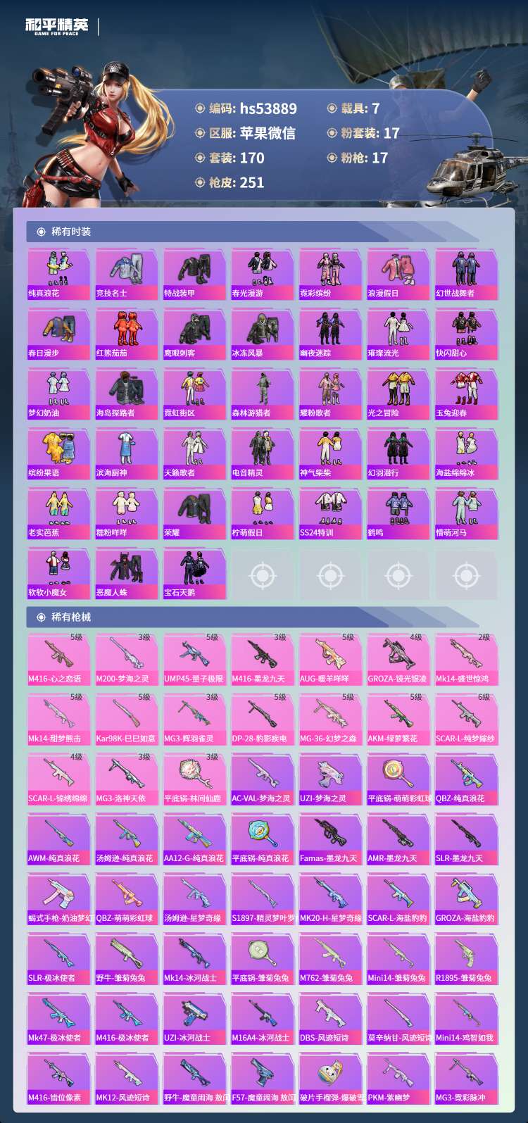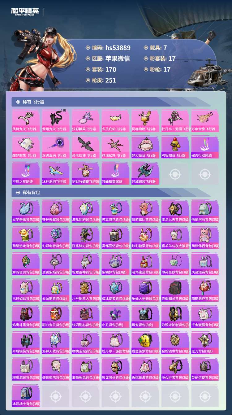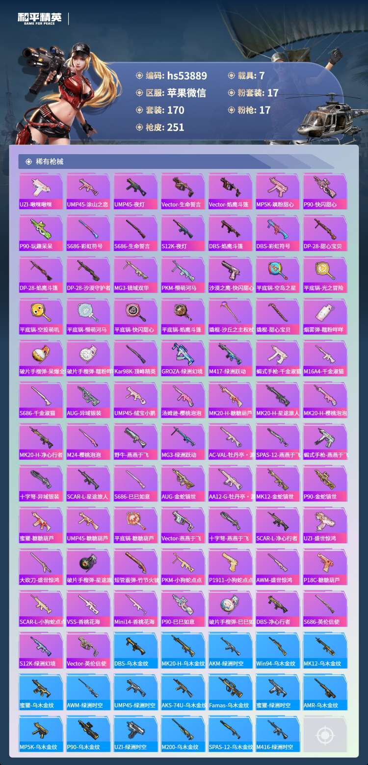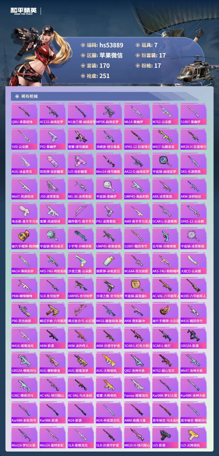 hs53889 苹果微-13王牌印记-3红装-17粉装-17特效枪-7载具-99628热力值-17