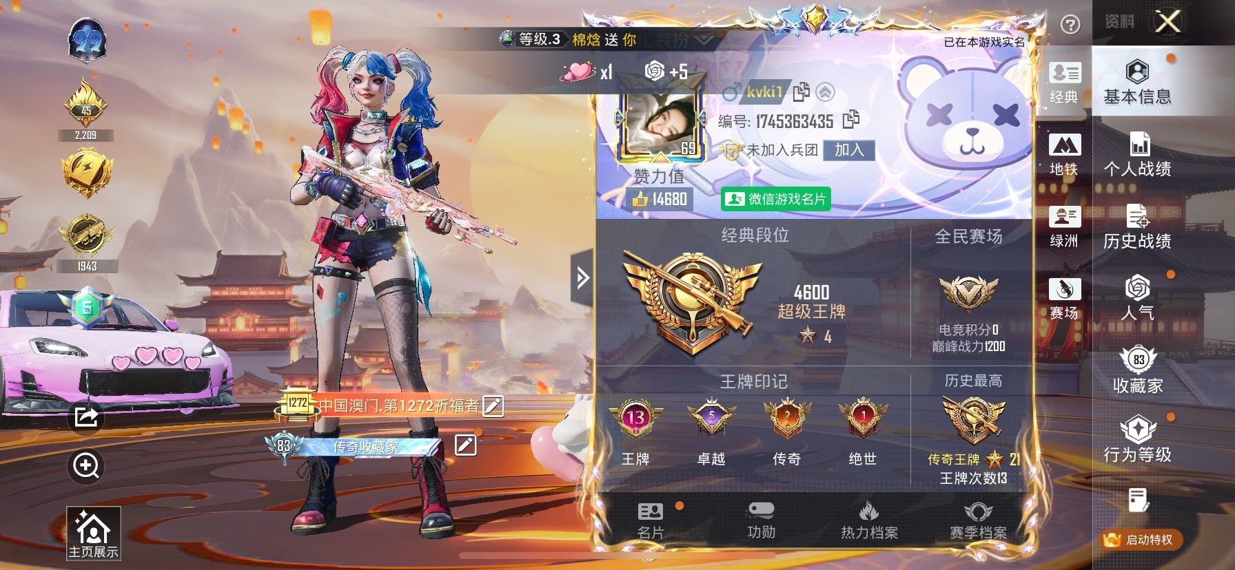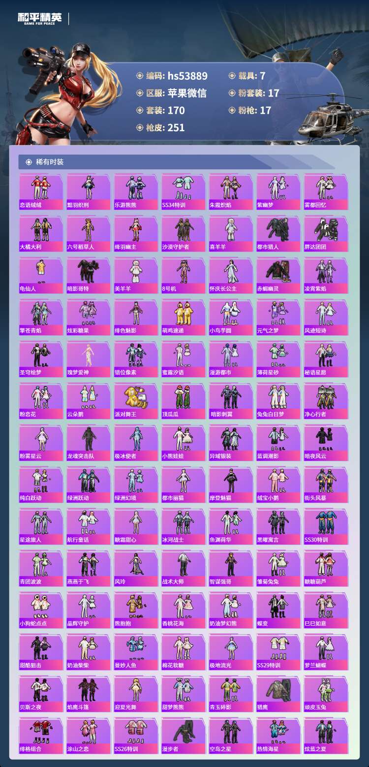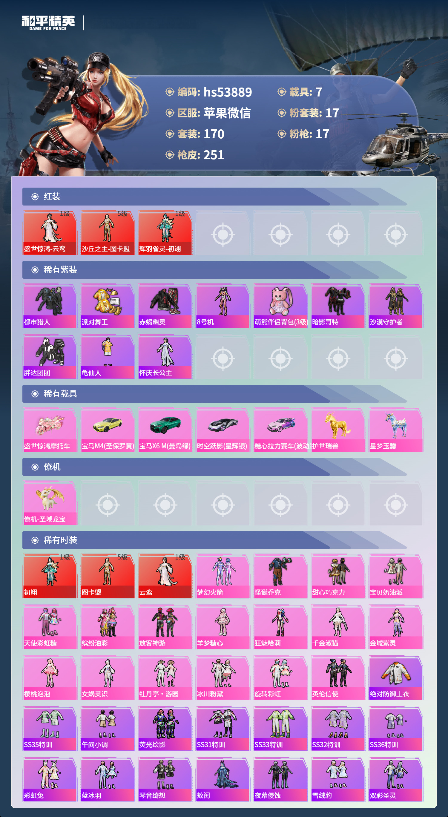 hs53889 苹果微-13王牌印记-3红装-17粉装-17特效枪-7载具-99628热力值-17