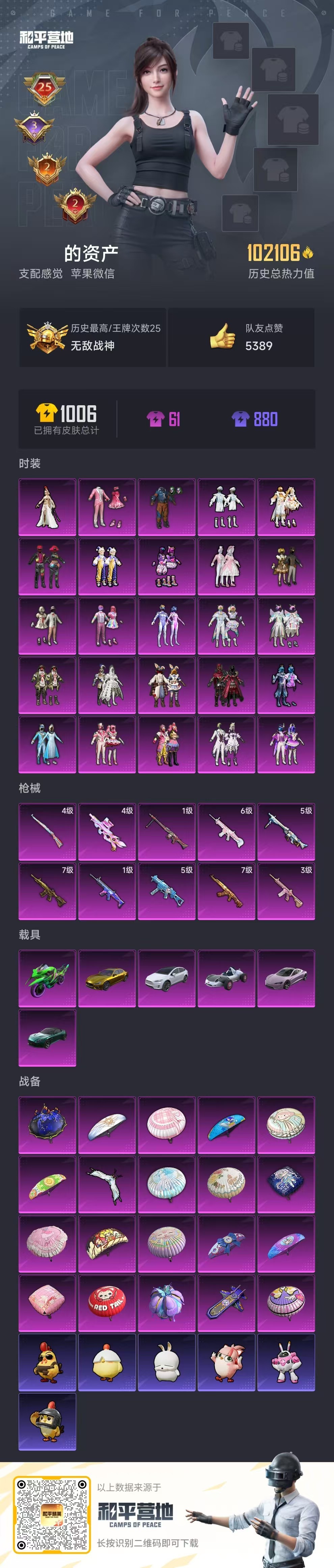 hs46845 苹果v-26王牌印记-有战神框-27粉装-11特效枪-6载具-112049热力值-