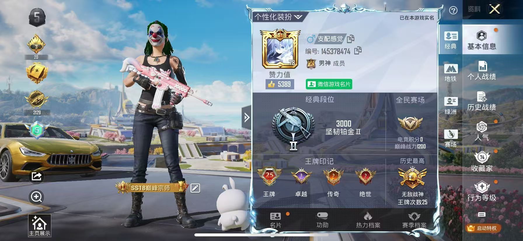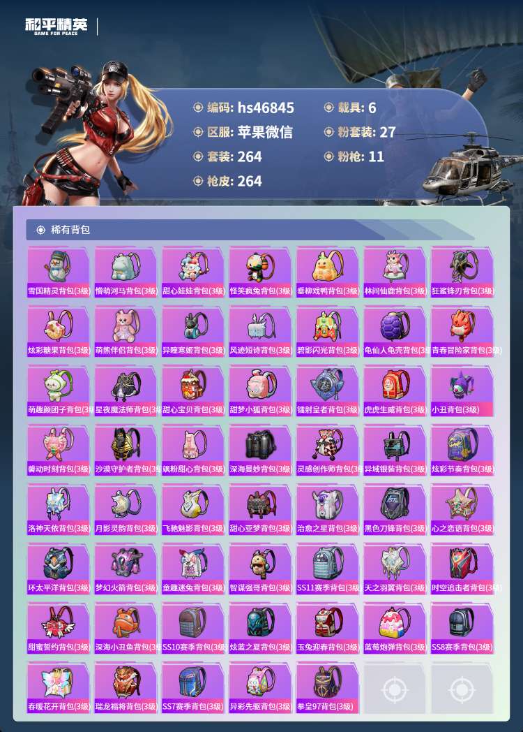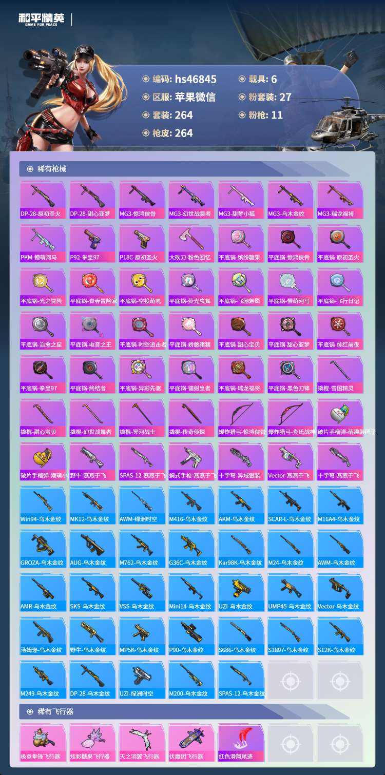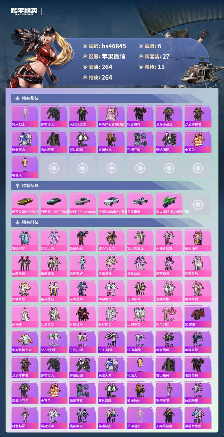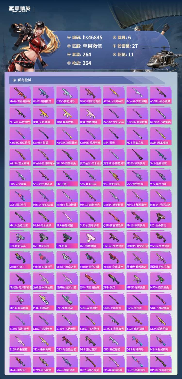 hs46845 苹果微-26王牌印记-有战神框-27粉装-11特效枪-6载具-112049热力值-