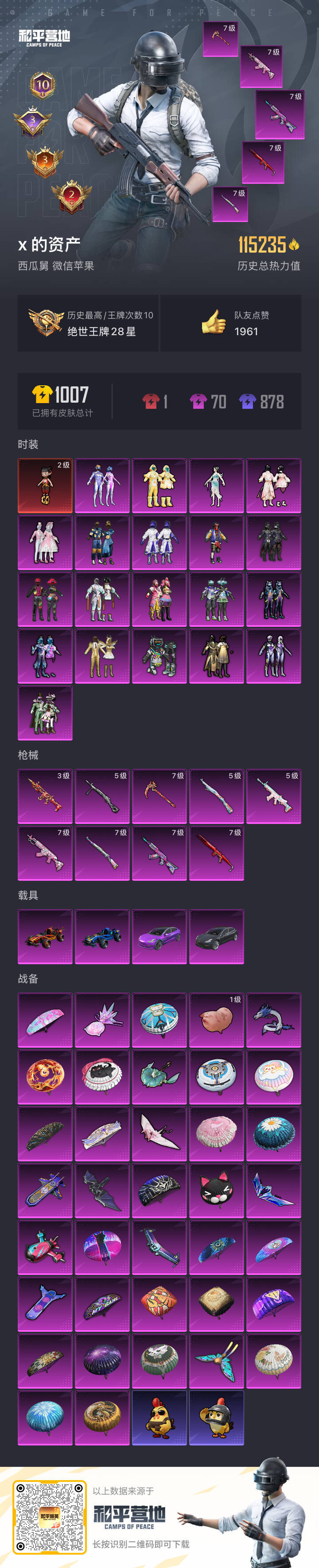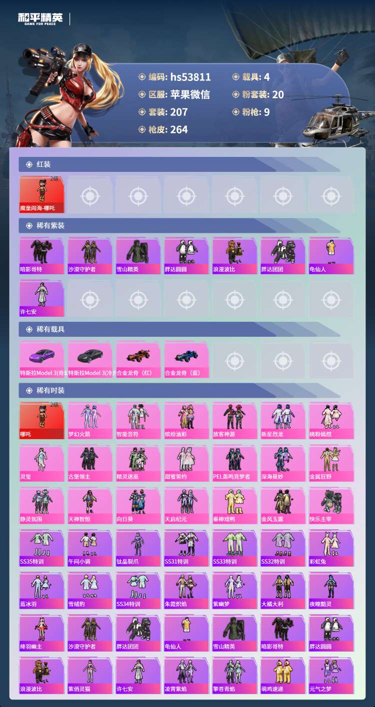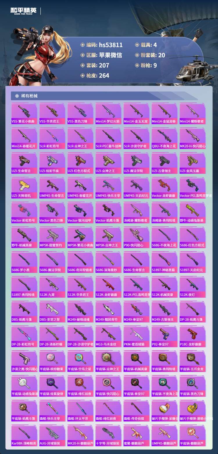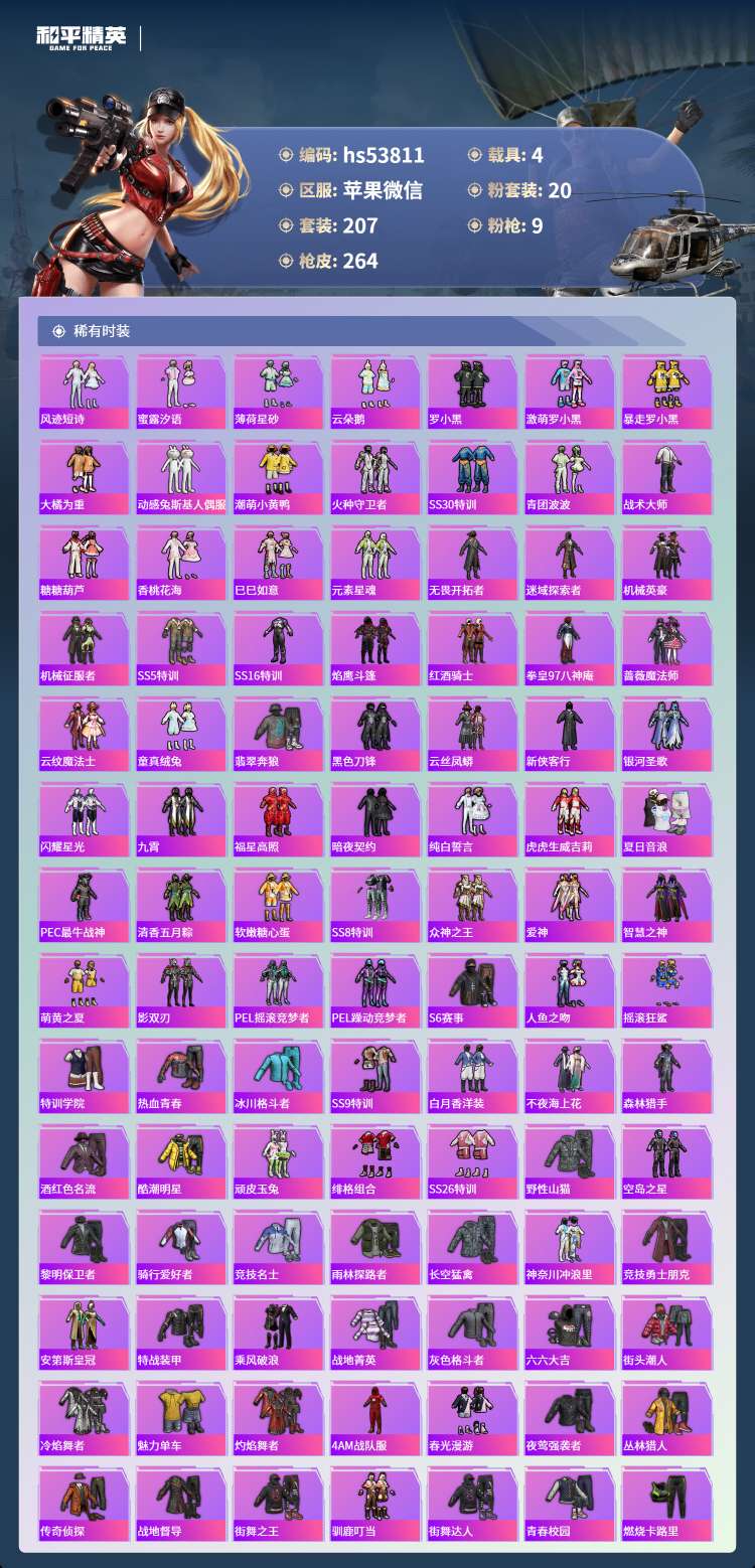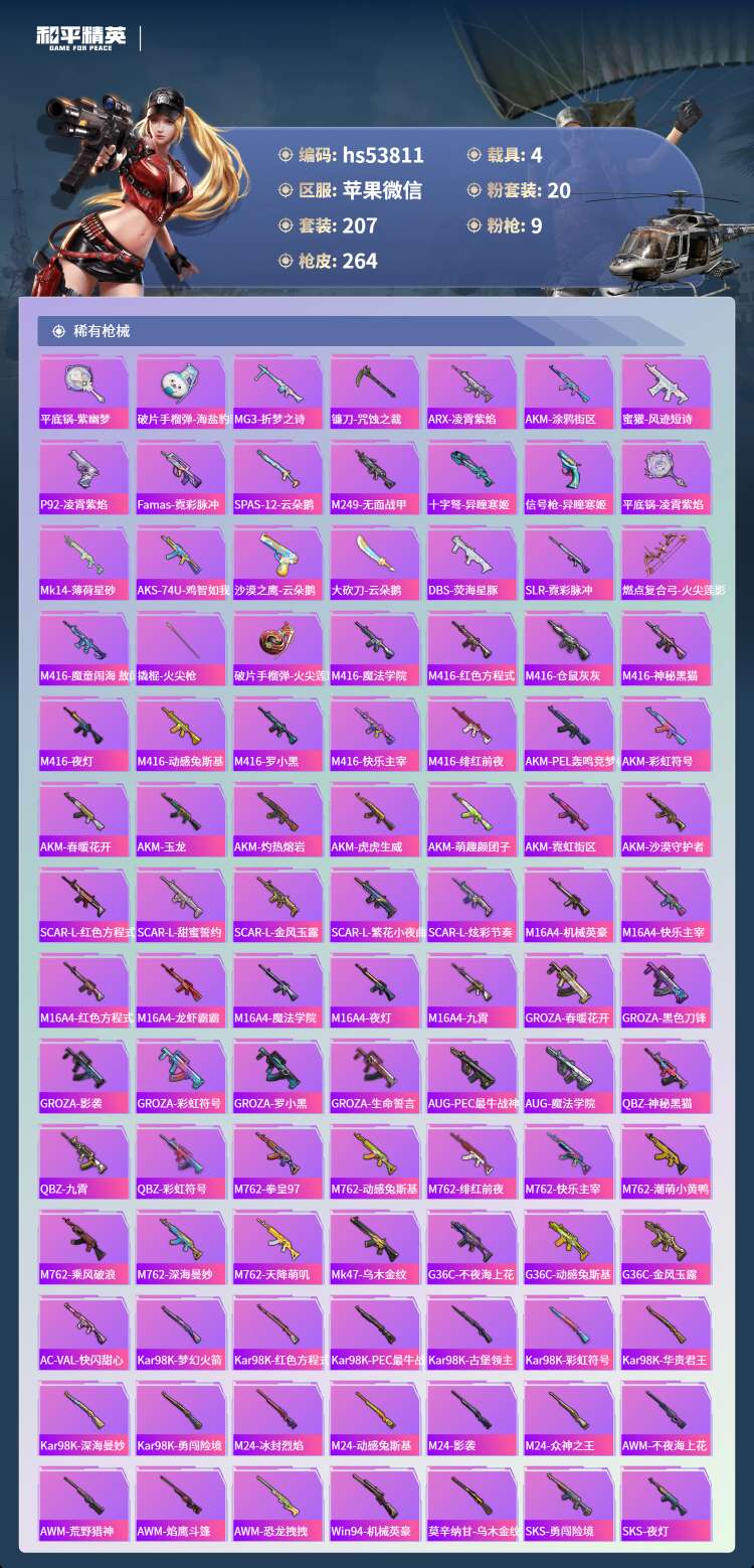 hs53811 苹果微-10王牌印记-1红装-20粉装-9特效枪-4载具-115468热力值-20