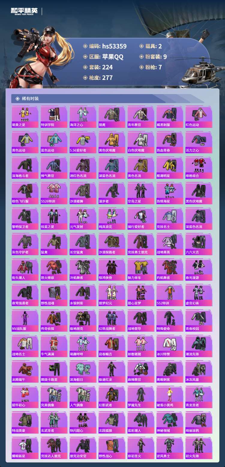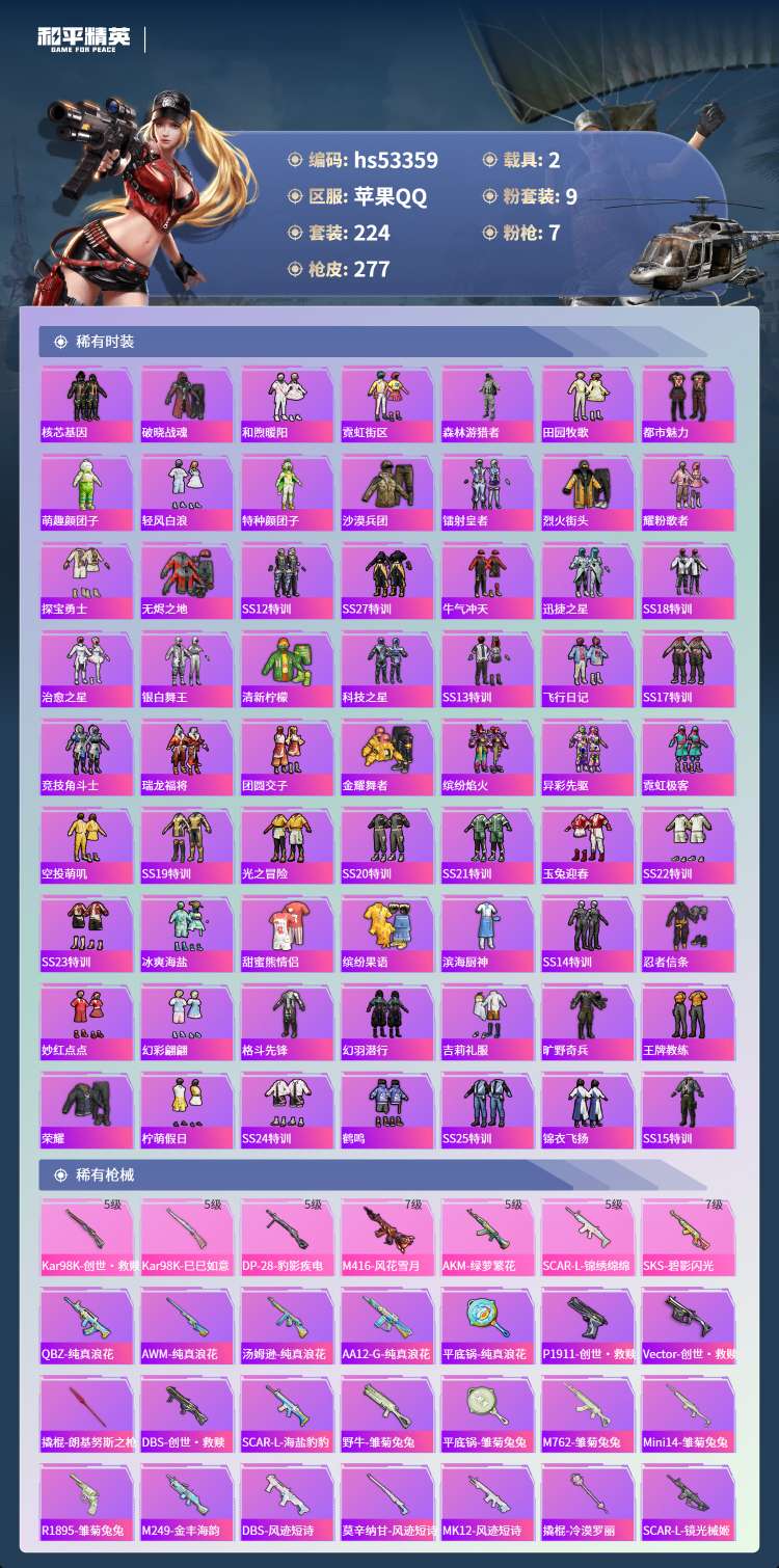 hs53359 苹果手Q-14王牌印记-9粉装-7特效枪-2载具-86207热力值-224套装-27