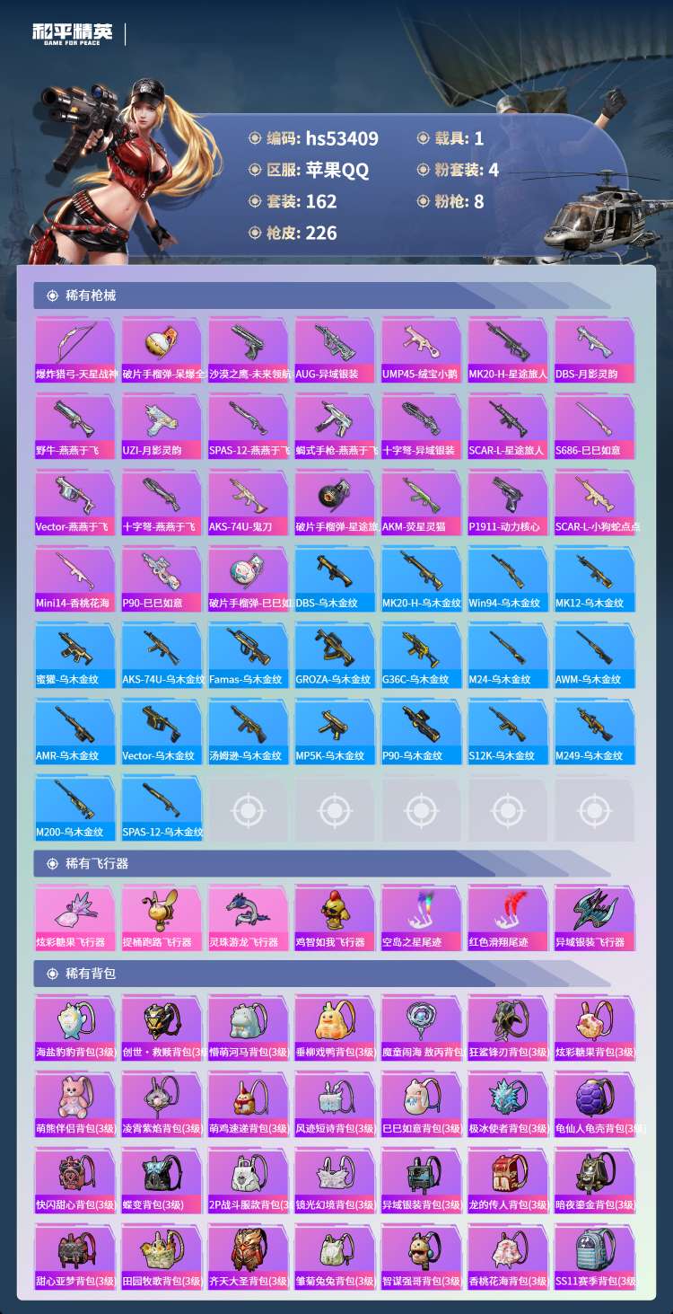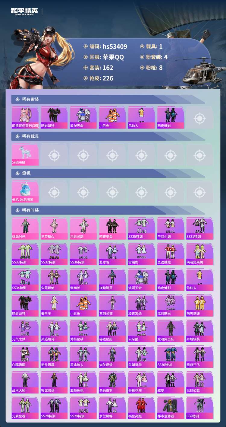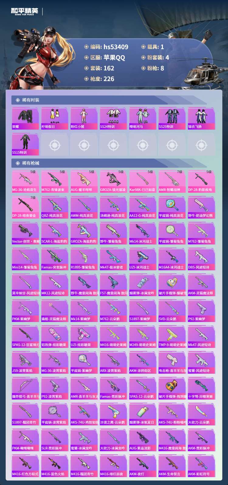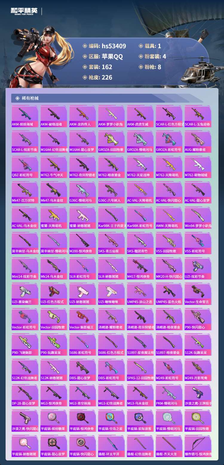 hs53409 苹果手Q-14王牌印记-4粉装-8特效枪-1载具-66883热力值-162套装-22