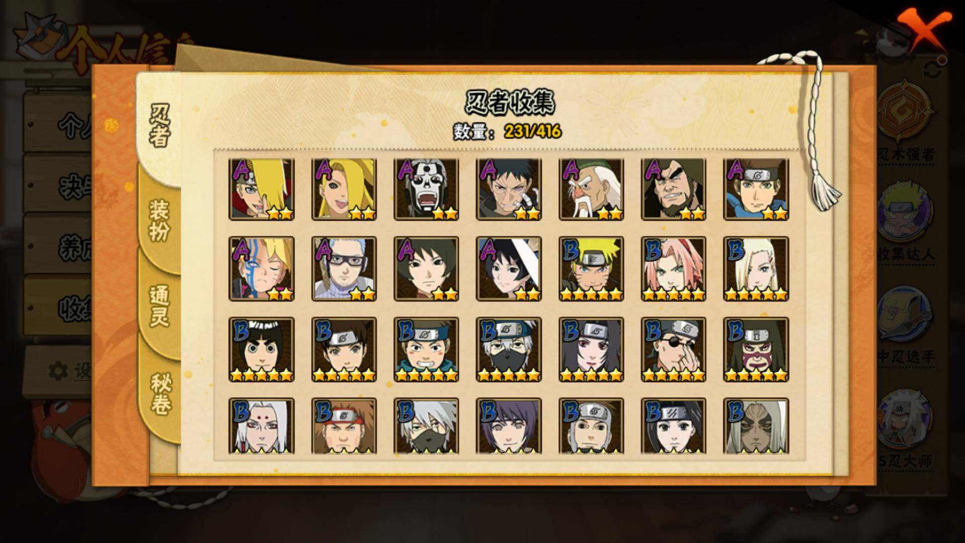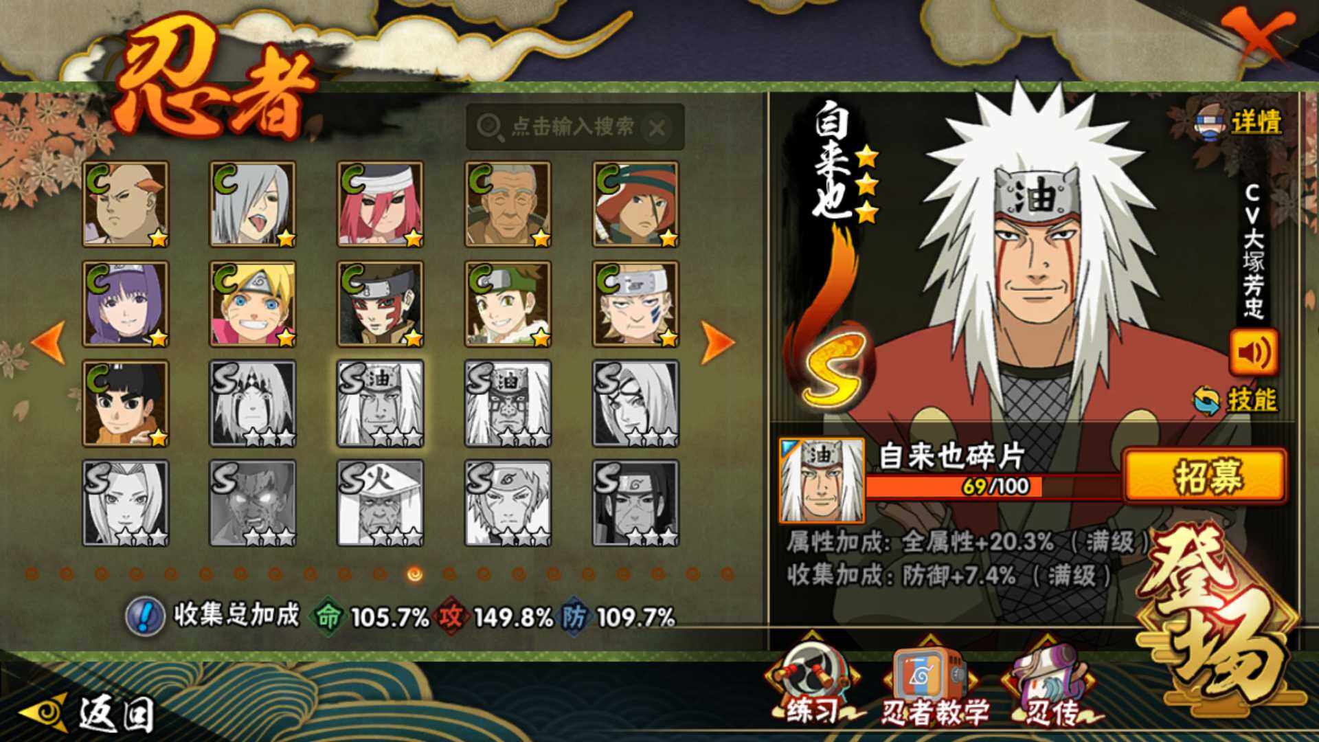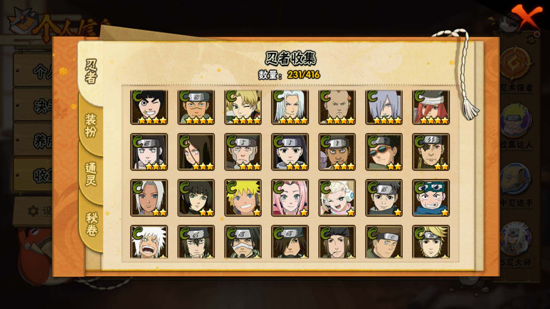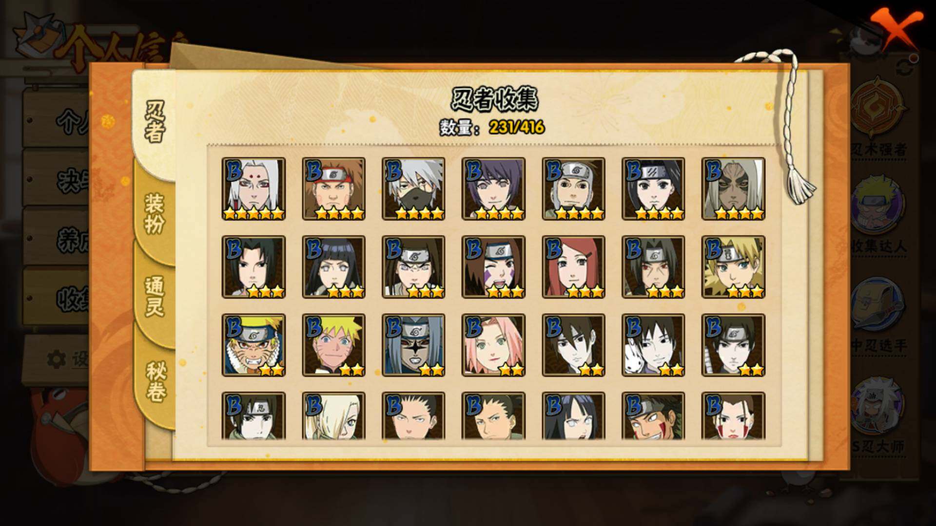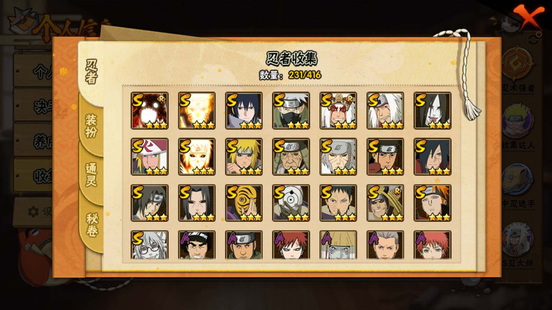 【S级忍者】:金角·银角「秽土转生」(3星),猿飞日斩「秽土转生」(3星),波风水门「秽土转生」(3星),千手扉间「秽土转生」(3星),宇智波鼬「秽土转生」(3星),宇智波斑「秽土转生·解」(3星),宇智波带土「忍界大战」(3星),宇智波鼬「须佐能乎」(3星),旗木卡卡西「须佐能乎」(3星),自来也「舞之豪杰」(3星),