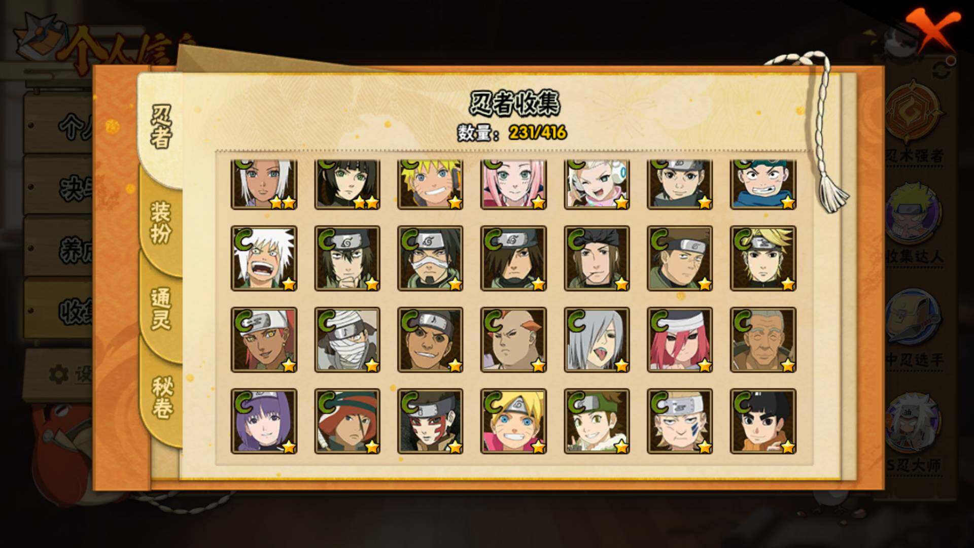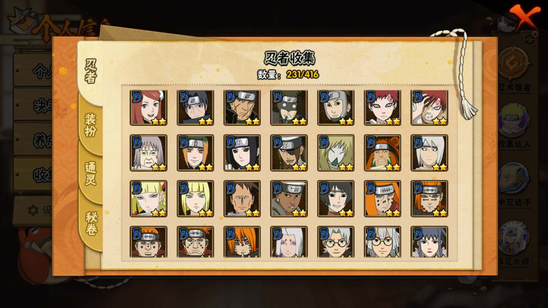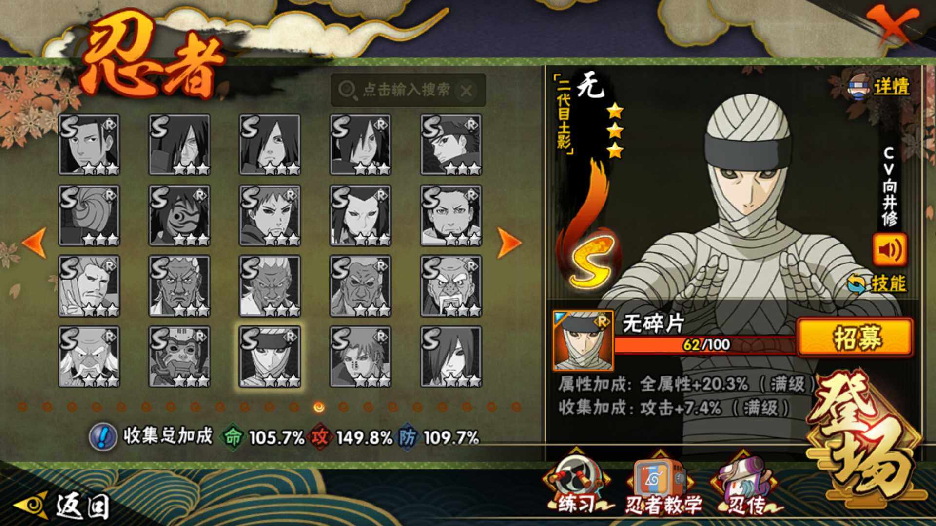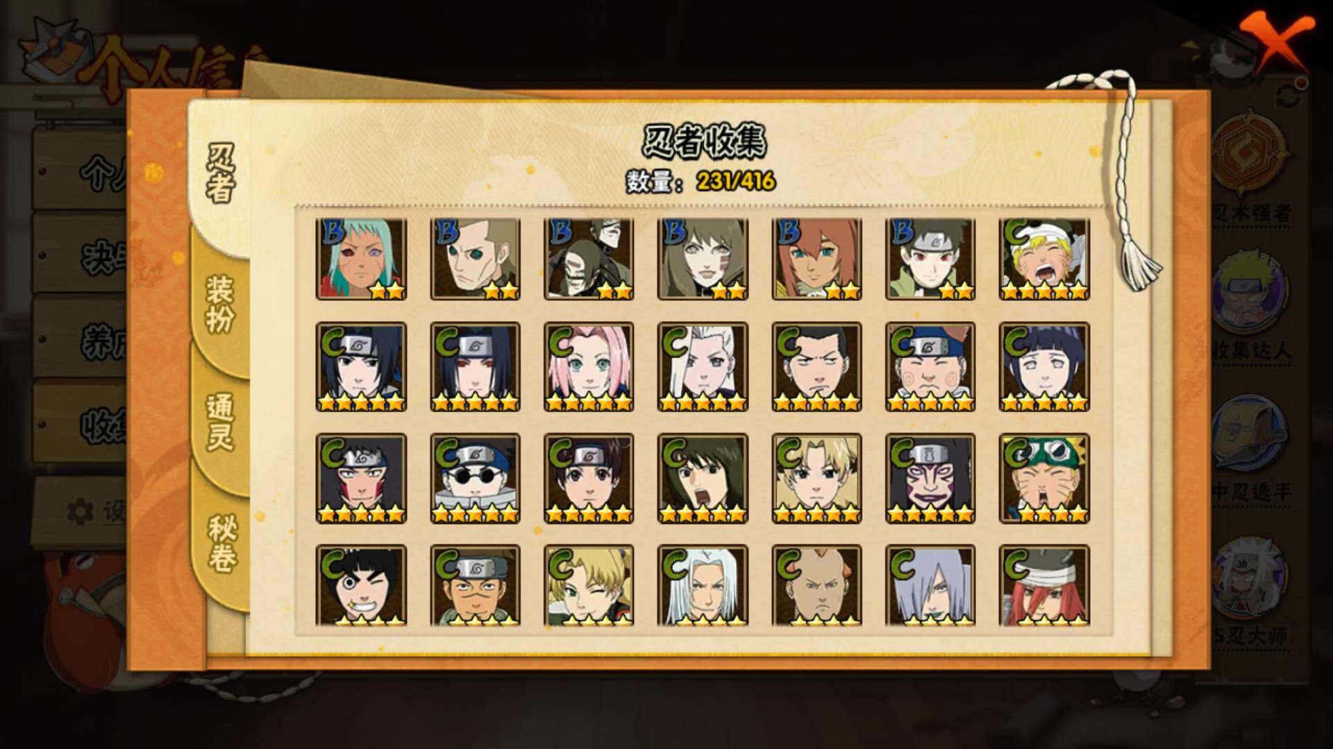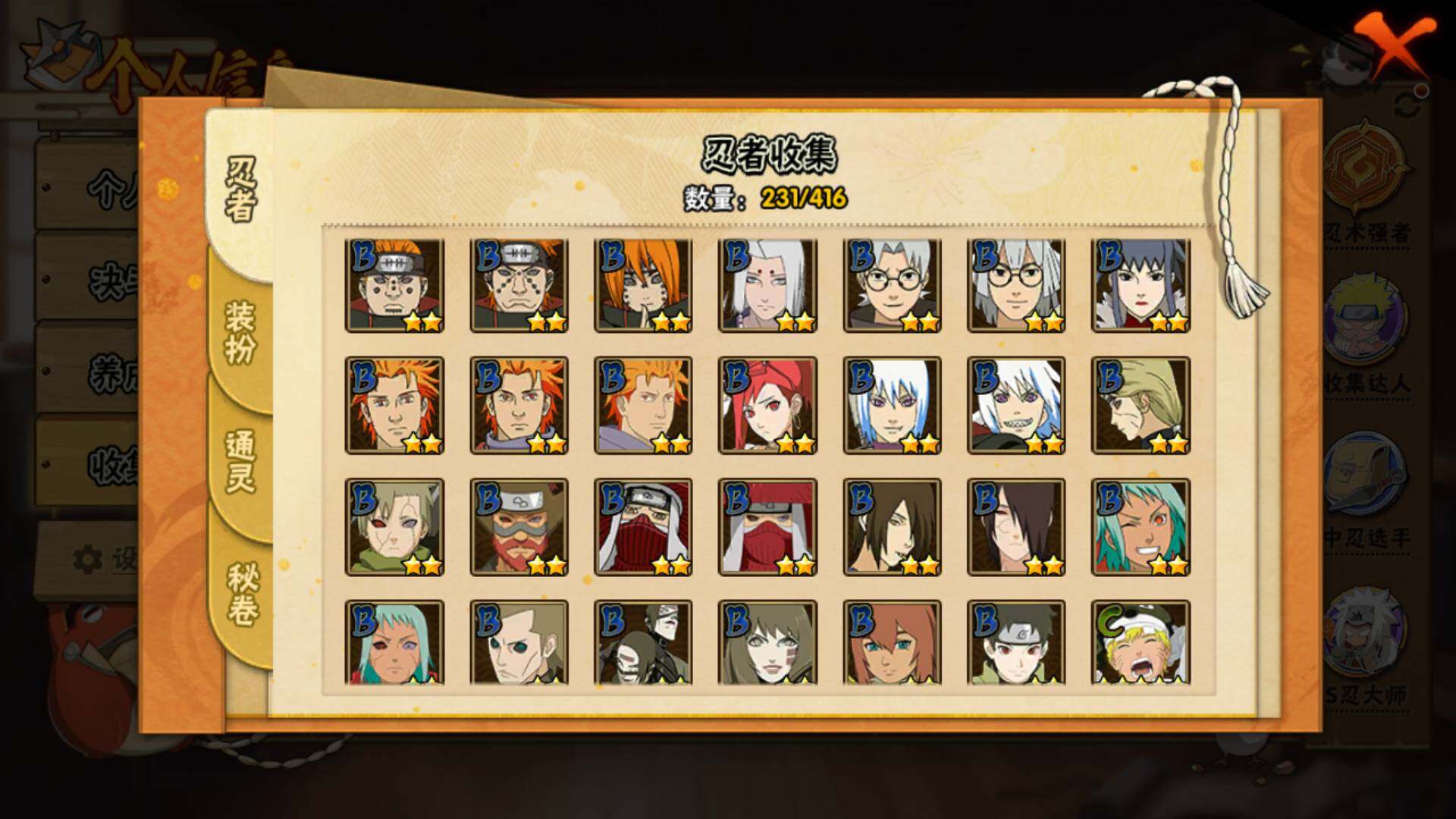 【S级忍者】:金角·银角「秽土转生」(3星),猿飞日斩「秽土转生」(3星),波风水门「秽土转生」(3星),千手扉间「秽土转生」(3星),宇智波鼬「秽土转生」(3星),宇智波斑「秽土转生·解」(3星),宇智波带土「忍界大战」(3星),宇智波鼬「须佐能乎」(3星),旗木卡卡西「须佐能乎」(3星),自来也「舞之豪杰」(3星),