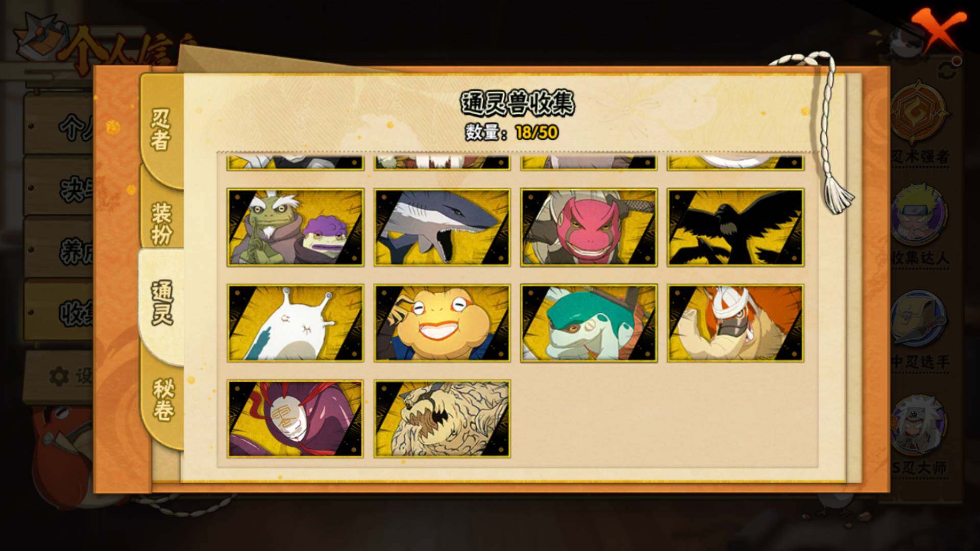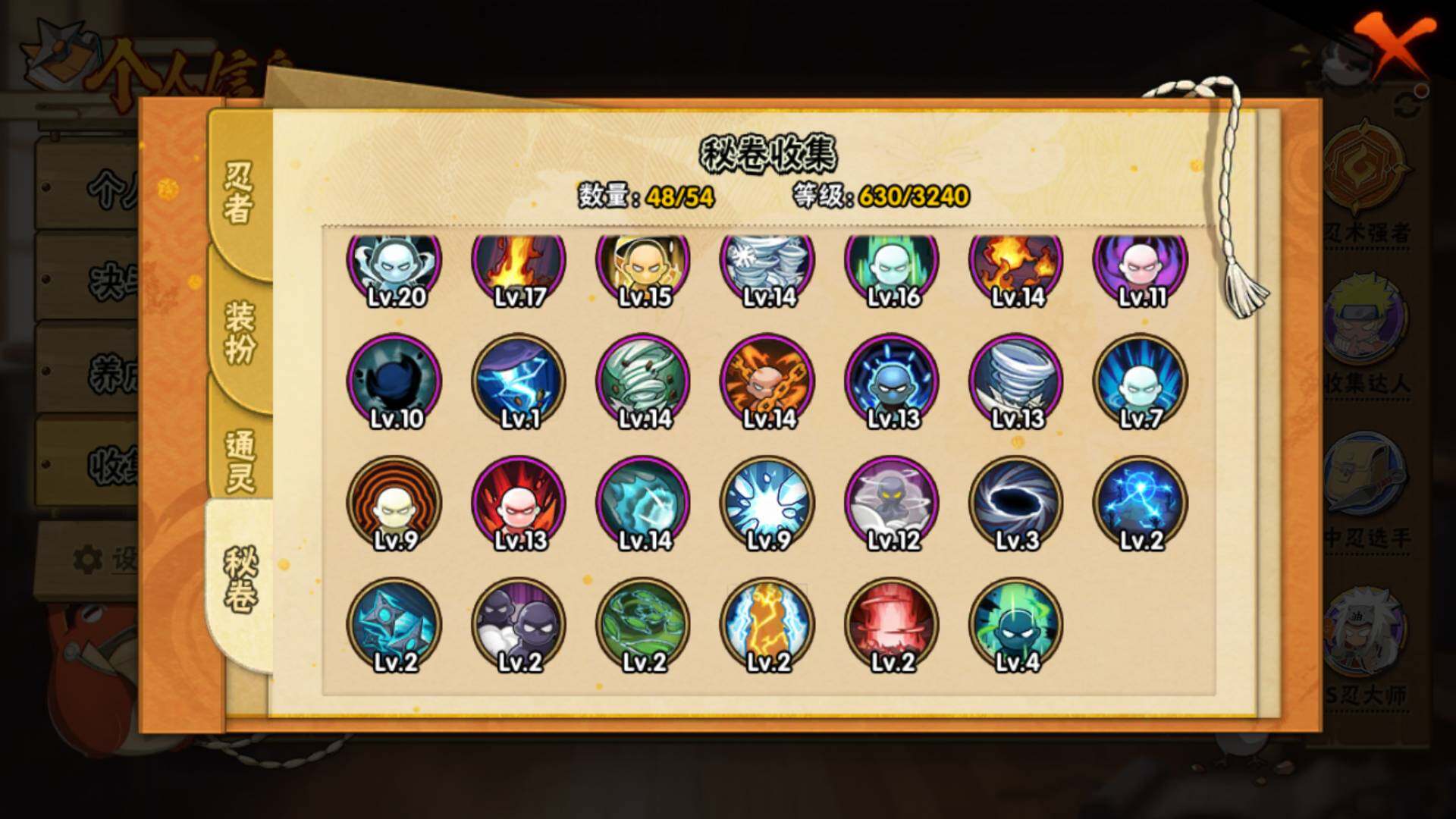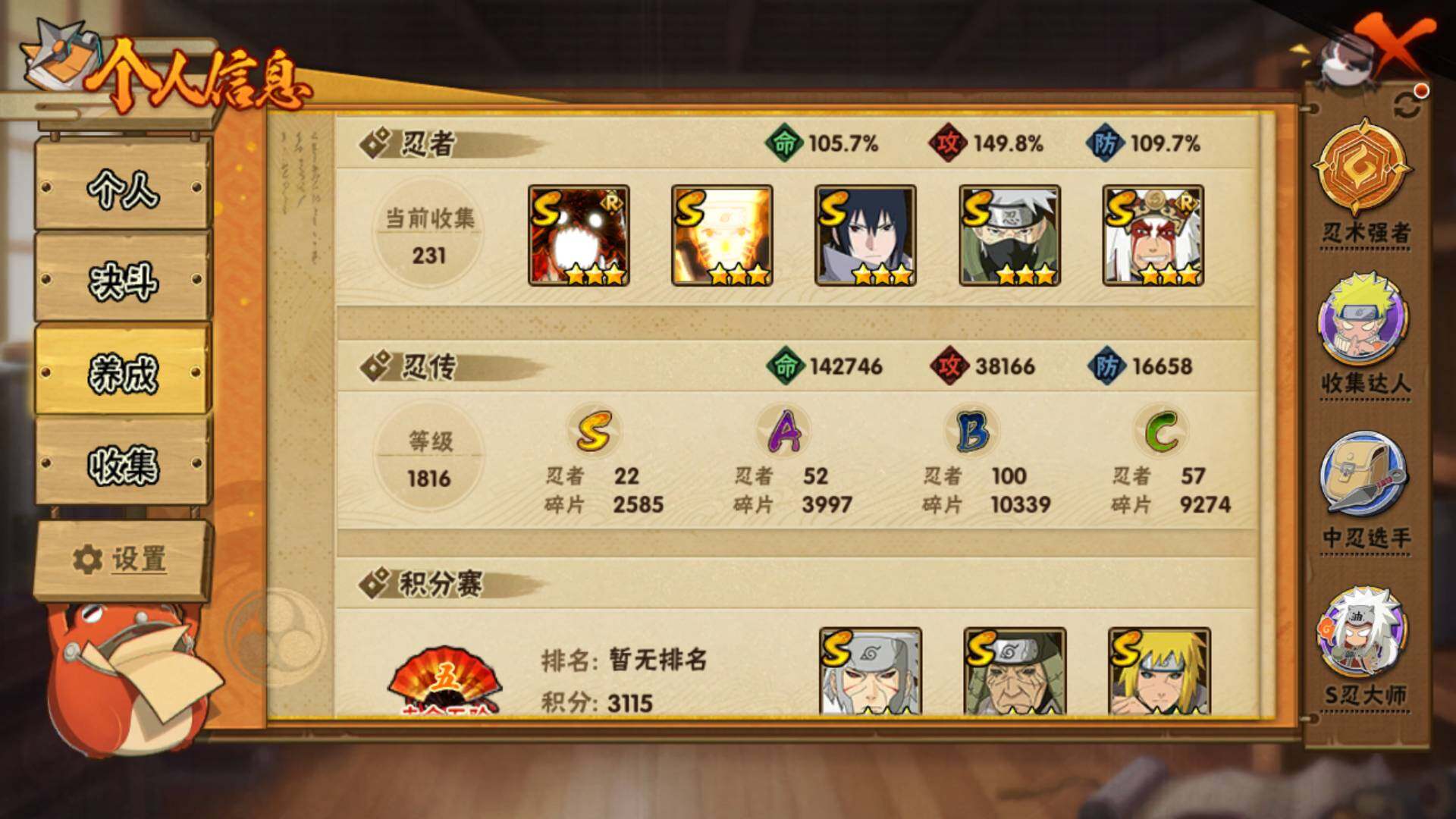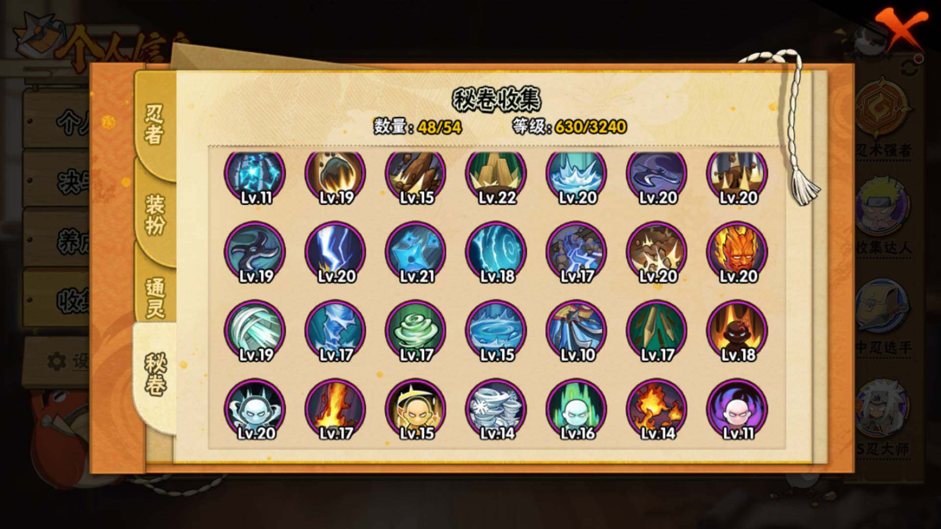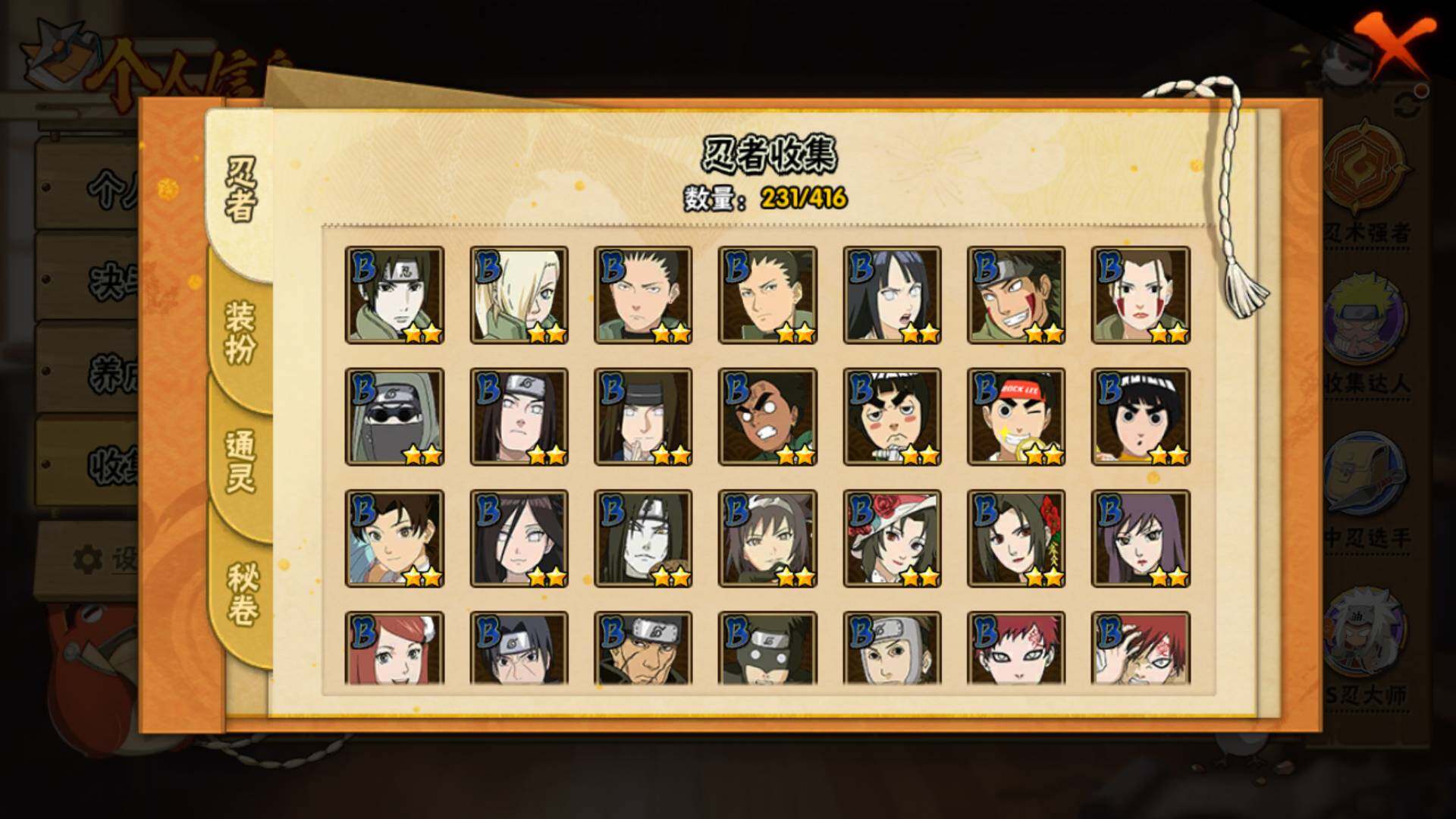 【S级忍者】:金角·银角「秽土转生」(3星),猿飞日斩「秽土转生」(3星),波风水门「秽土转生」(3星),千手扉间「秽土转生」(3星),宇智波鼬「秽土转生」(3星),宇智波斑「秽土转生·解」(3星),宇智波带土「忍界大战」(3星),宇智波鼬「须佐能乎」(3星),旗木卡卡西「须佐能乎」(3星),自来也「舞之豪杰」(3星),