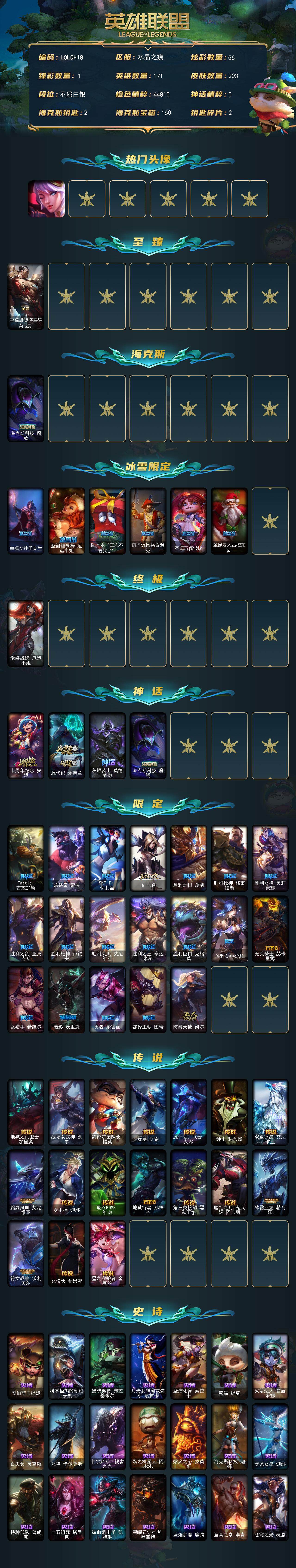 【LOLQH18】171英雄/203皮肤/1终极/5神话/25限定/1臻彩/56炫彩/17传说/58史诗/白银账号等级:439/觅心之翼奎因头像/至臻凯旋将军德莱厄斯/魔女阿卡丽虚荣/海克斯科技魔腾/幸福女神乐芙兰/圣诞糖果棒厄运小姐/阿木木“主人不要我了”/英勇玩具兵普朗克/圣诞玩偶波比/圣诞老人古拉加斯/武装战姬厄运小姐/十周年纪念安妮/源代码乐芙兰/灰烬骑士莫德凯撒/Fnatic古拉加斯/暗杀星蒙多/SKTT1伊莉丝/iG卡莎/胜利之树茂凯/胜利枪神格雷福斯/胜利女神奥莉安娜/胜利之剑亚托