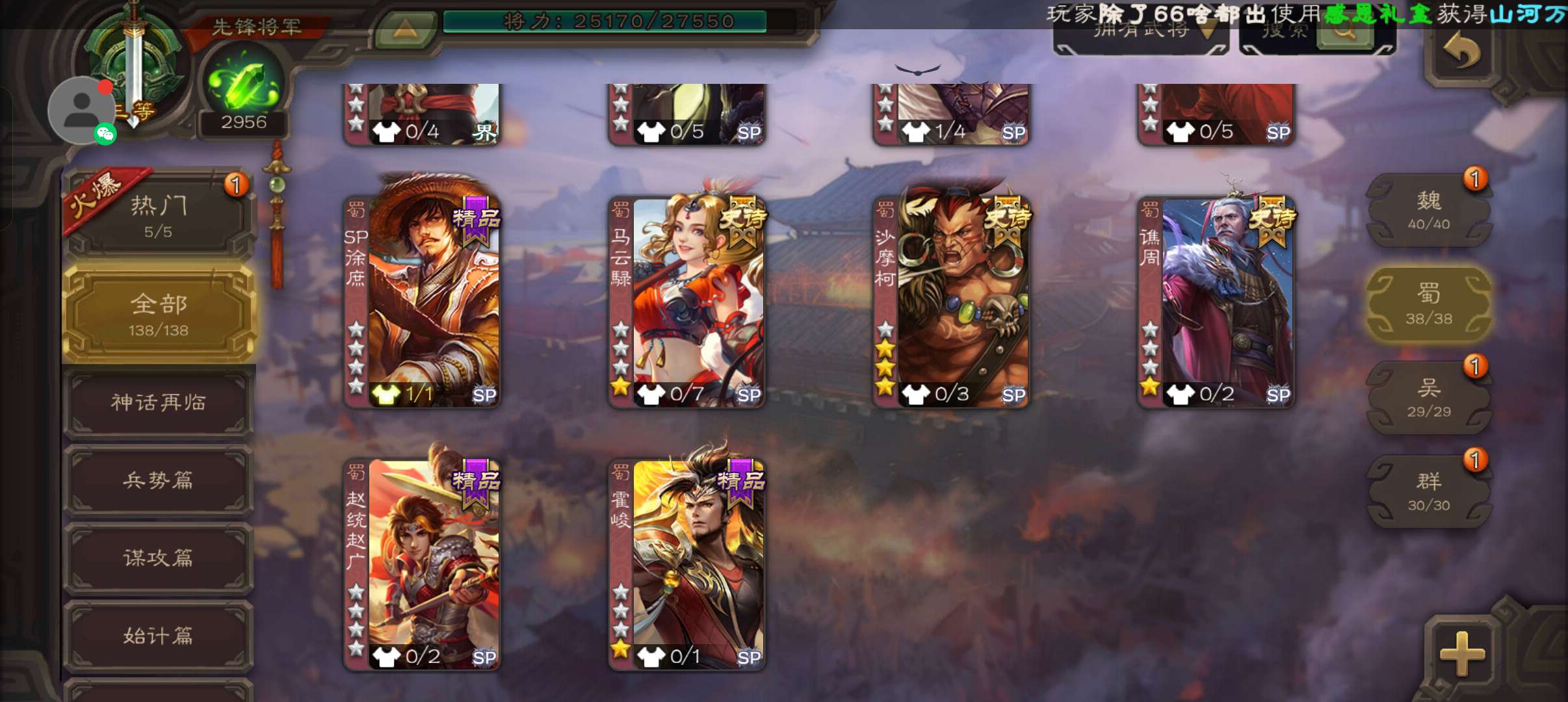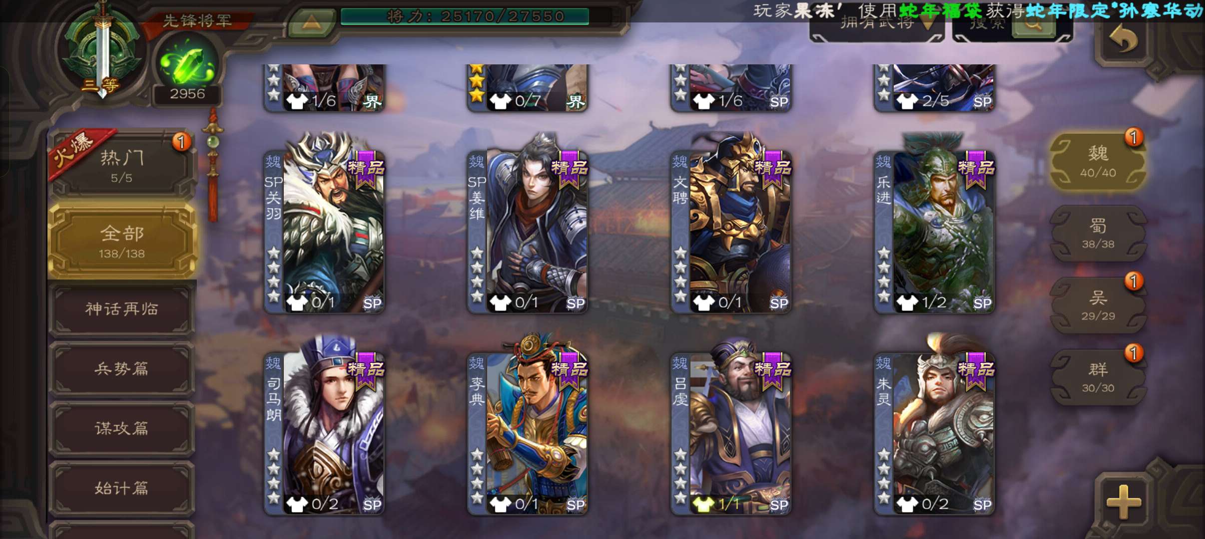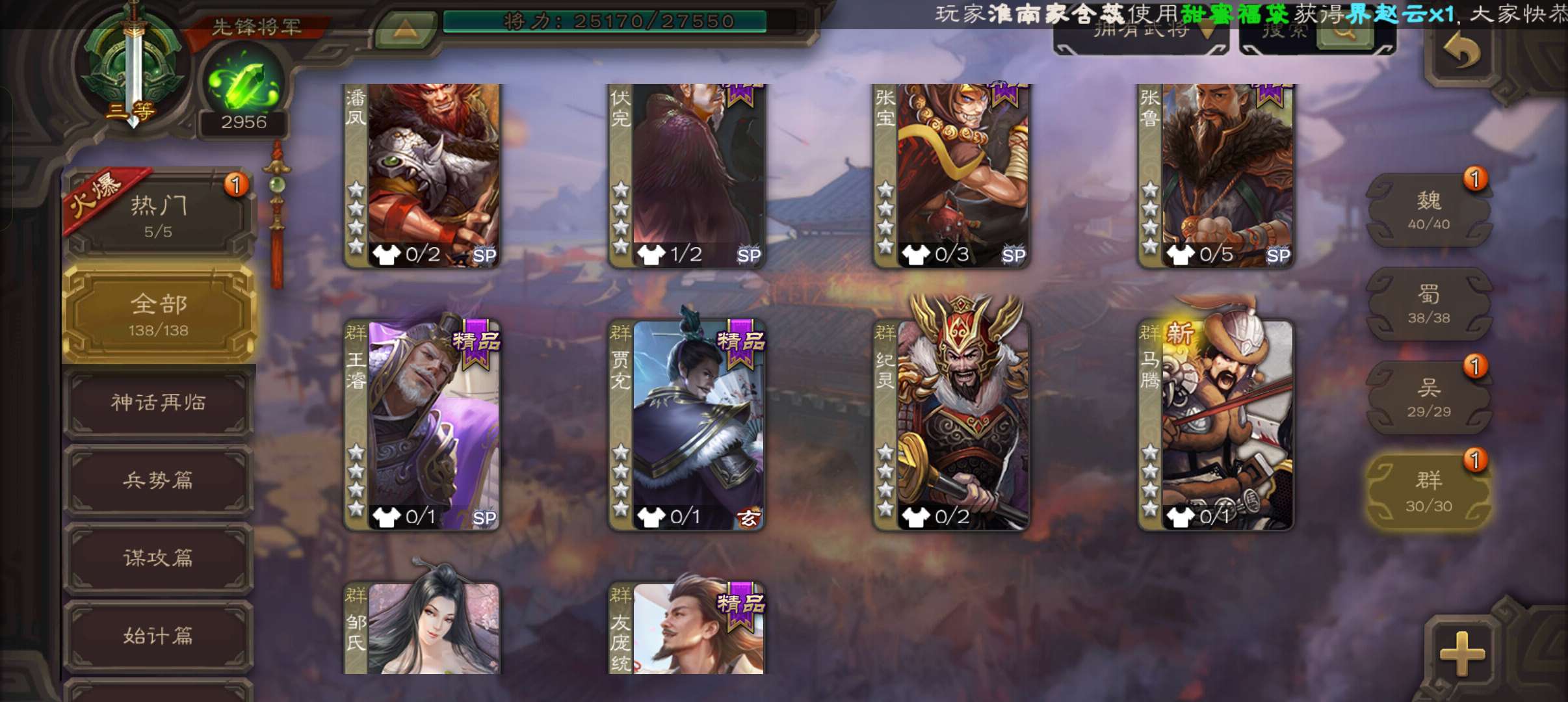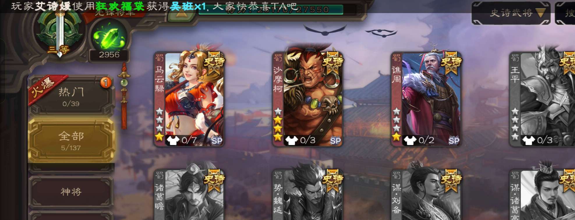 5史诗先锋,2950魂4.8万羽毛4.7万豆,界钟会沙摩柯神张辽谯周马云騄,动曹冲霍峻谋卢植138将