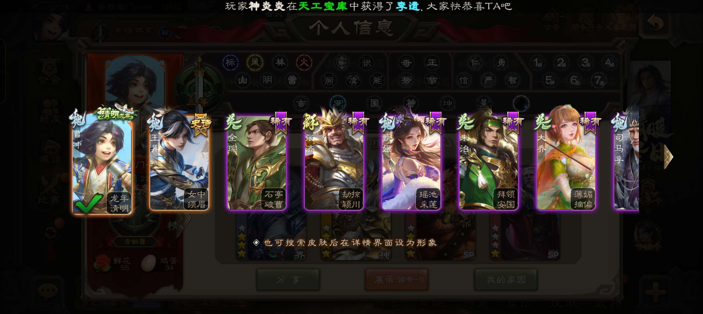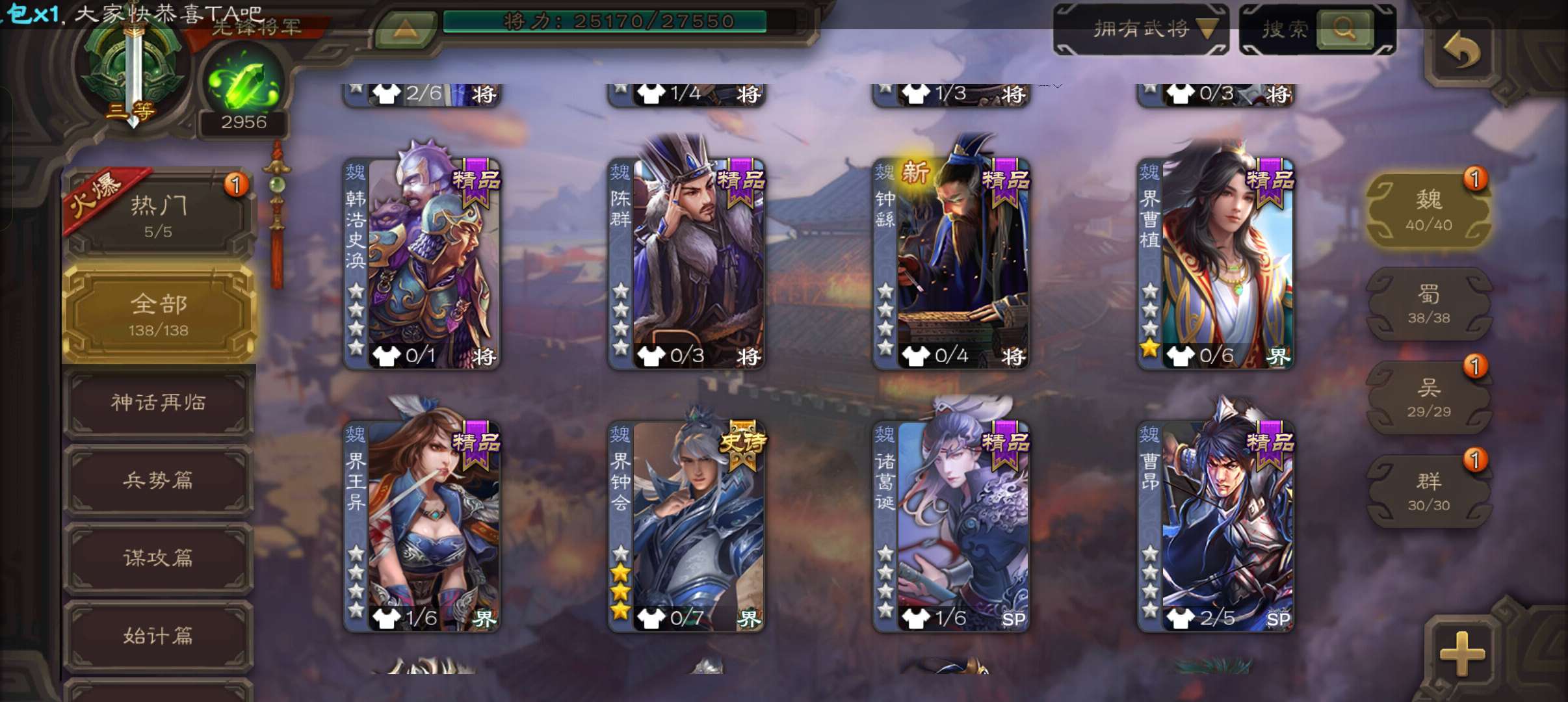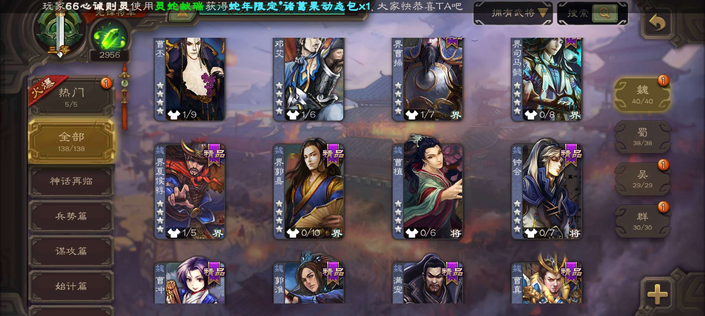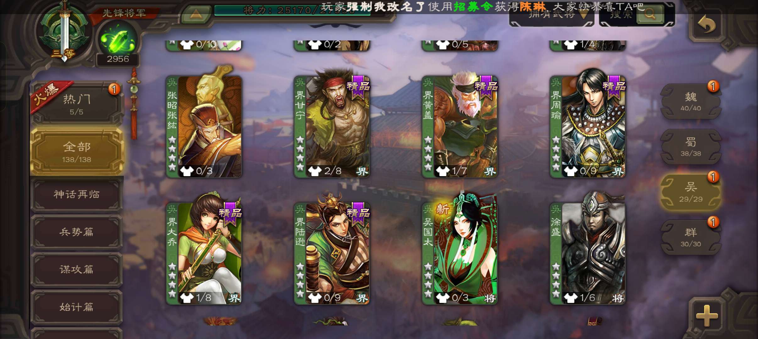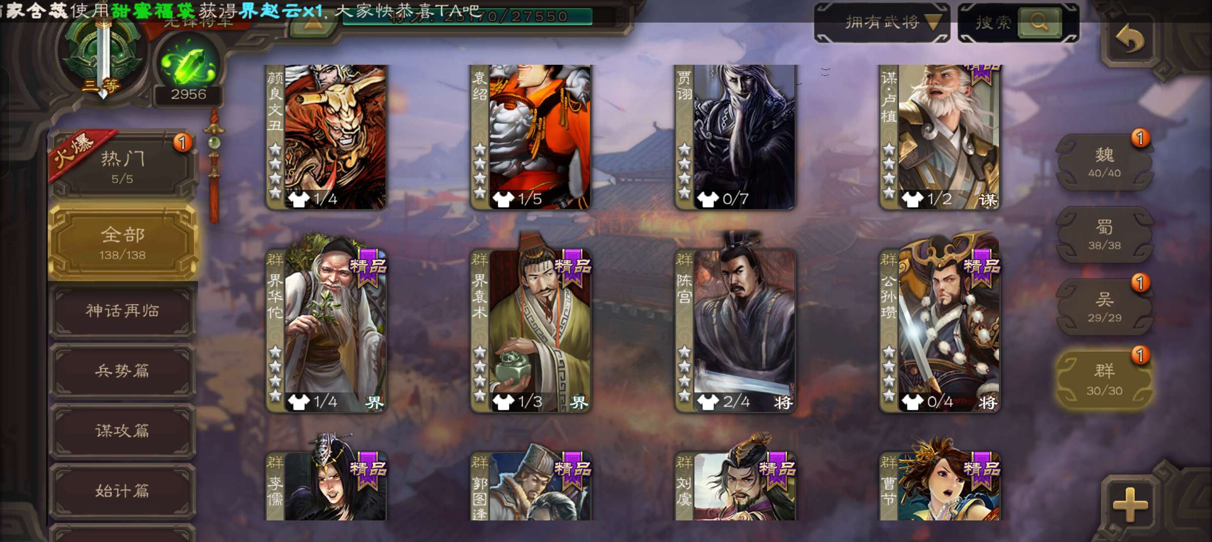 5史诗先锋,2950魂4.8万羽毛4.7万豆,界钟会沙摩柯神张辽谯周马云騄,动曹冲霍峻谋卢植138将