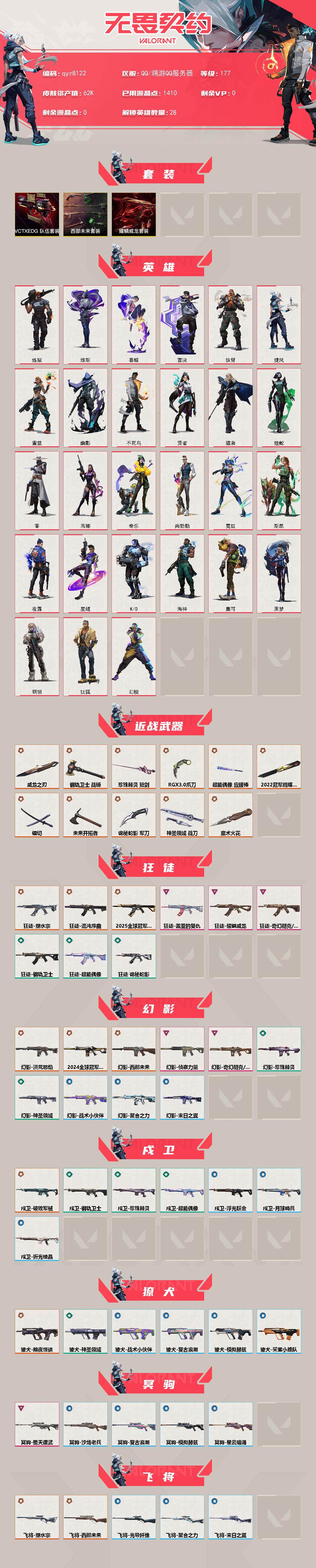 【qyz8122】2025冠军狂徒 侦查幻影 22蝴蝶刀 显卡爪刀 全息判官 盖亚狂徒 西部未来套装 镭切 破败戍卫 塑水宗狂徒 显卡莽侠 黯夜怪谈獠犬 起源雄鹿 EDG标配 混沌短炮 混沌狂徒 24冠军狂徒 qyz8122 亮点皮肤: 幻影-2024全球冠军赛,蝴蝶刀-2022全球冠军赛 套装: 耀鳞威龙套装,VCTCN2025套装,西部未来 近战武器皮肤: 威龙之刃,短剑-珍珠棘贝,超能偶像 应援棒,爪刀-RGX 11z Pro 3.0,战锤-钢轨卫士,镭切,神圣领域 战刀,未来开