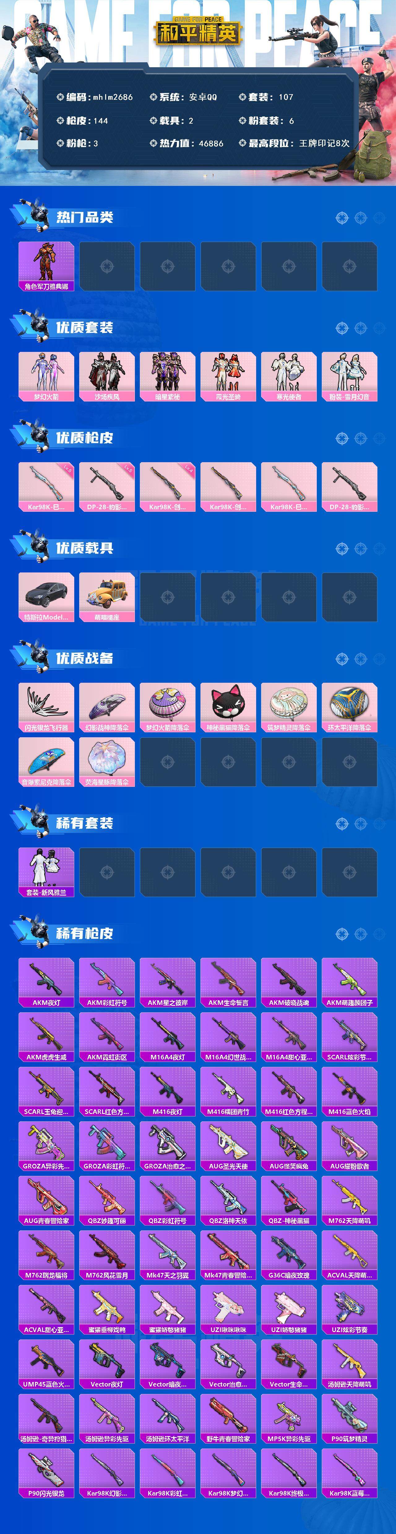 【mhlm2686】安卓 手Q-6粉装-3特效枪-2载具-1粉色飞行器-46886热力值-8王牌印记-107套装-144枪皮