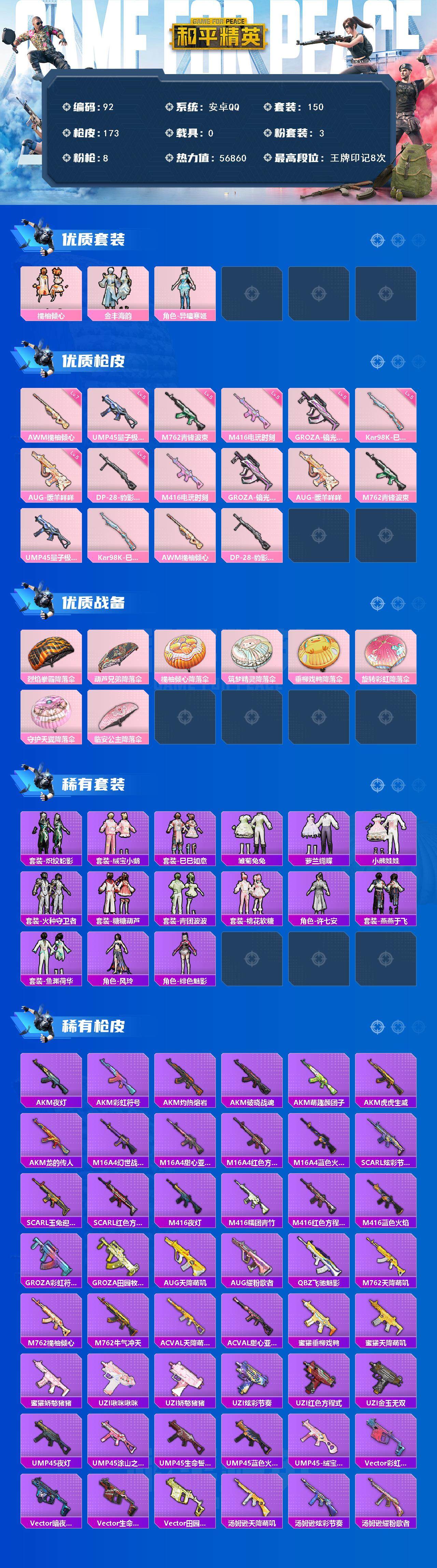 安卓 手Q-3粉装-8特效枪-0载具-0粉色飞行器-56860热力值-8王牌印记-150套装-173枪皮