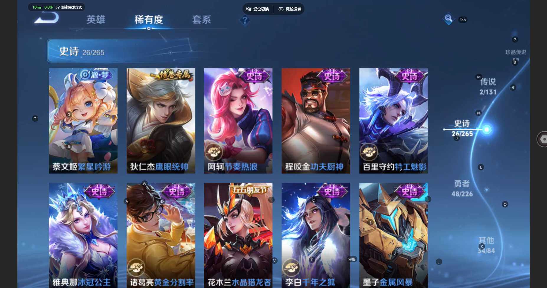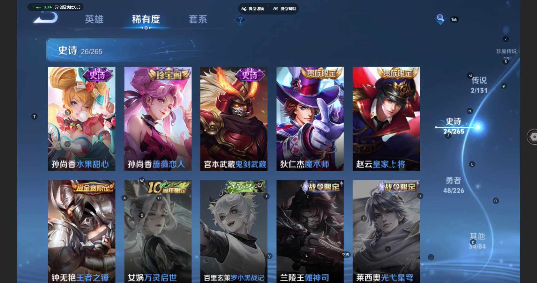【限定皮肤】:狄仁杰阴阳师,赵云皇家上将,孙尚香蔷薇恋人,钟无艳王者之锤,芈月重明,吕布猎兽之王,元歌云间偶戏,曹操烛龙,典韦穷奇,狄仁杰魔术师,狄仁杰万华元夜,达摩沙漠行僧,项羽海滩派对,老夫子醍醐杖,程咬金演武夺筹,韩信飞衡,亚瑟潮玩骑士王,牛魔御旌,钟馗驱傩正仪,雅典娜黎