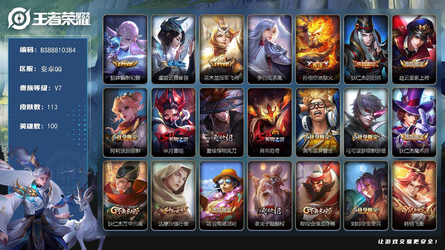 安卓Q-V7-秩序白银I段位-100英雄-113皮肤-0典藏-0珍品无双-0无双-0珍品传说-5传说-26史诗
